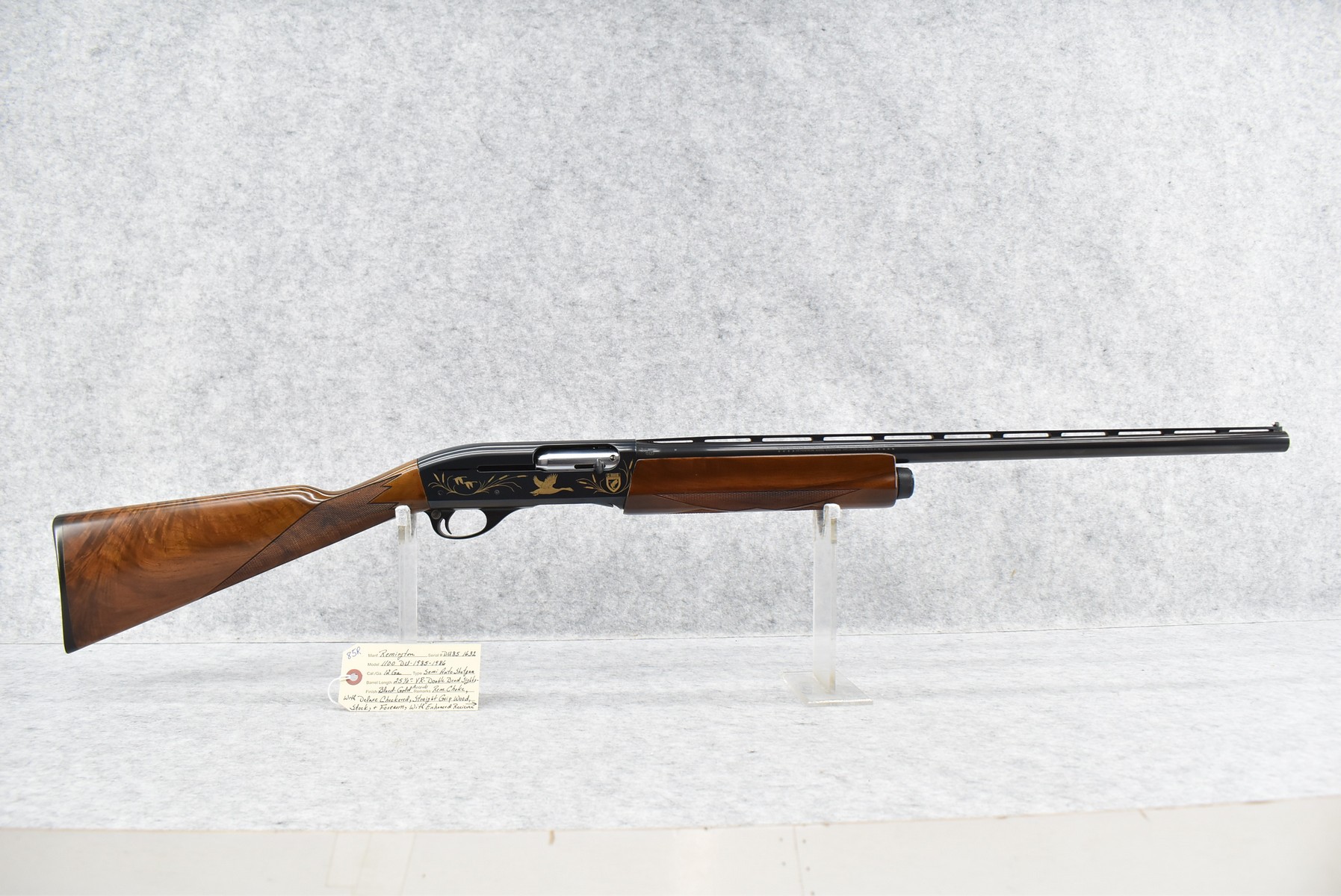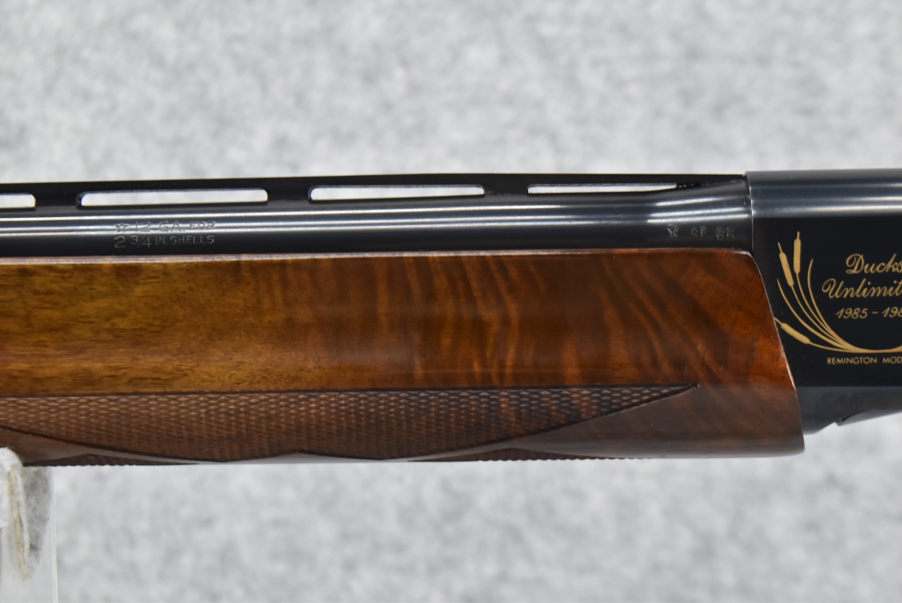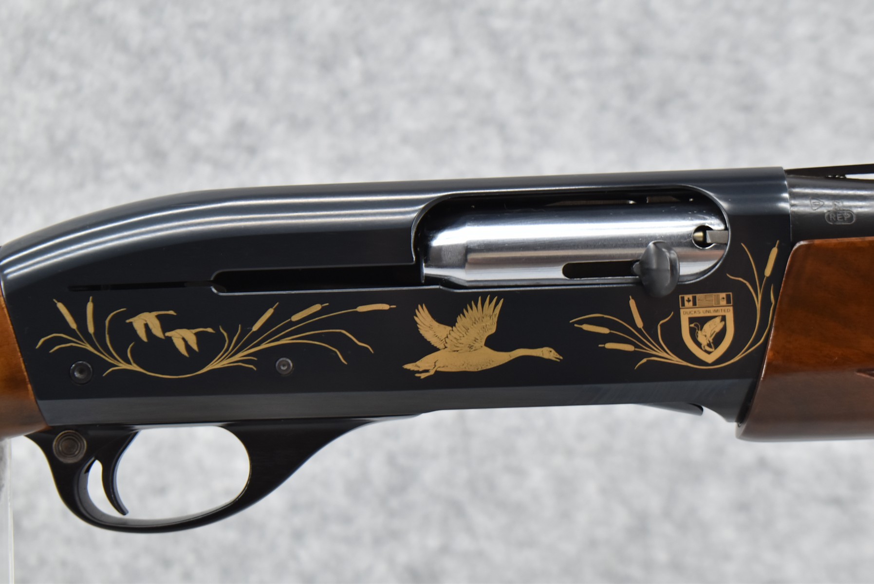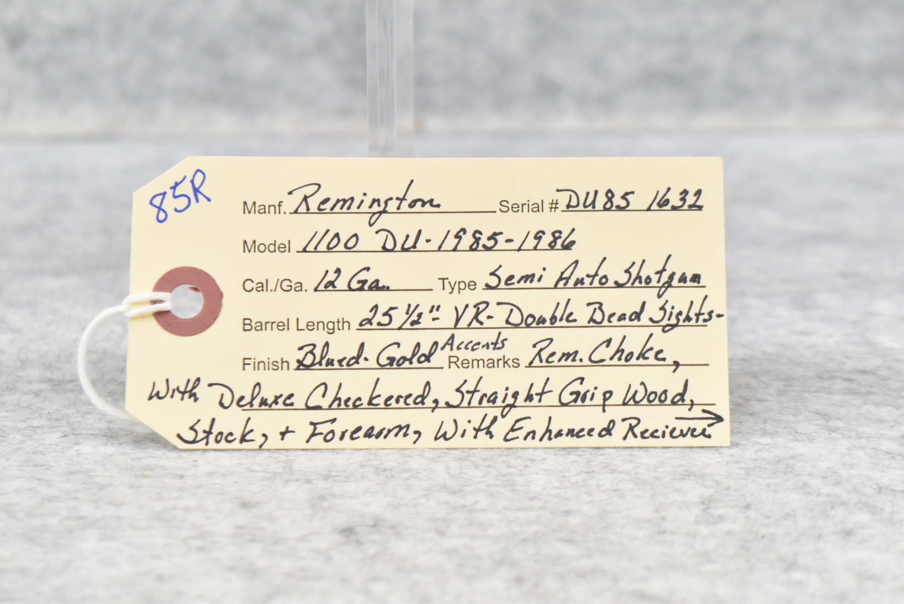 85R. Remington – Mod. 1100 DU 1985 Gun of the Year – 12ga. Semi-Auto Shotgun – w/25 ½” Rem. Choke, Vent-Rib Barrel w/Double Bead Sights – Blued Finish w/Gold Accents – w/Enhanced Receiver on Both Sides w/Gold Accented Wild Fowl Scenes & DU Emblems – w/Deluxe Checkered Straight Grip Wood Stocks – w/Factory Hard Case – Only a Total of 4,500 Mfg. in 1985