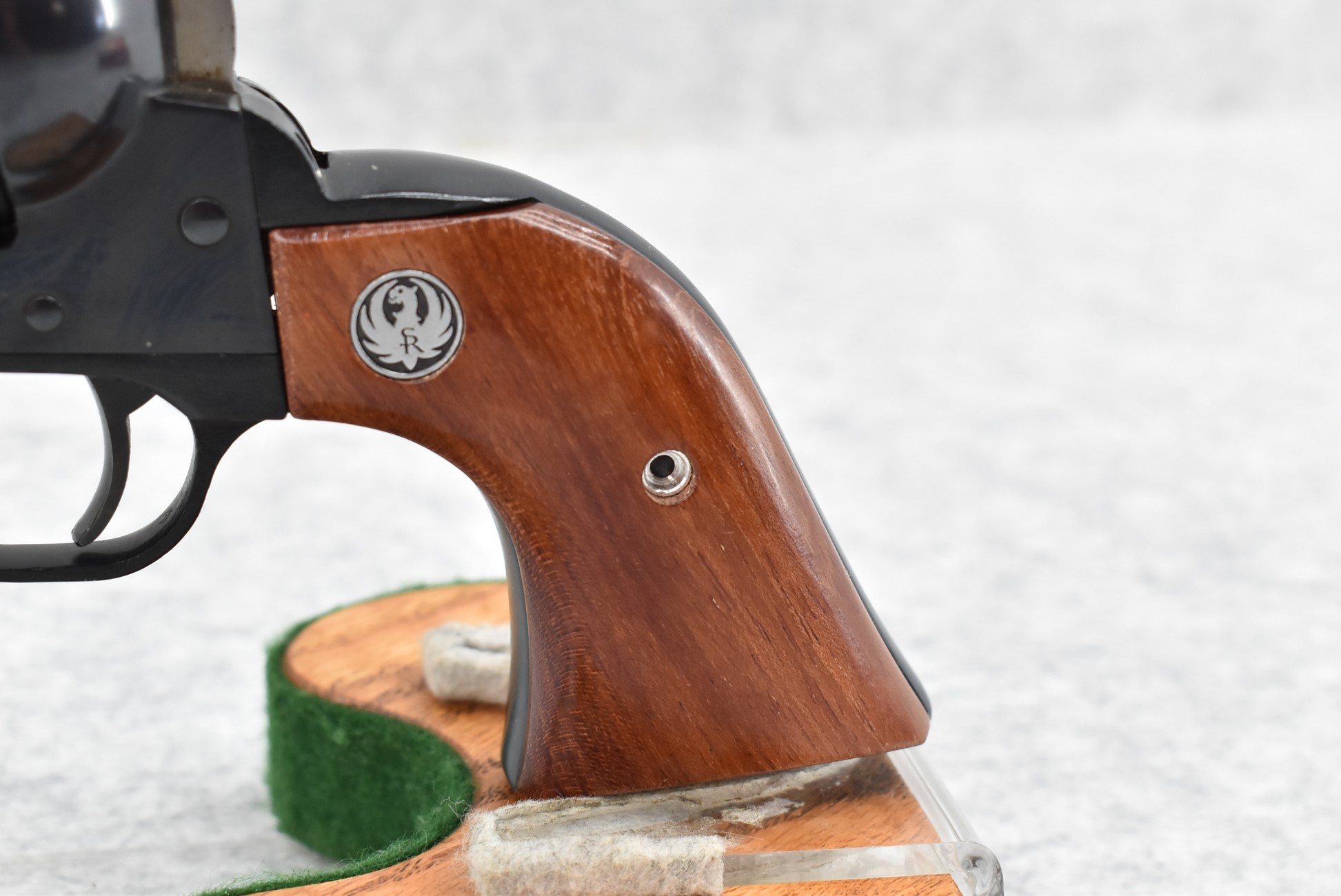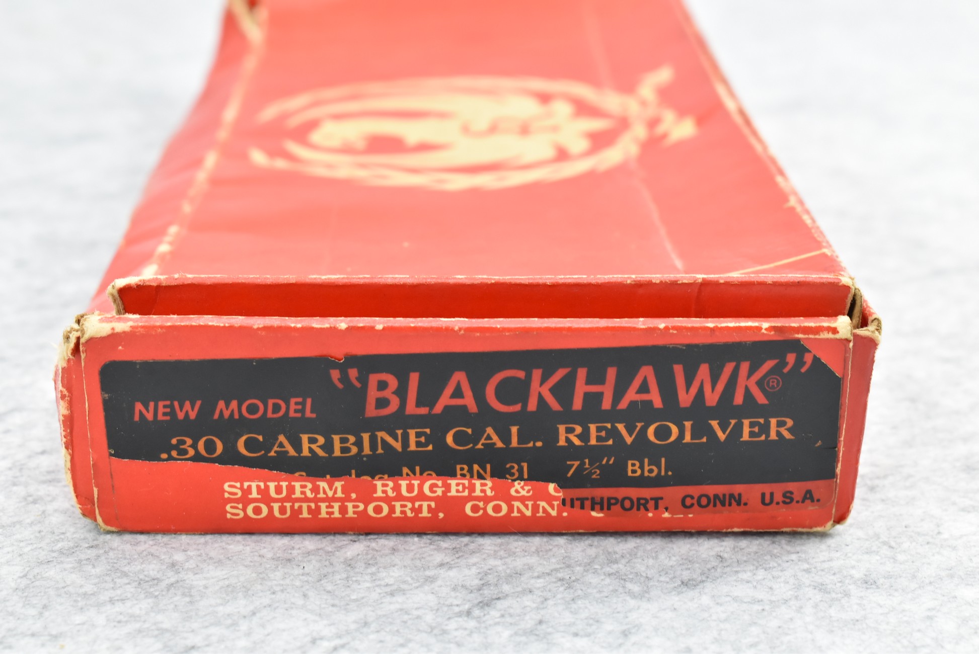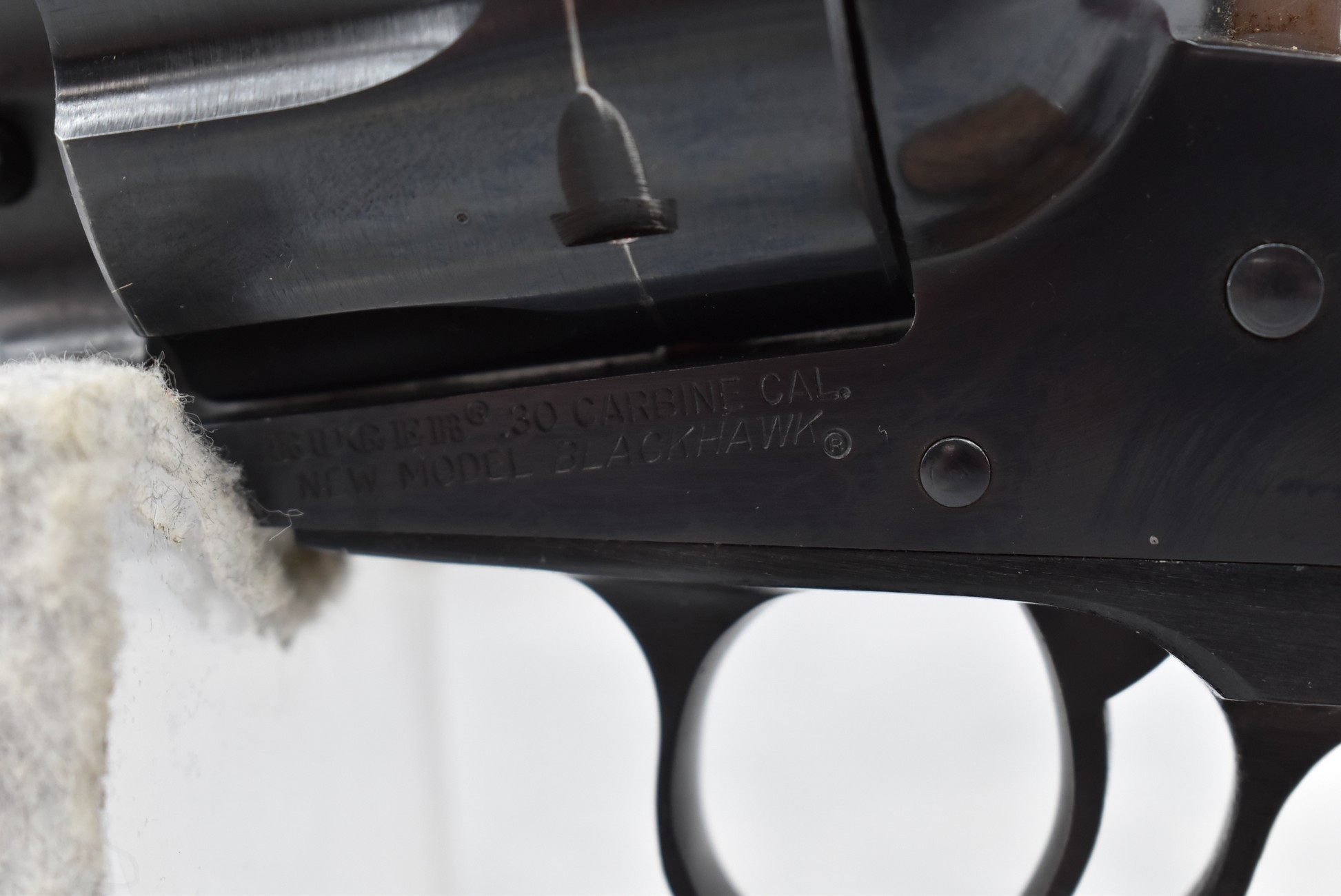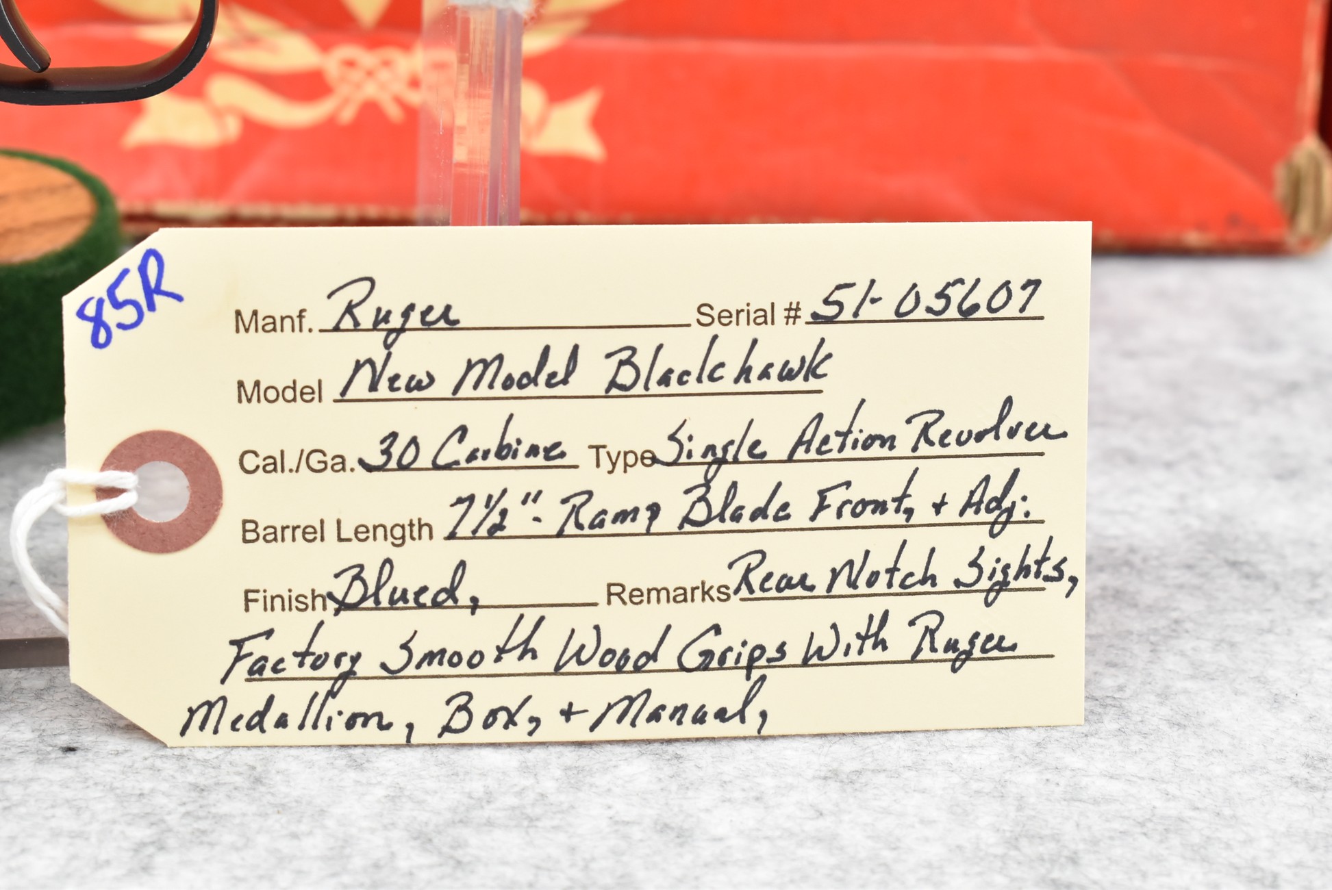 85R. Ruger – New Model Blackhawk – 30 Carbine Cal. Single Action Revolver – w/7 ½” Barrel w/Ramp Blade Front & Adj. Rear Notch Sights – Blued Finish – w/Factory Smooth Wood Grips w/Ruger Medallion – w/Box & Manual