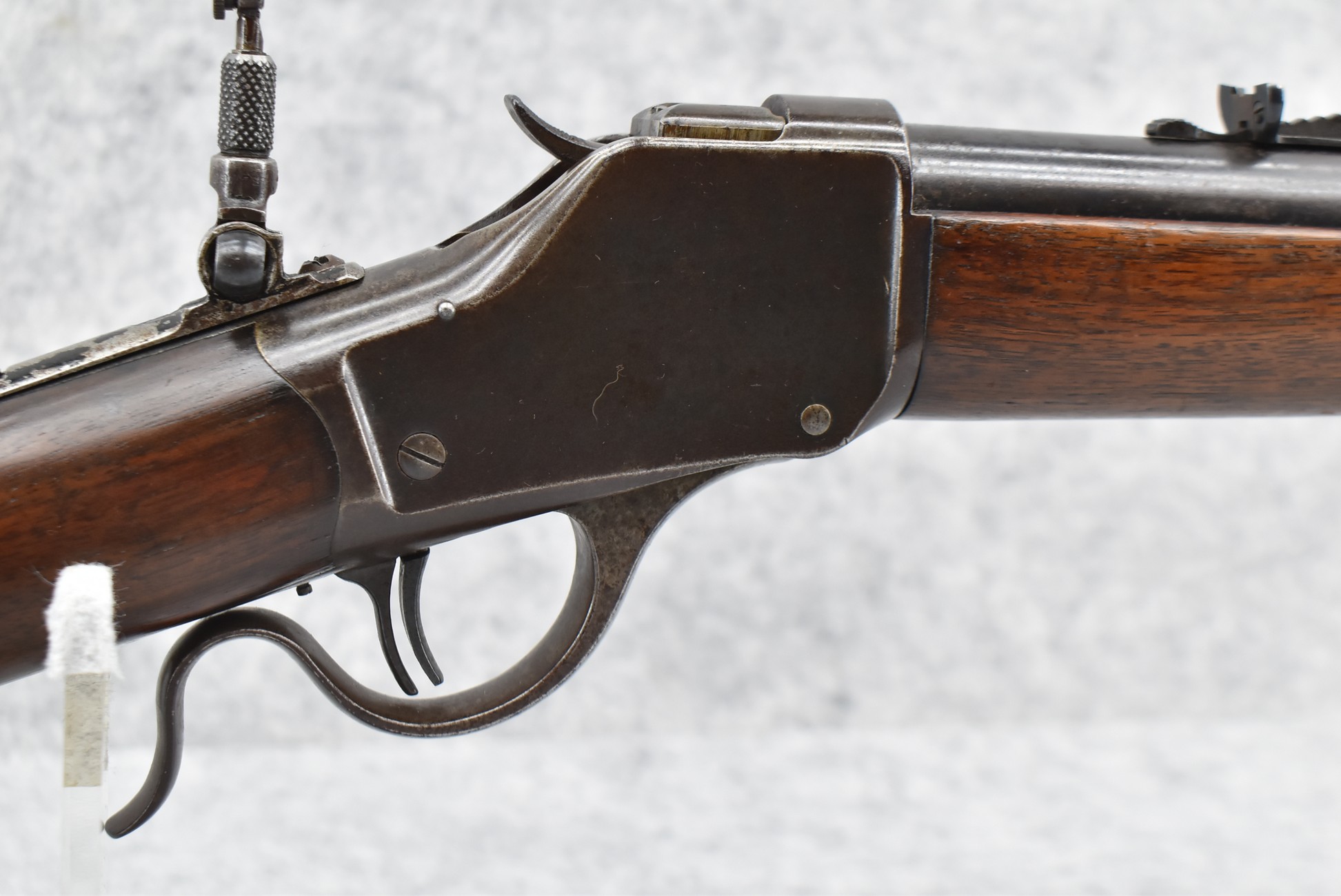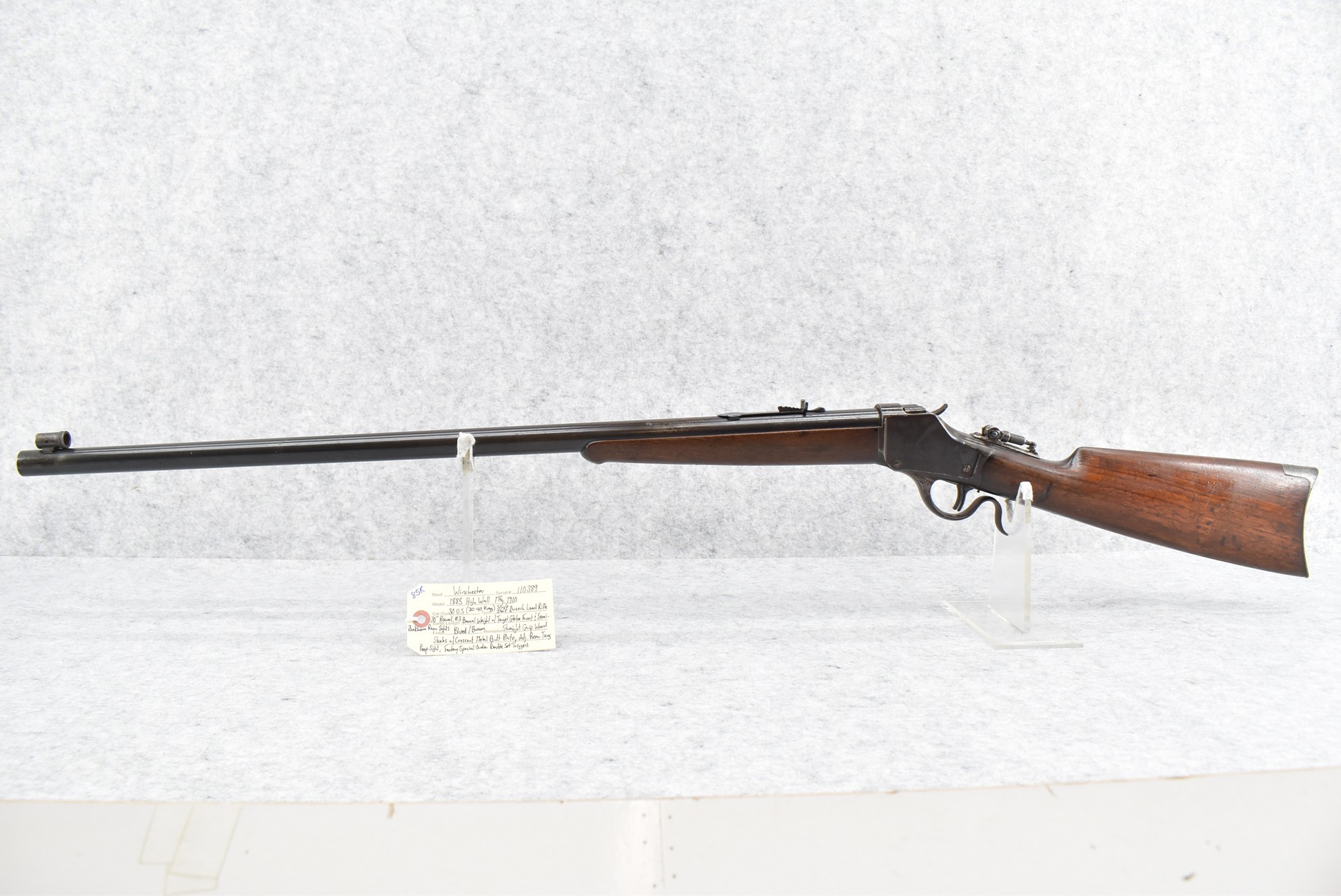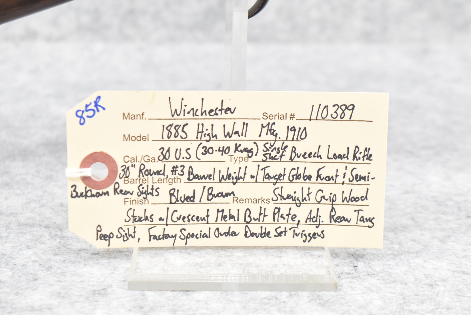 85R. Winchester – Mod. 1885 High Wall – 30 U.S. (30-40 Krag) Cal. Single Shot Breech Load Rifle – w/30” Round Barrel w/#3 Barrel Weight w/Target Globe Front & Semi-Buckhorn Rear Sights – Blued/Brown Finish – w/Straight Grip Wood Stocks w/Crescent Metal Butt Plate – w/Adj. Rear Tang Peep Sight – w/Factory Special Order Double Set Triggers – Mfg. 1910