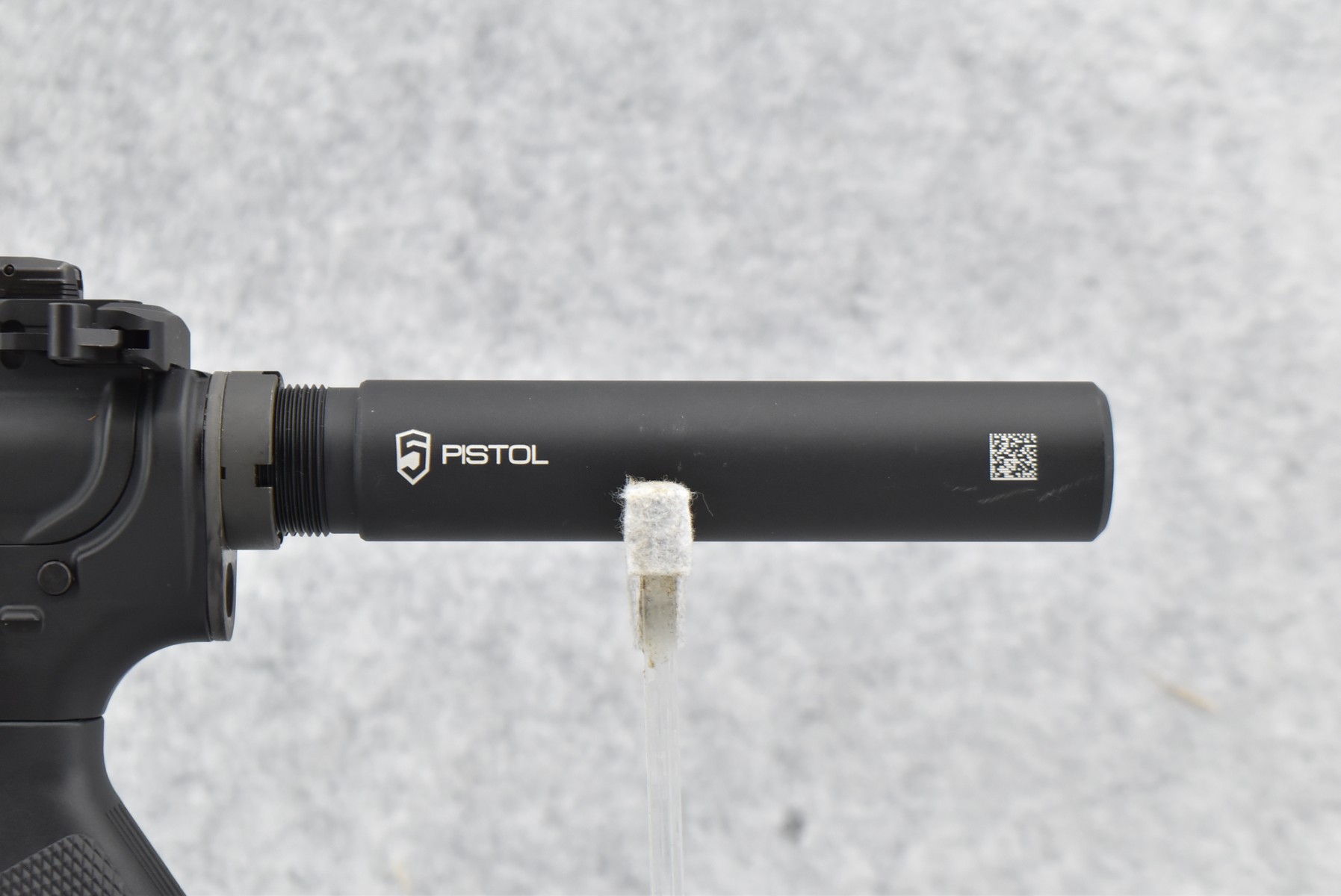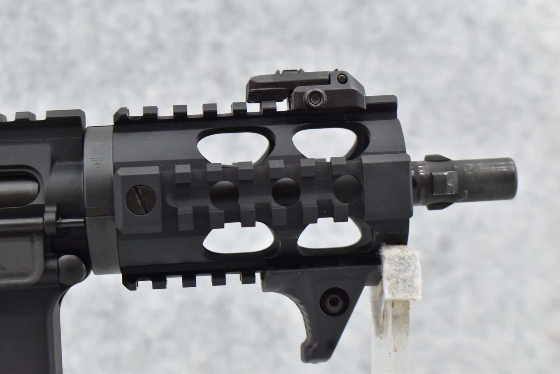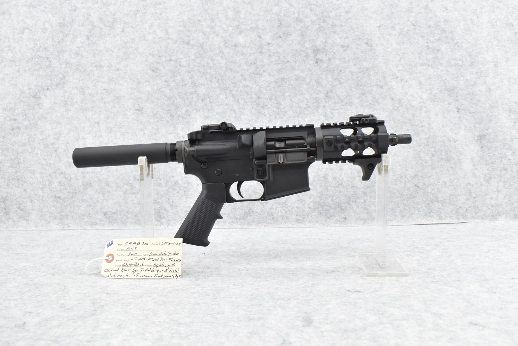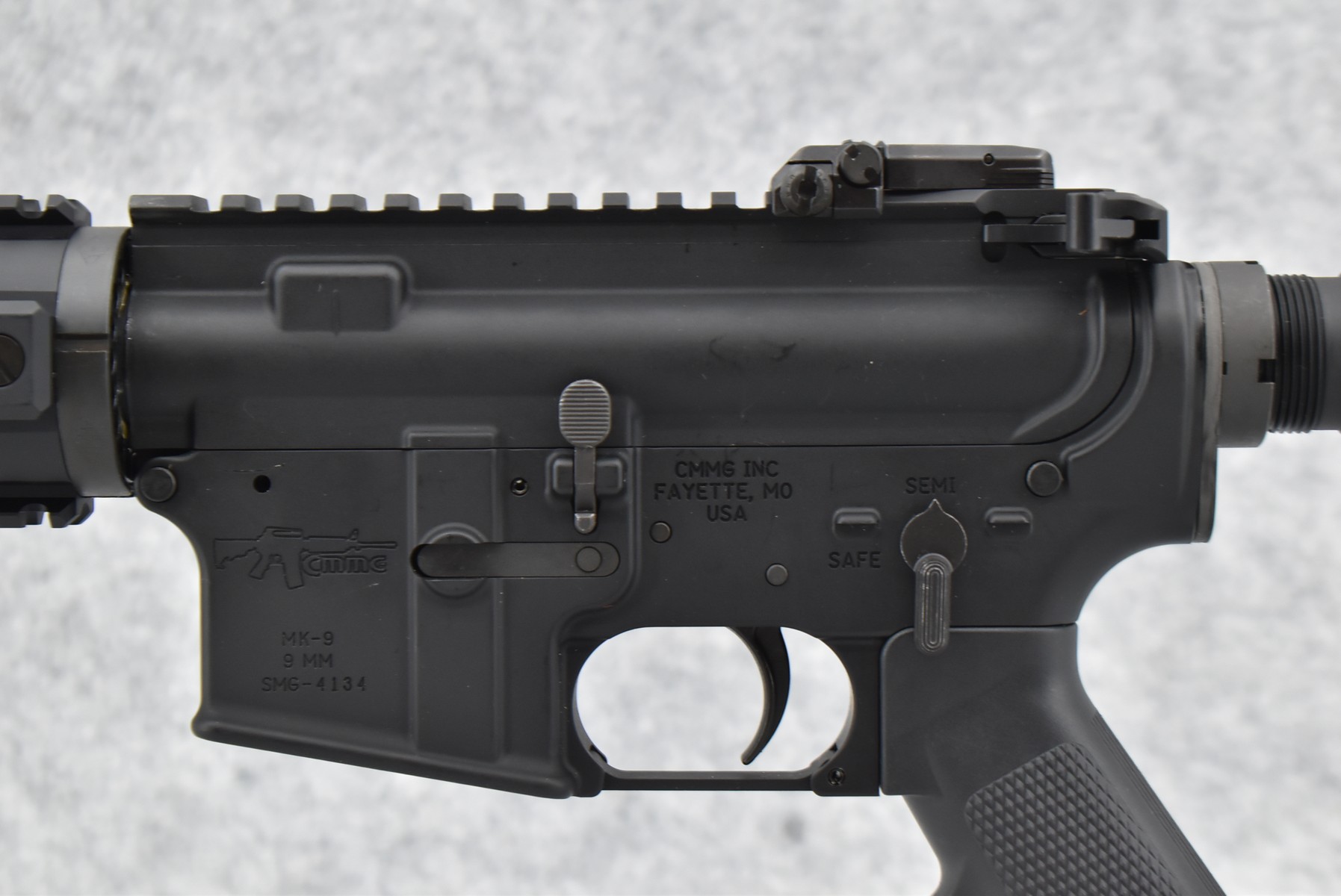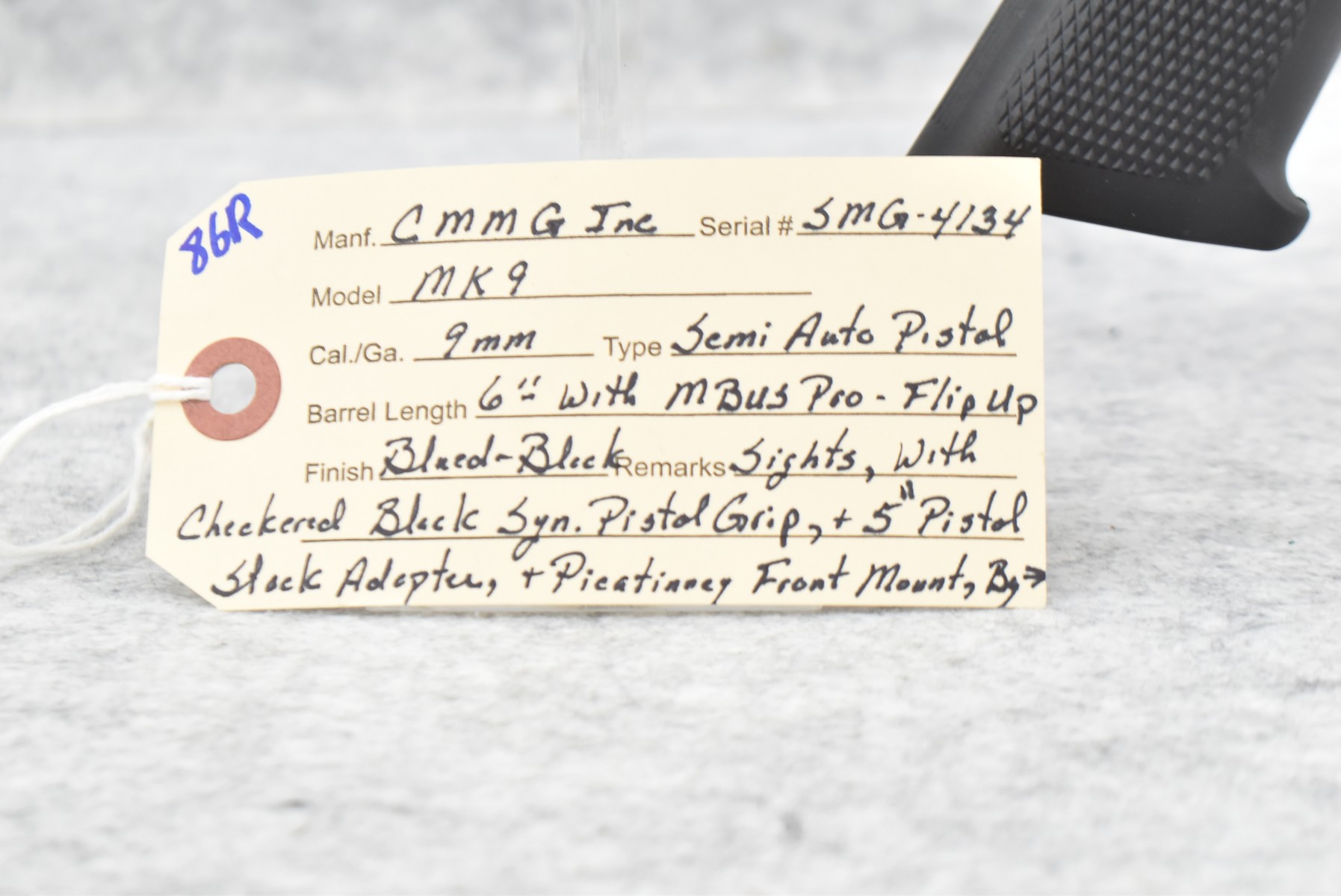 86R. CMMG Inc. – Mod. MK9 – 9mm Cal. Semi-Auto Pistol – w/6” Barrel w/MBUS Pro Flip Up Sights – Blued/Black Finish – w/Checkered Black Synthetic Pistol Grip & 5” Pistol Stock Adapter – w/Picatinny Front Mount by MagPul – No Mag