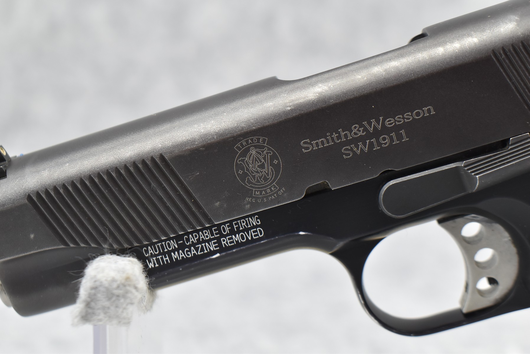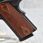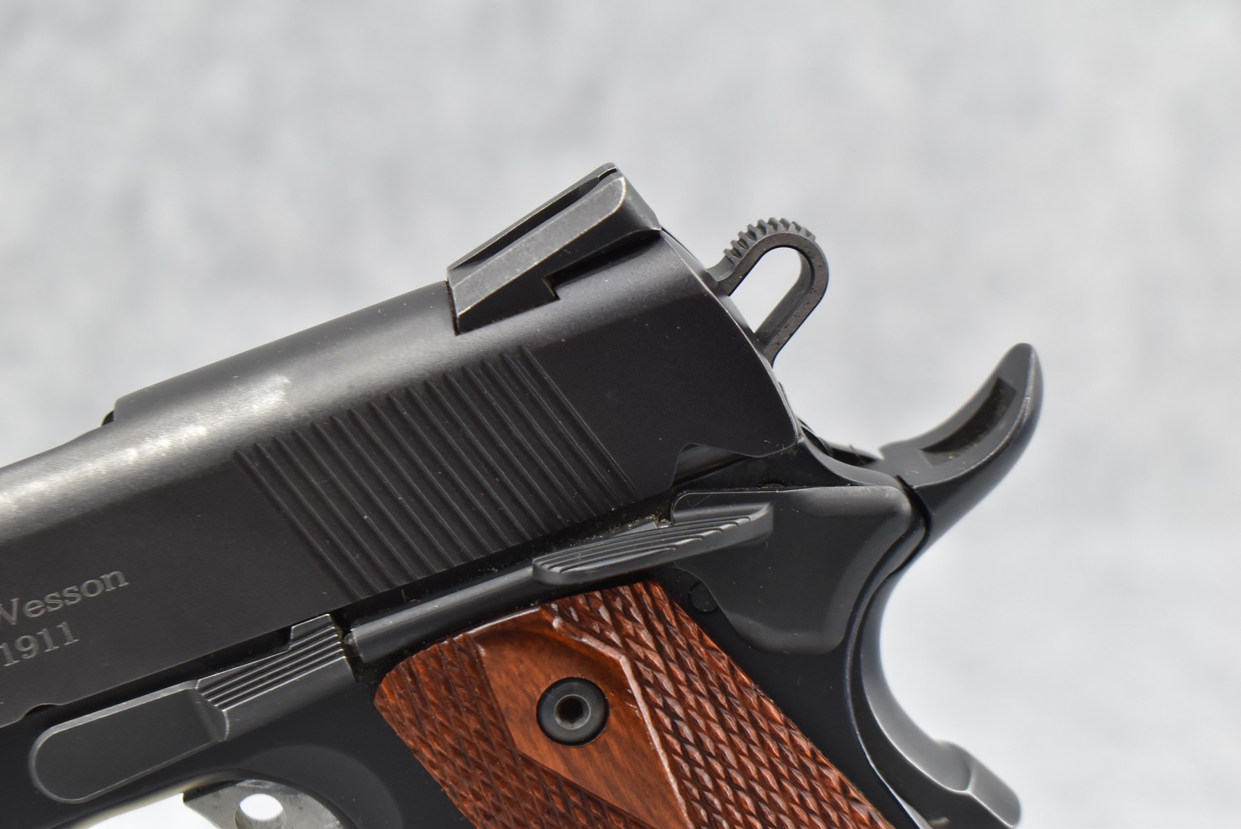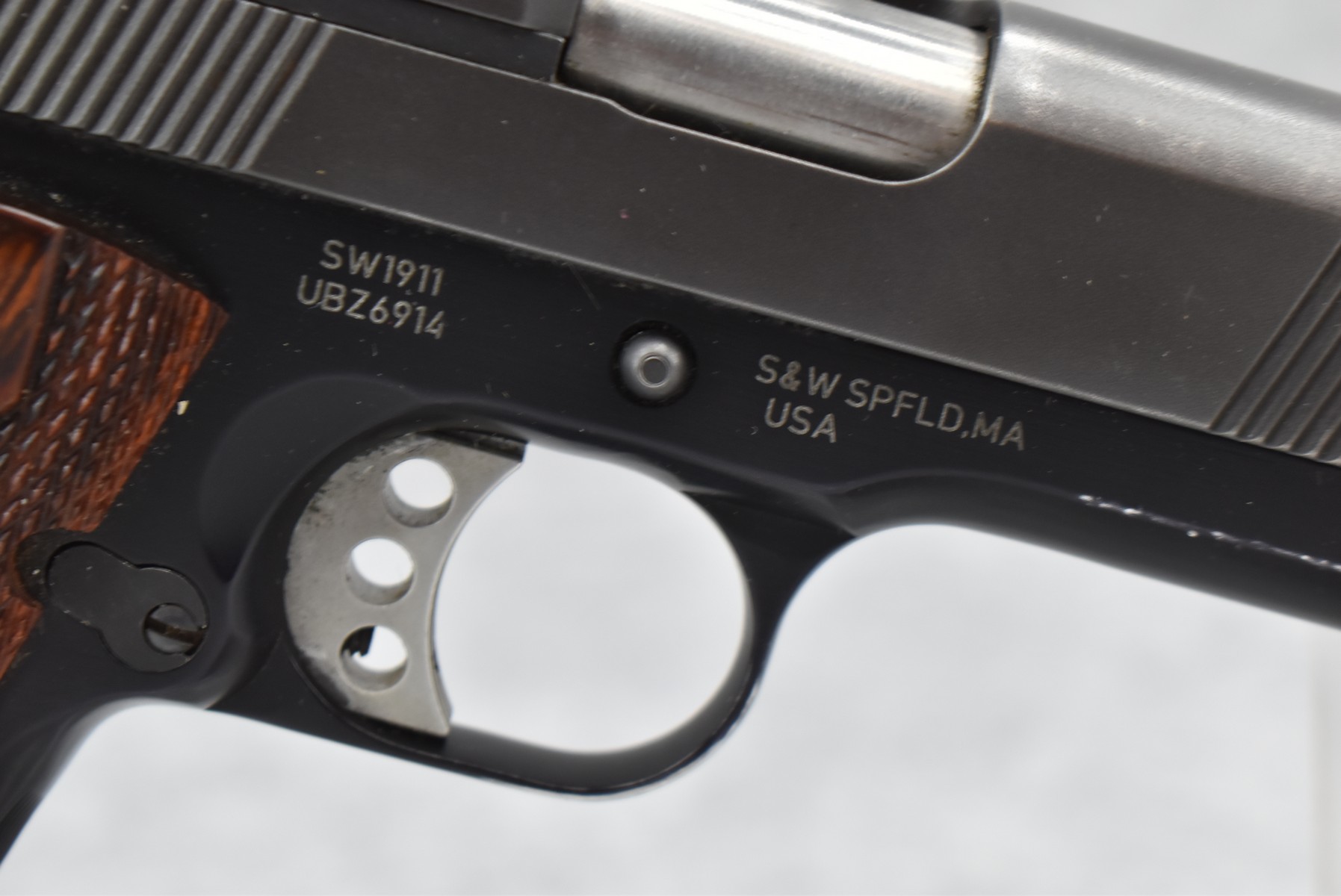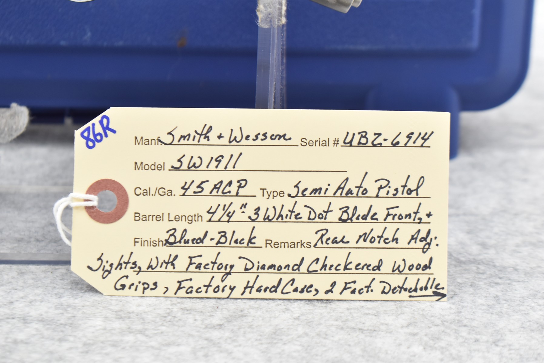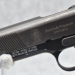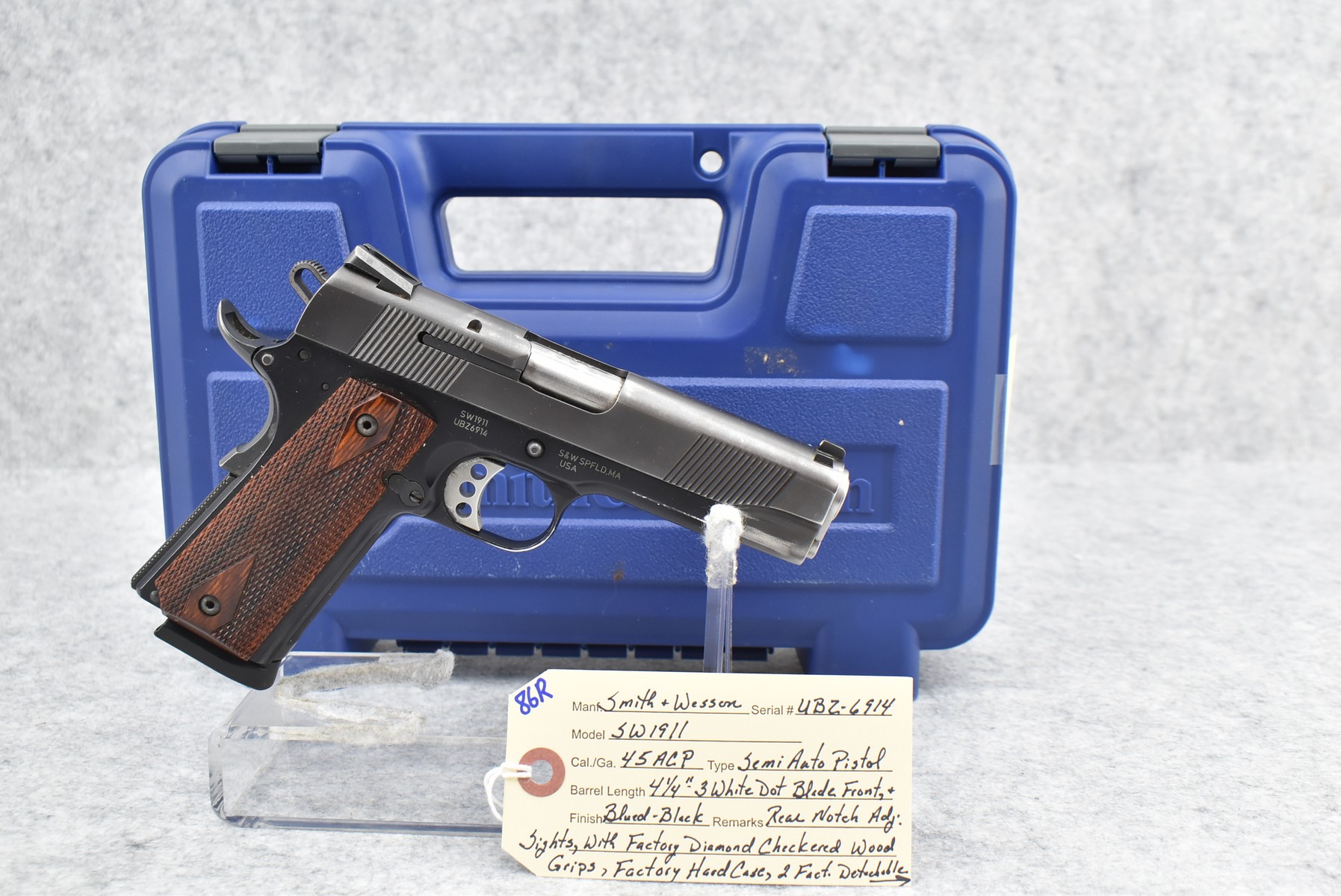 86R. Smith & Wesson – Mod. SW1911 – 45 ACP Cal. Semi-Auto Pistol – w/4 ¼” Barrel w/3 White Dot Blade Front & Rear Notch Adj. Sights – Blued/Black Two-Tone Finish – w/Factory Diamond Checkered Wood Grips – w/Factory Hard Case, 2 Factory Detachable Magazines & Manual