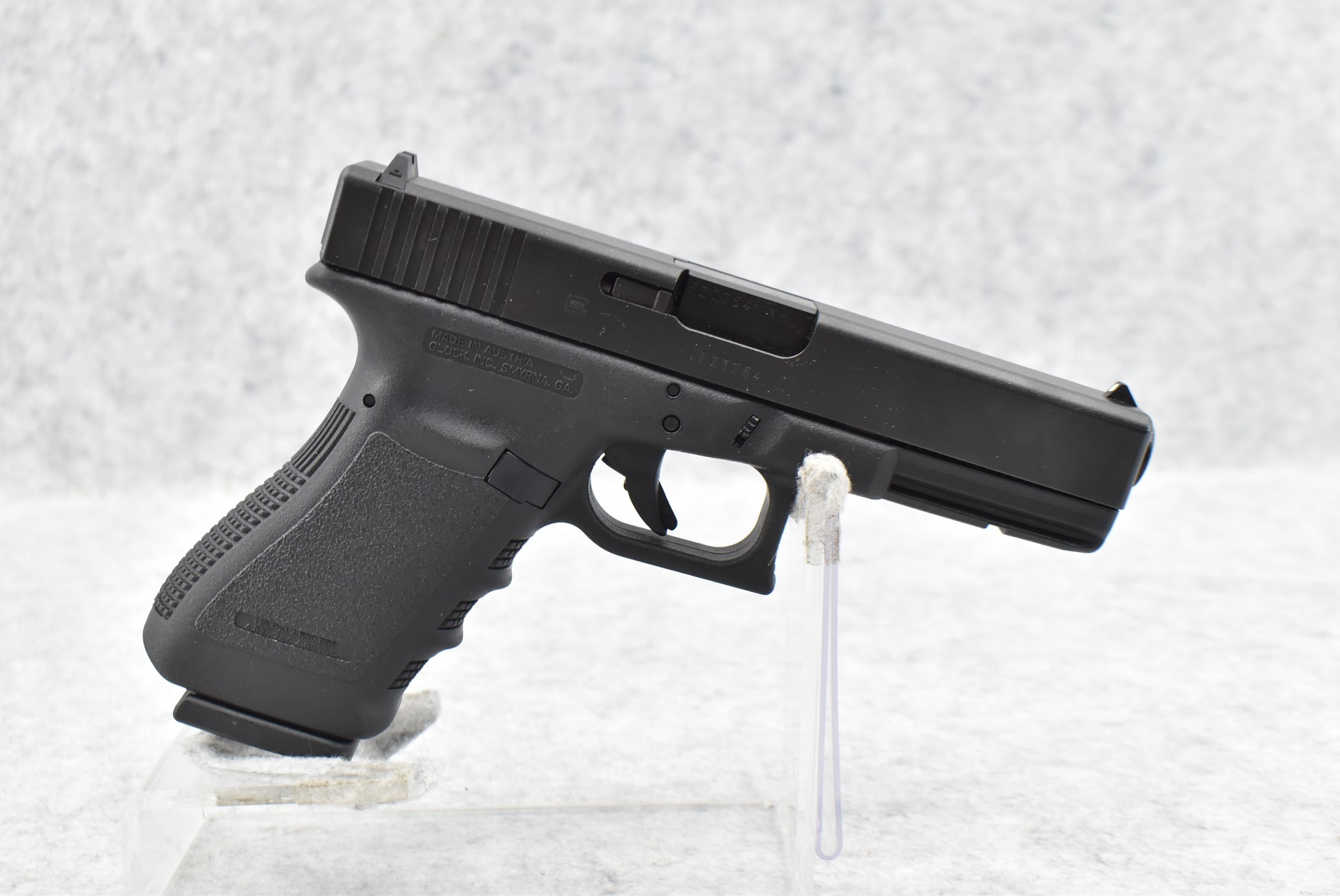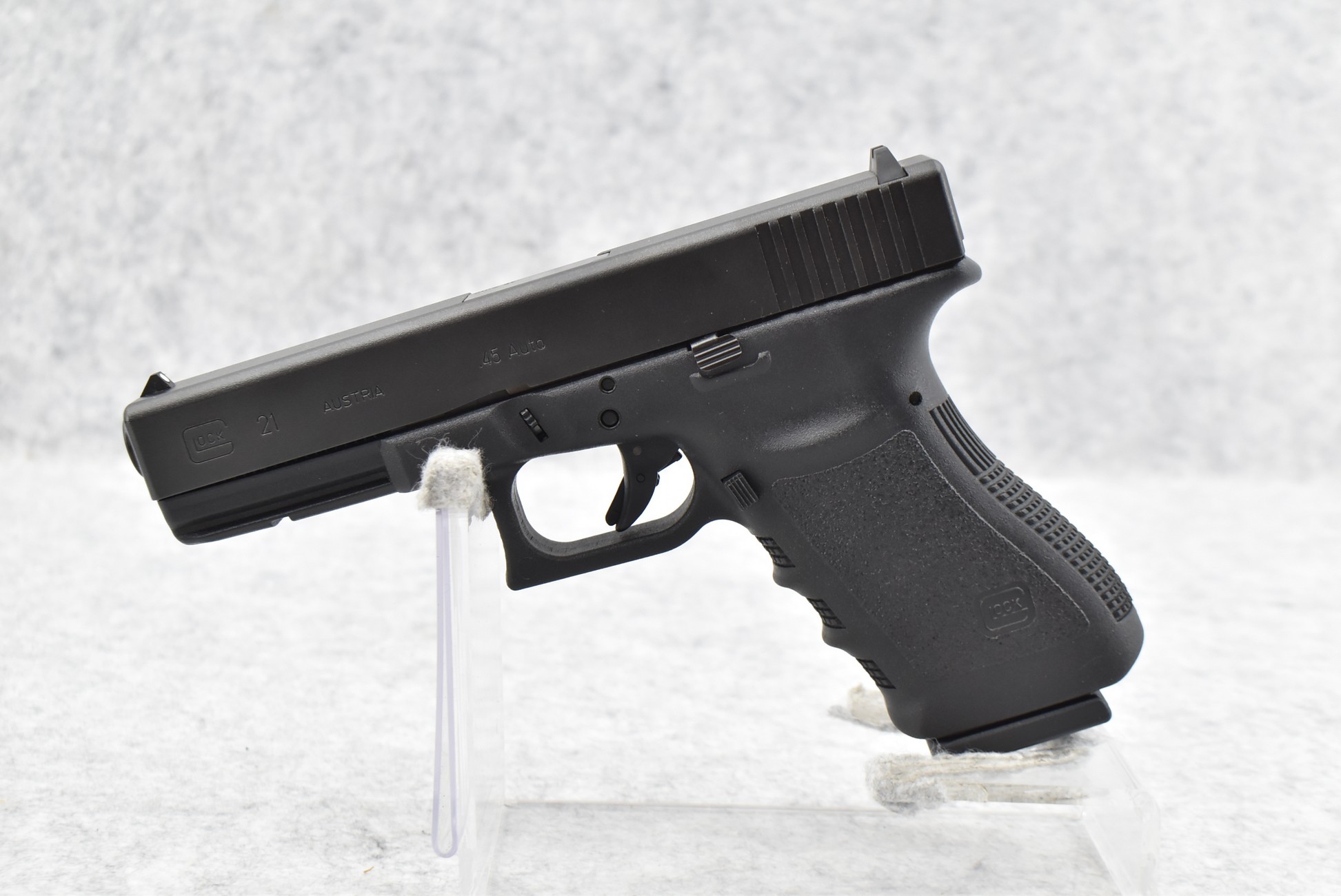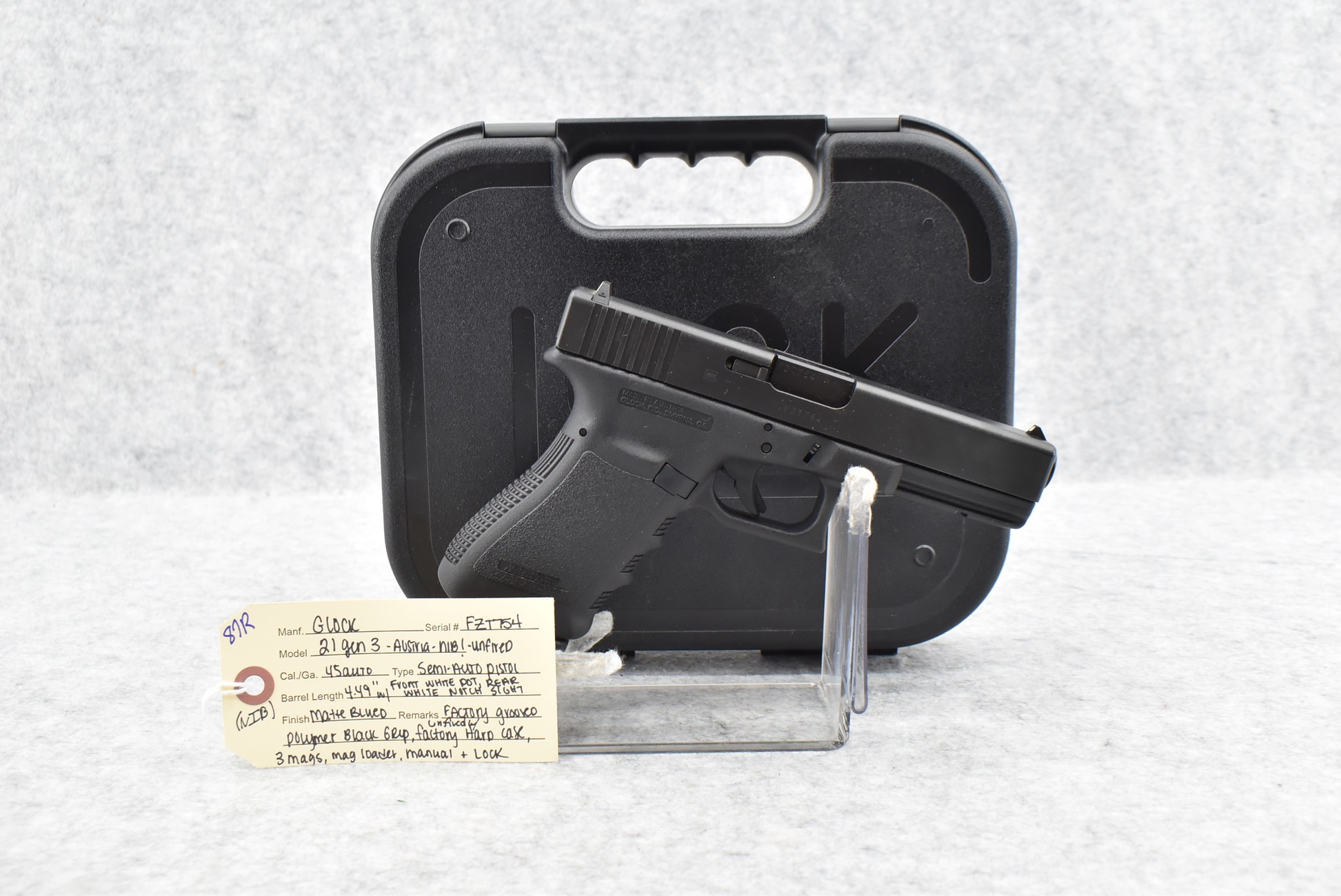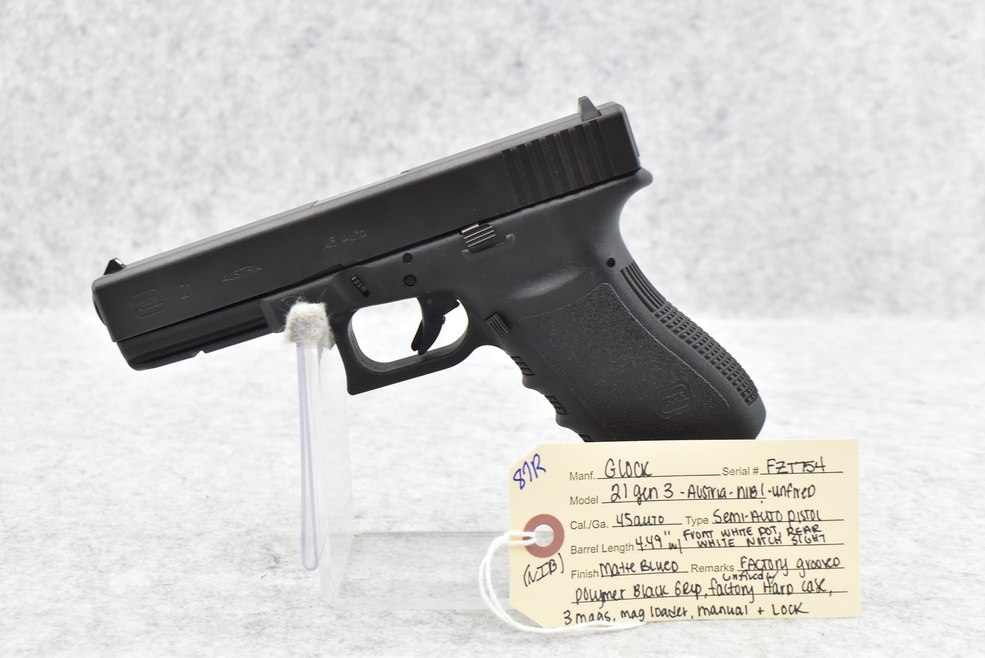 87R. Glock – Mod. 21 Gen 3 Austria – 45 Auto Cal. Semi-Auto Pistol – w/4½” Barrel w/White Dot Front and White Notch Rear Sights – Matte Blued Finish – w/Factory Grooved Polymer Black Grip – New in Factory Hard Case w/3 Magazines, Mag Loader, and Manual