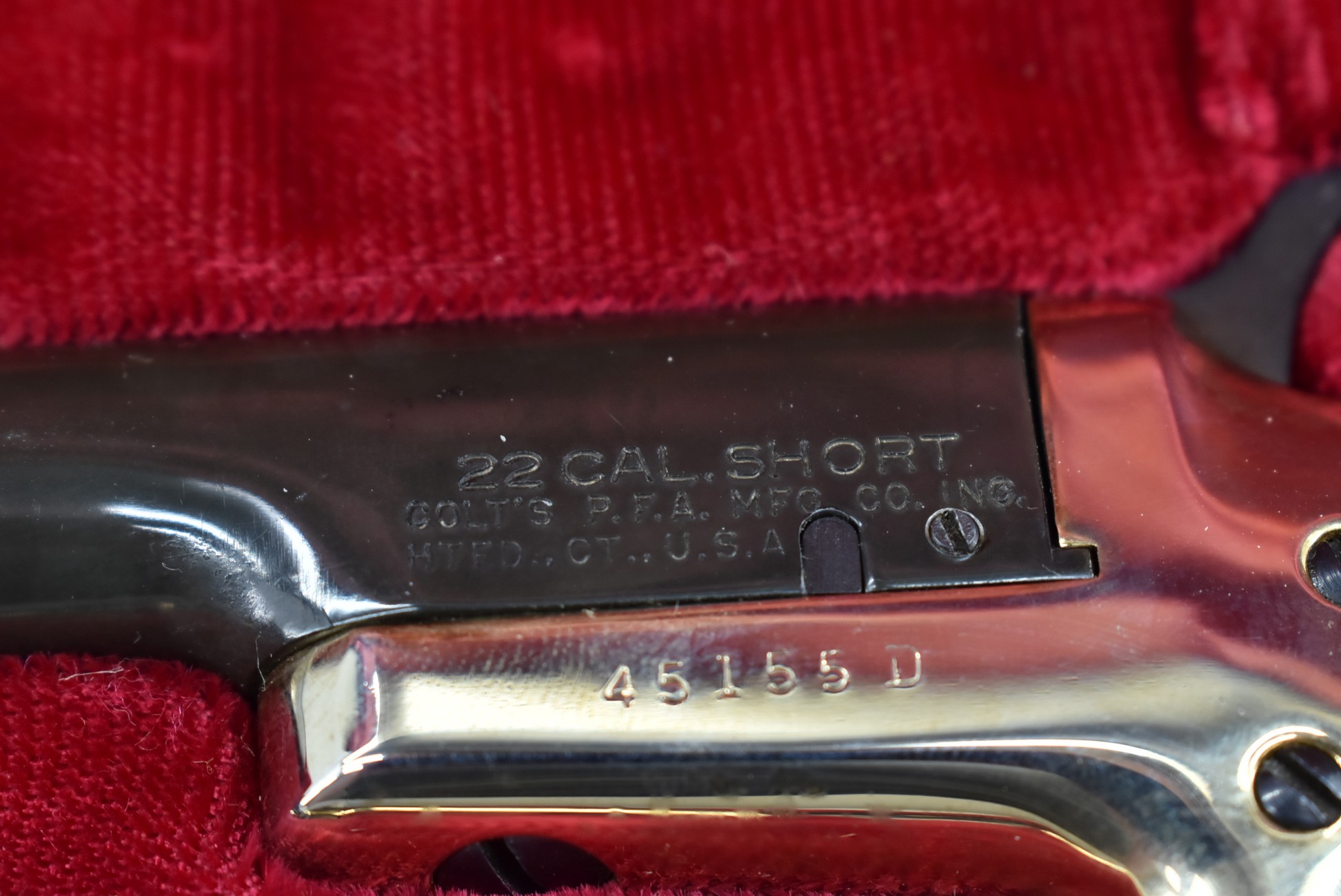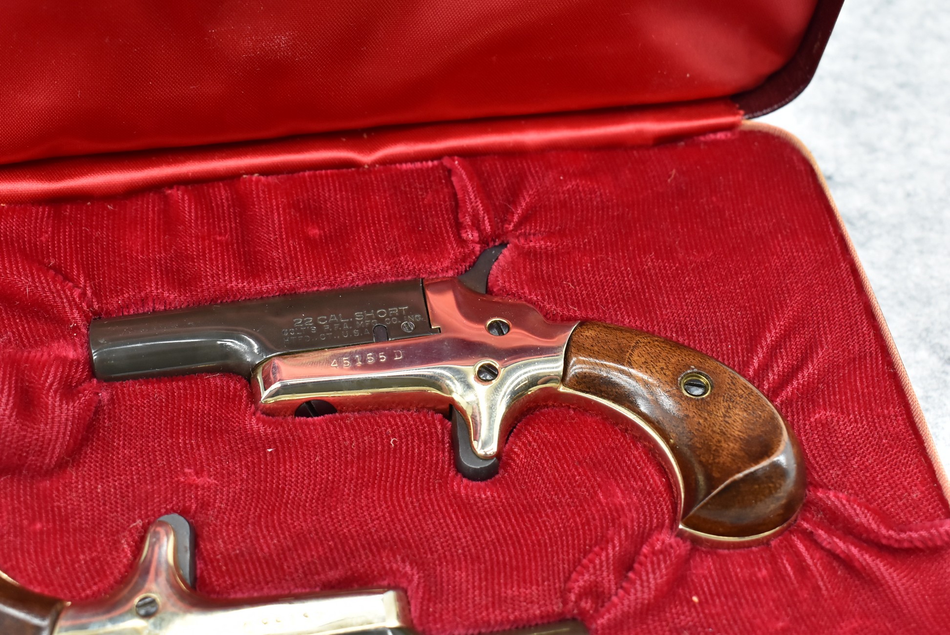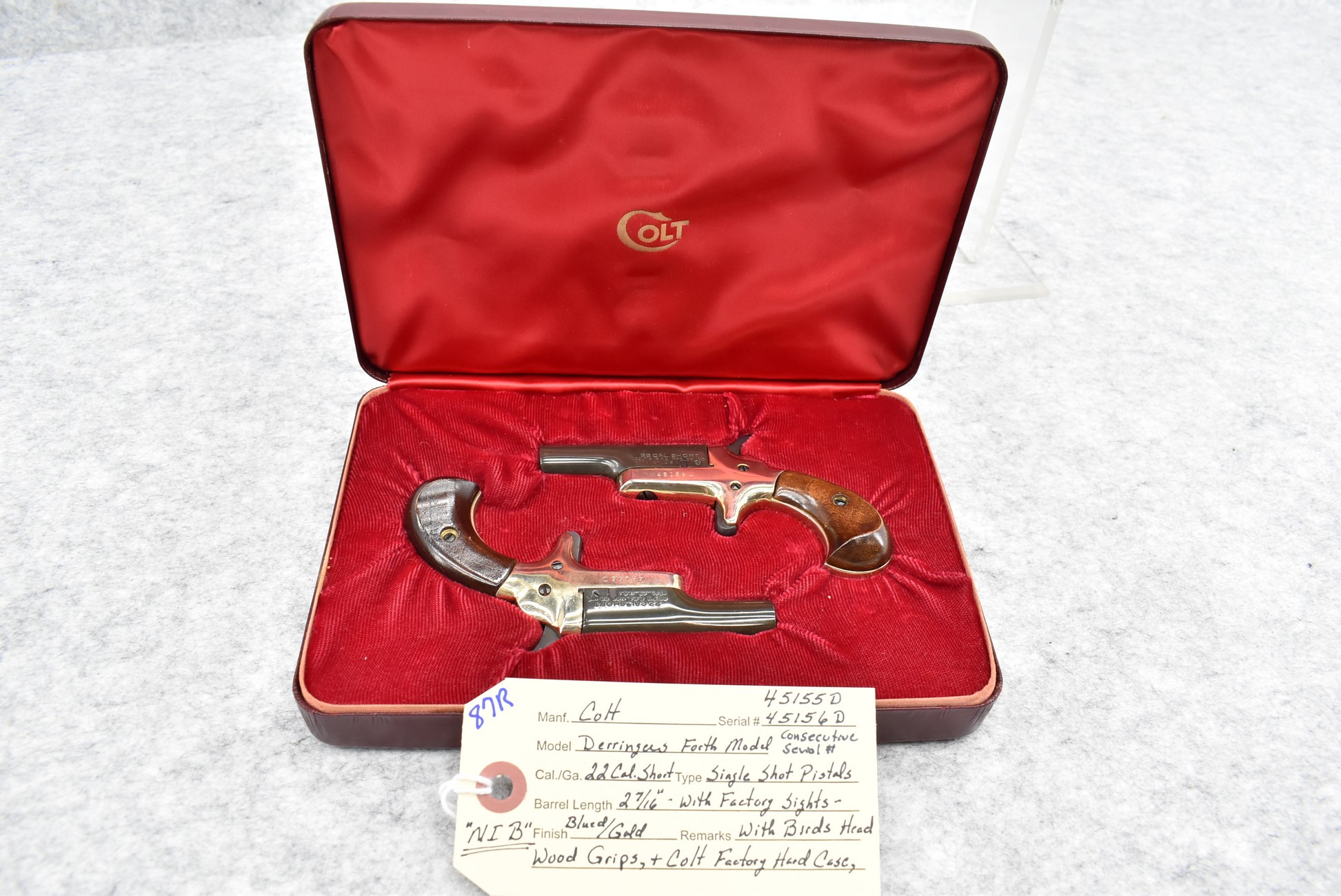 87R. Pair of Consecutive Serial Number Colts – Mod. Derringer Fourth Models – 22 Short Cal. Single Shot Pistols – Both w/2 7/16” Barrels w/Factory Sights – Both w/Blued/Gold Finishes – Both w/Birds Head Wood Grips – New in Colt Factory Hard Case (CANNOT GO TO MARYLAND!)