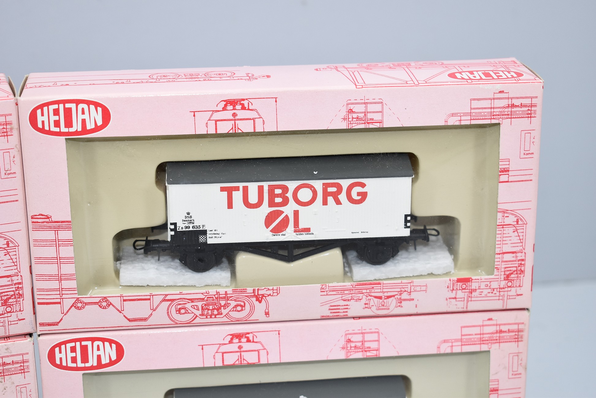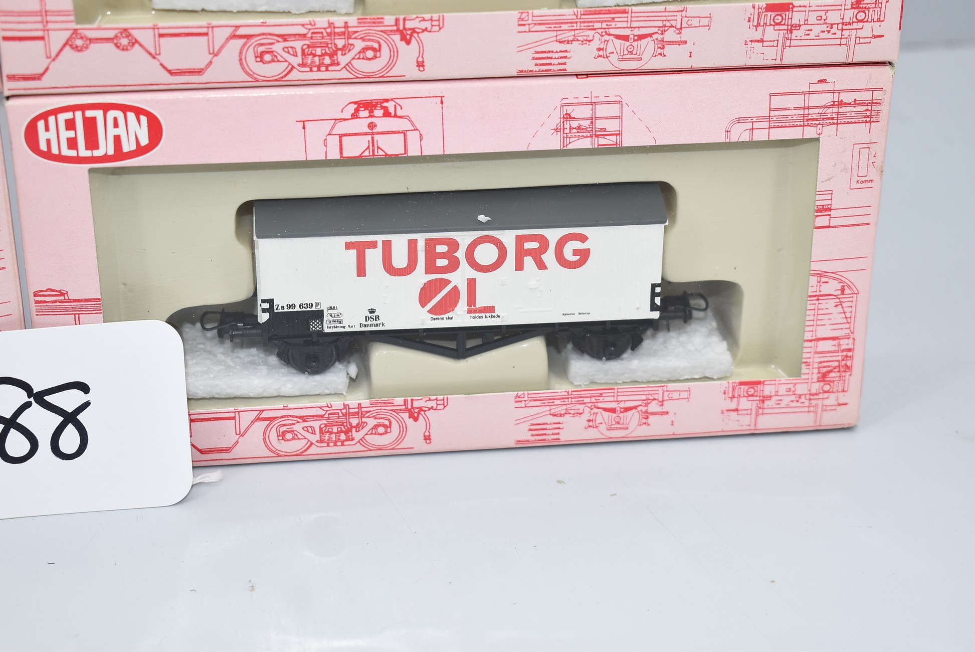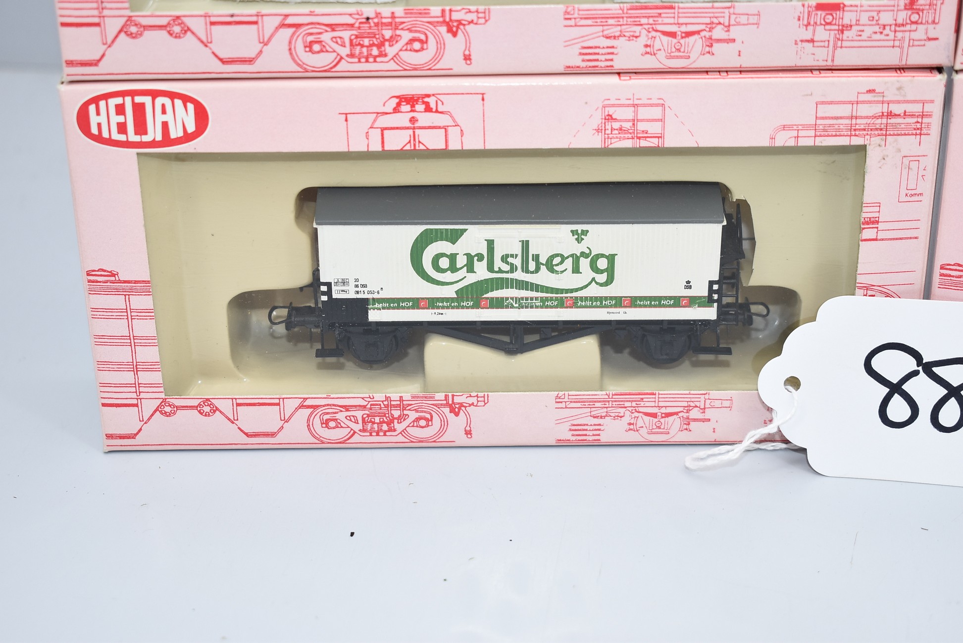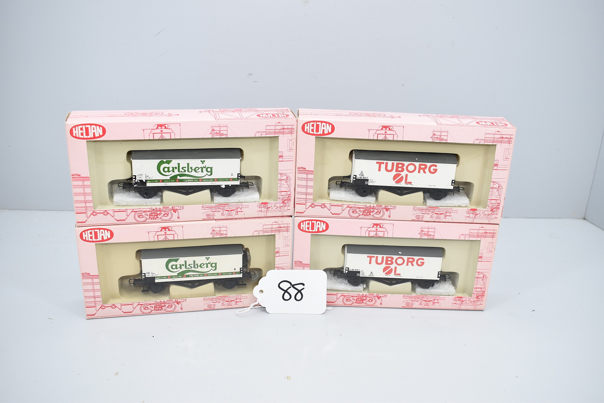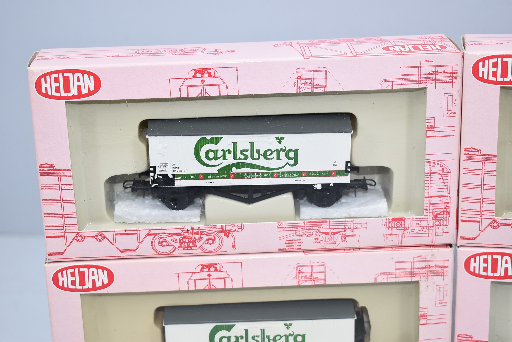 88. Lot of 4 Heljan HO-Scale Train Cars – Including 4202 and 4201 Carlsburg and 4203 and 4204 Tuborg – All New in Box