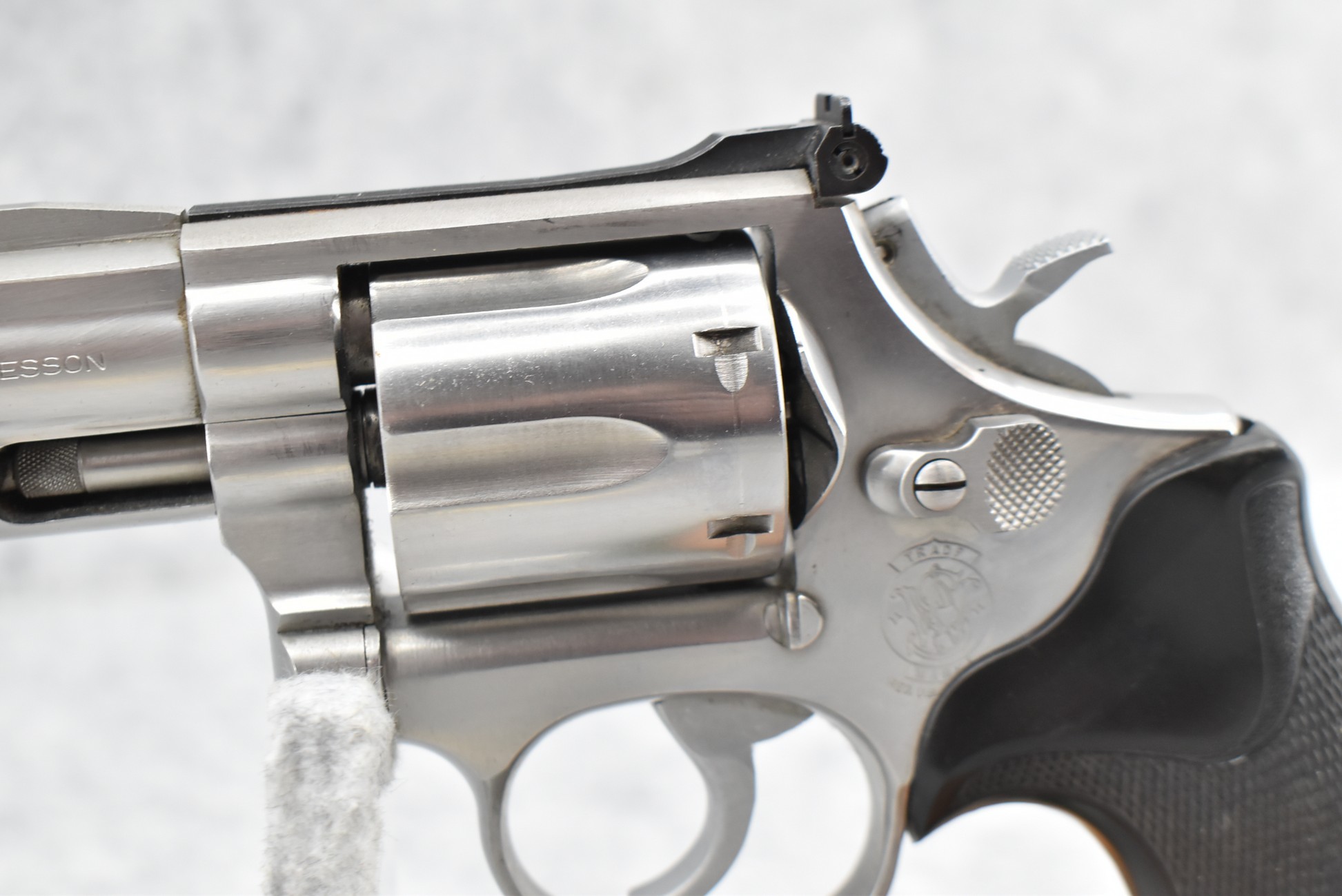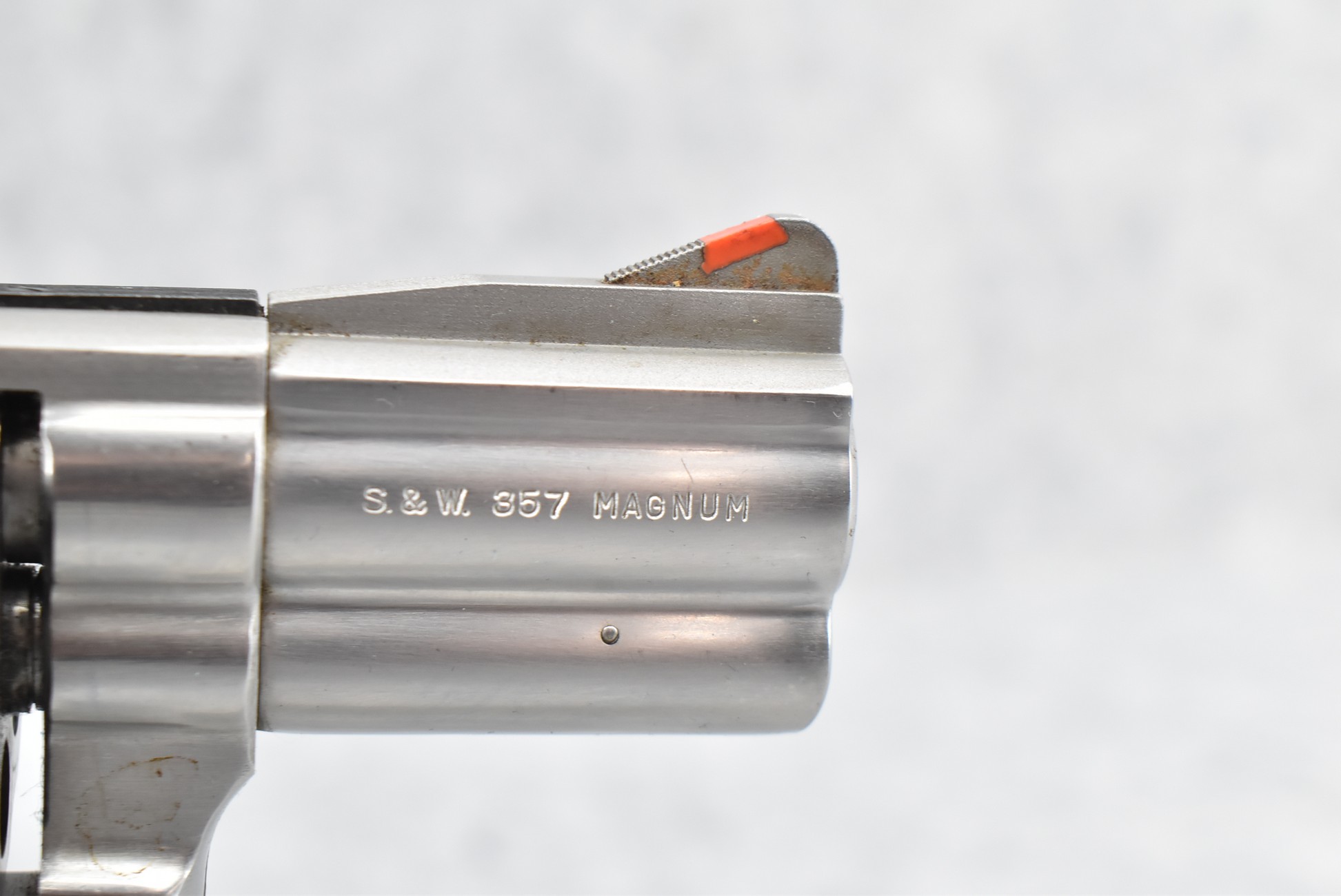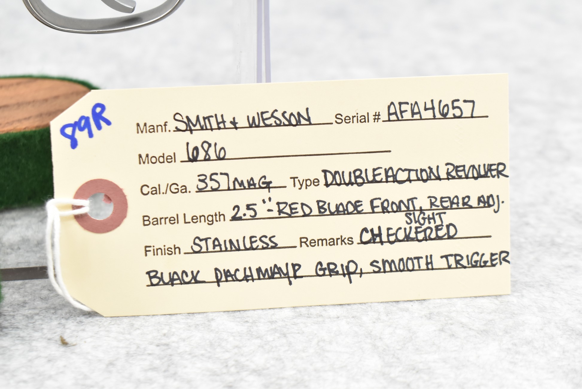 89R. Smith & Wesson – Mod. 686 – 357 Mag. Cal. Double Action Revolver – w/2½” Barrel w/Red Blade Front and Adjustable Rear Sights – Stainless Finish – w/Checkered Black Pachmayr Grip