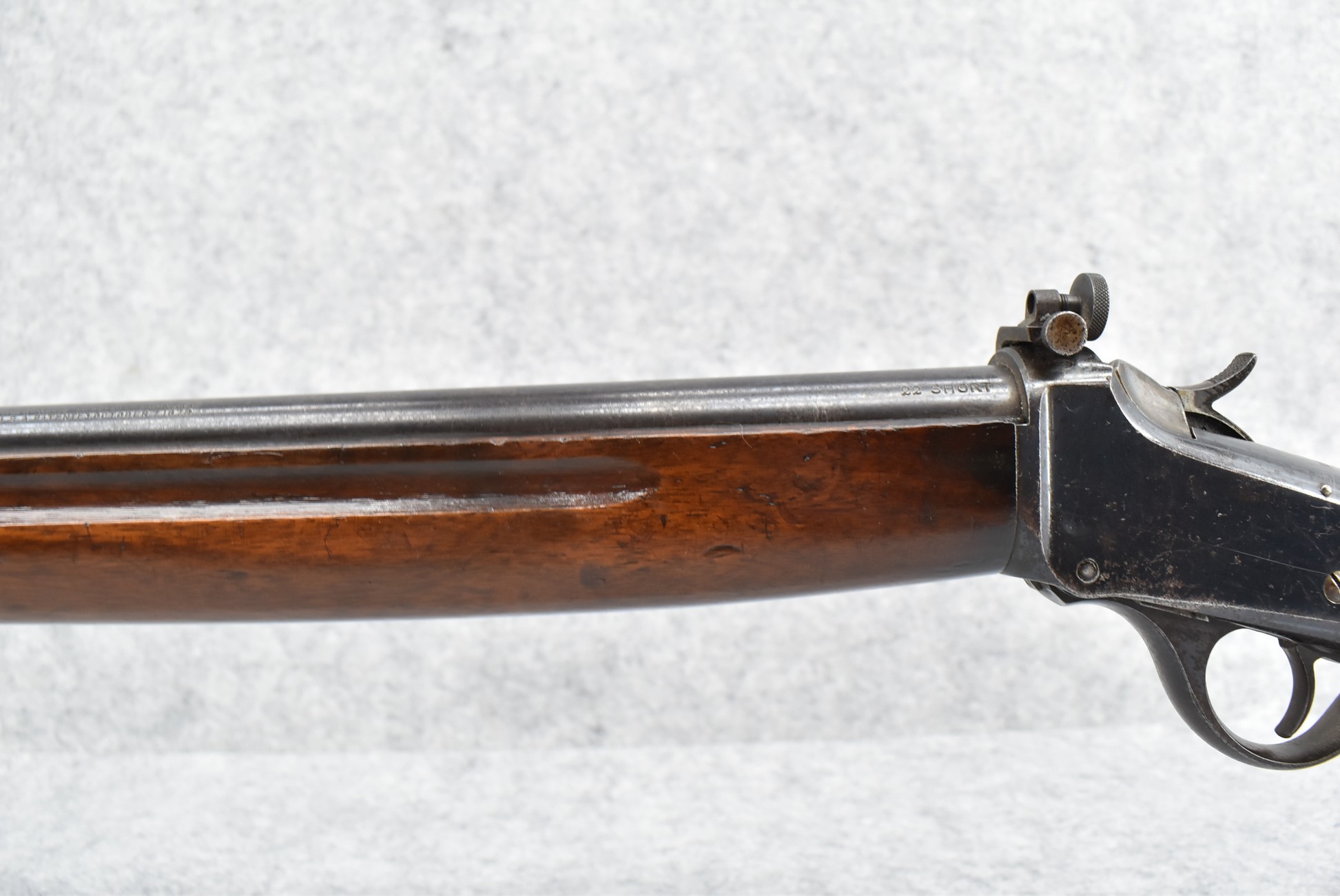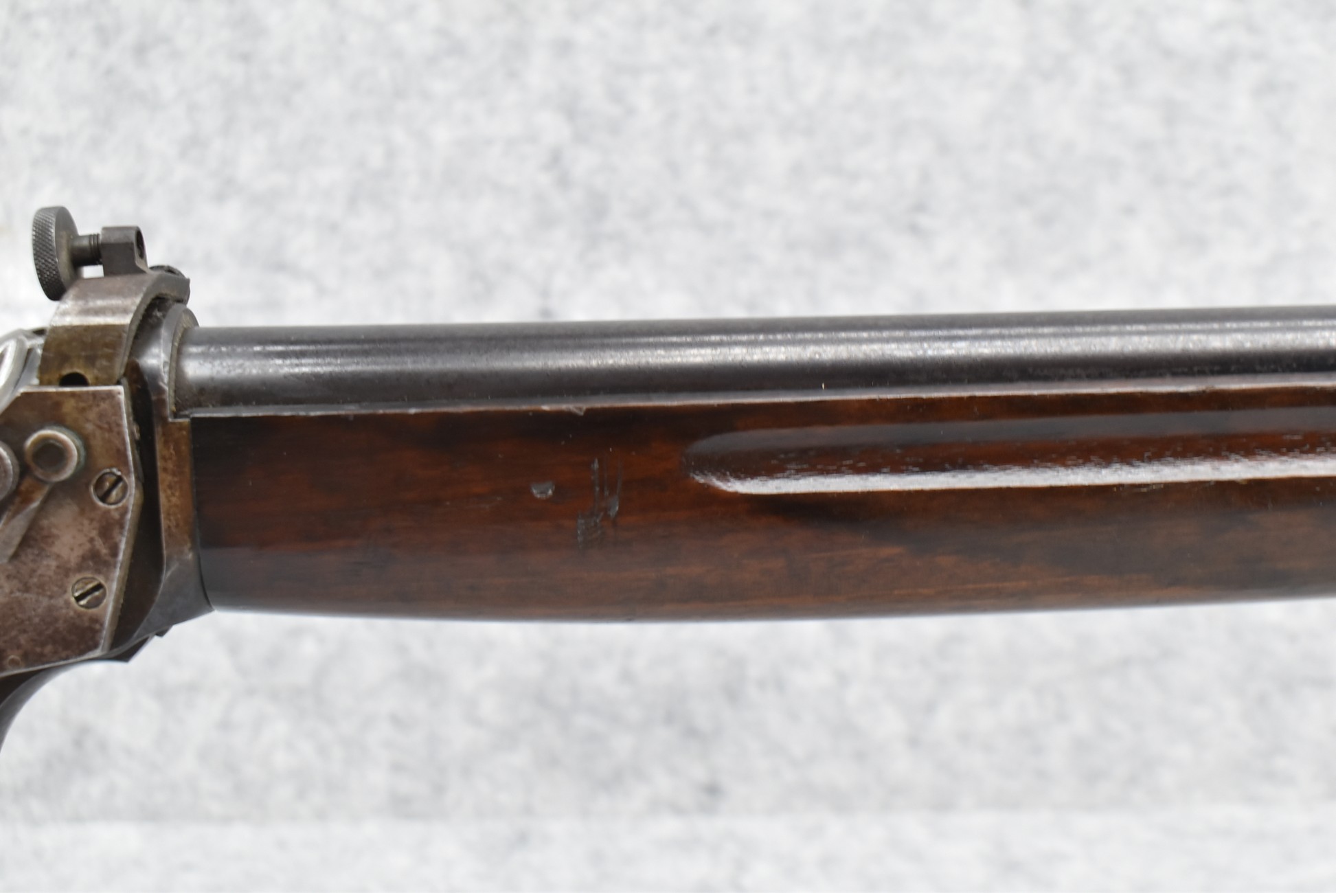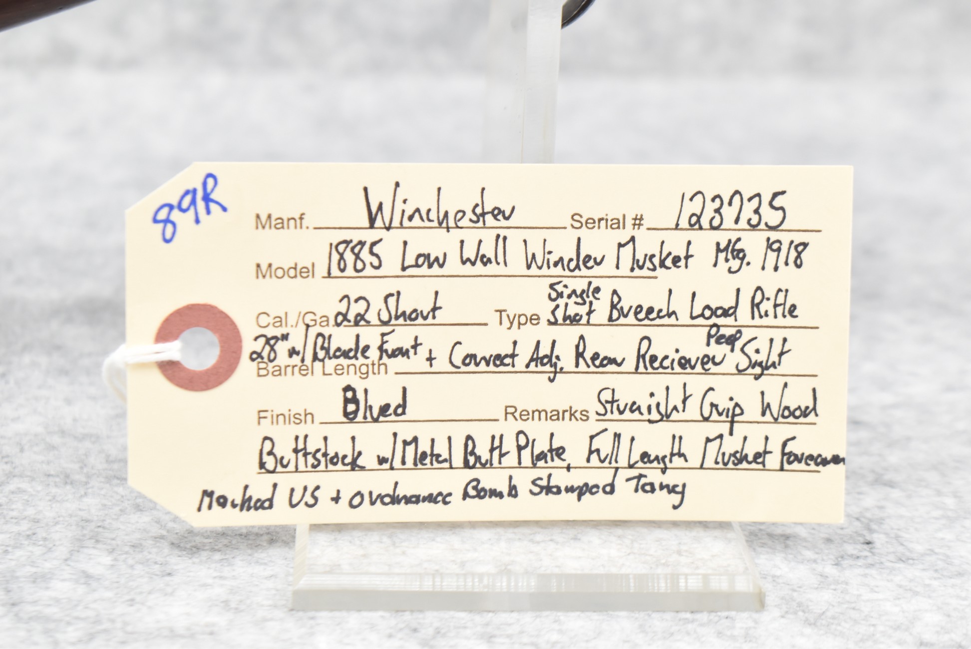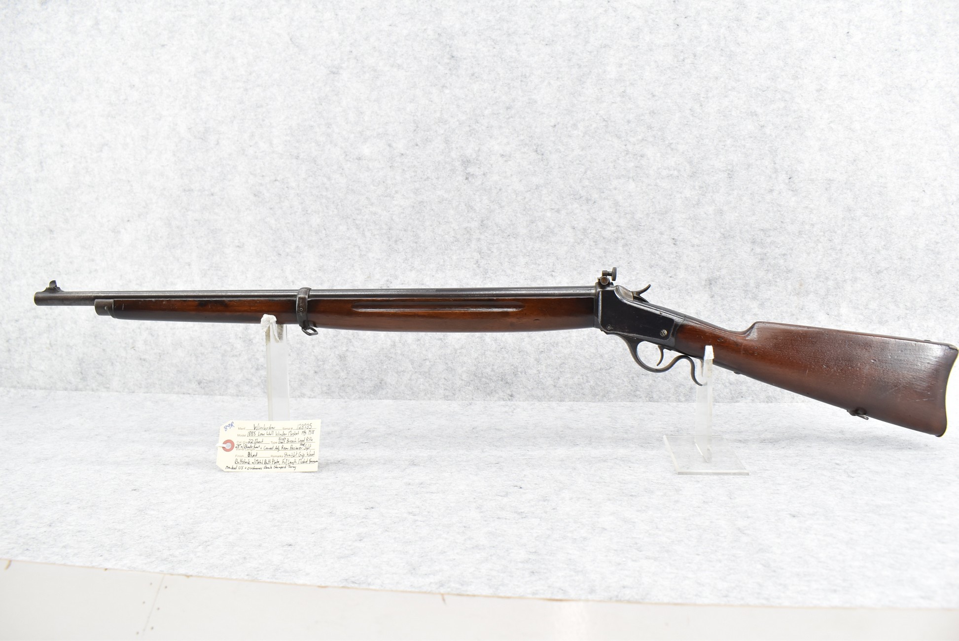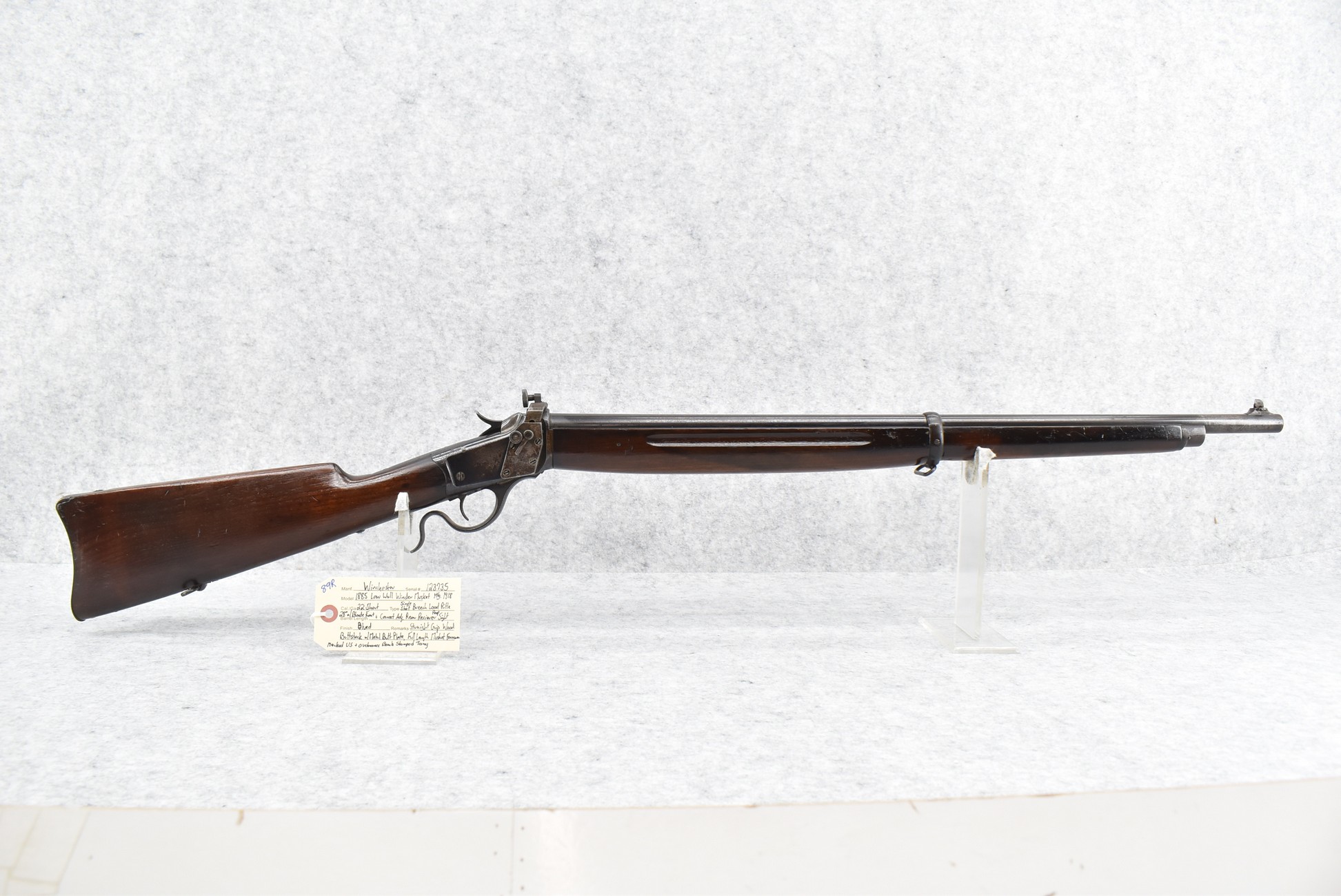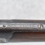 89R. Winchester – Mod. 1885 Low Wall Winder Musket – 22 Short Cal. Single Shot Breech Load Rifle – w/28” Barrel w/Blade Front & Correct Adj. Rear Receiver Peep Sights – Blued Finish – w/Straight Grip Wood Butt Stock w/Metal Butt Plate & Full Length Musket Wood Forearm – Marked “US” & Ordnance Bomb Stamped Tang – Mfg. 1918