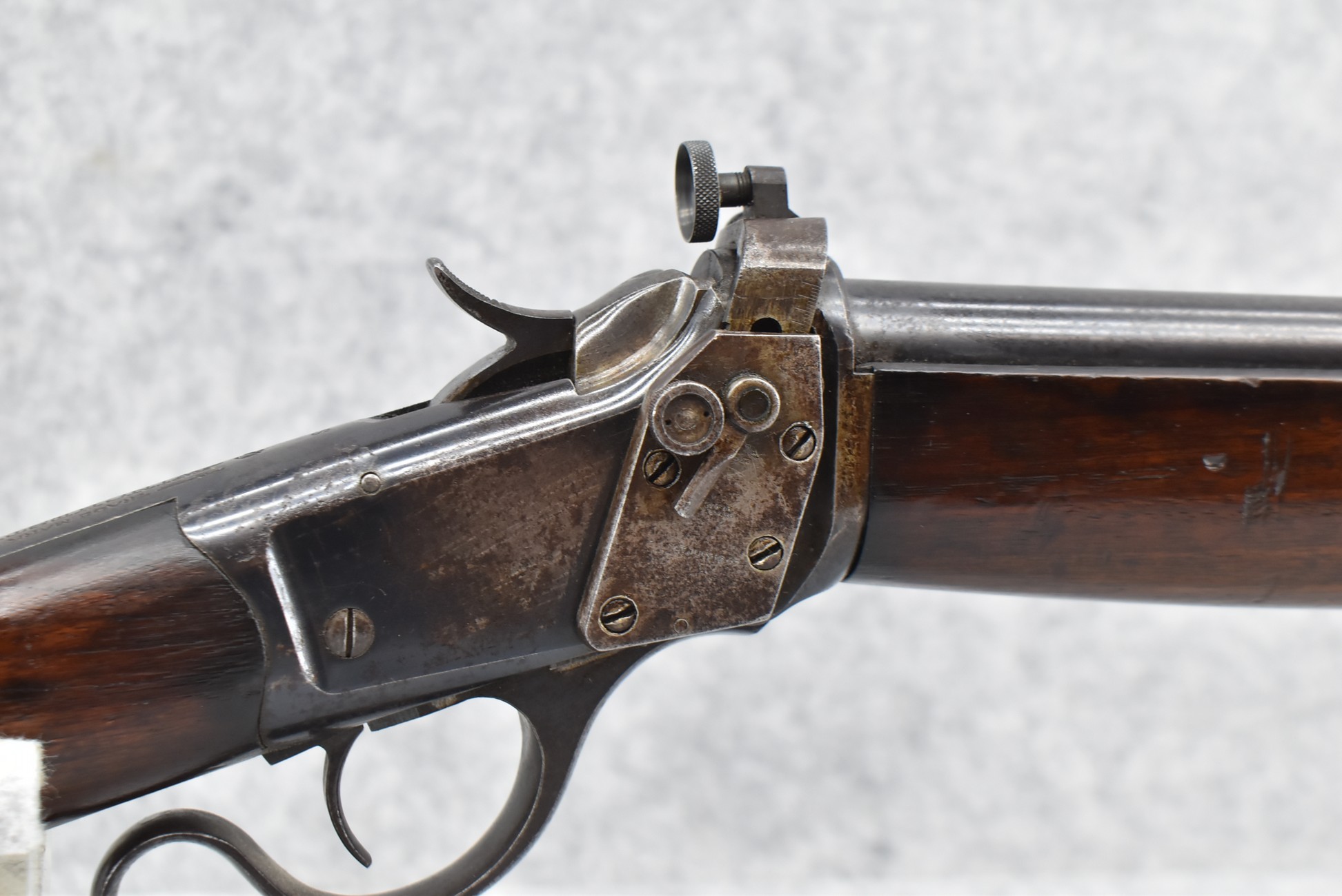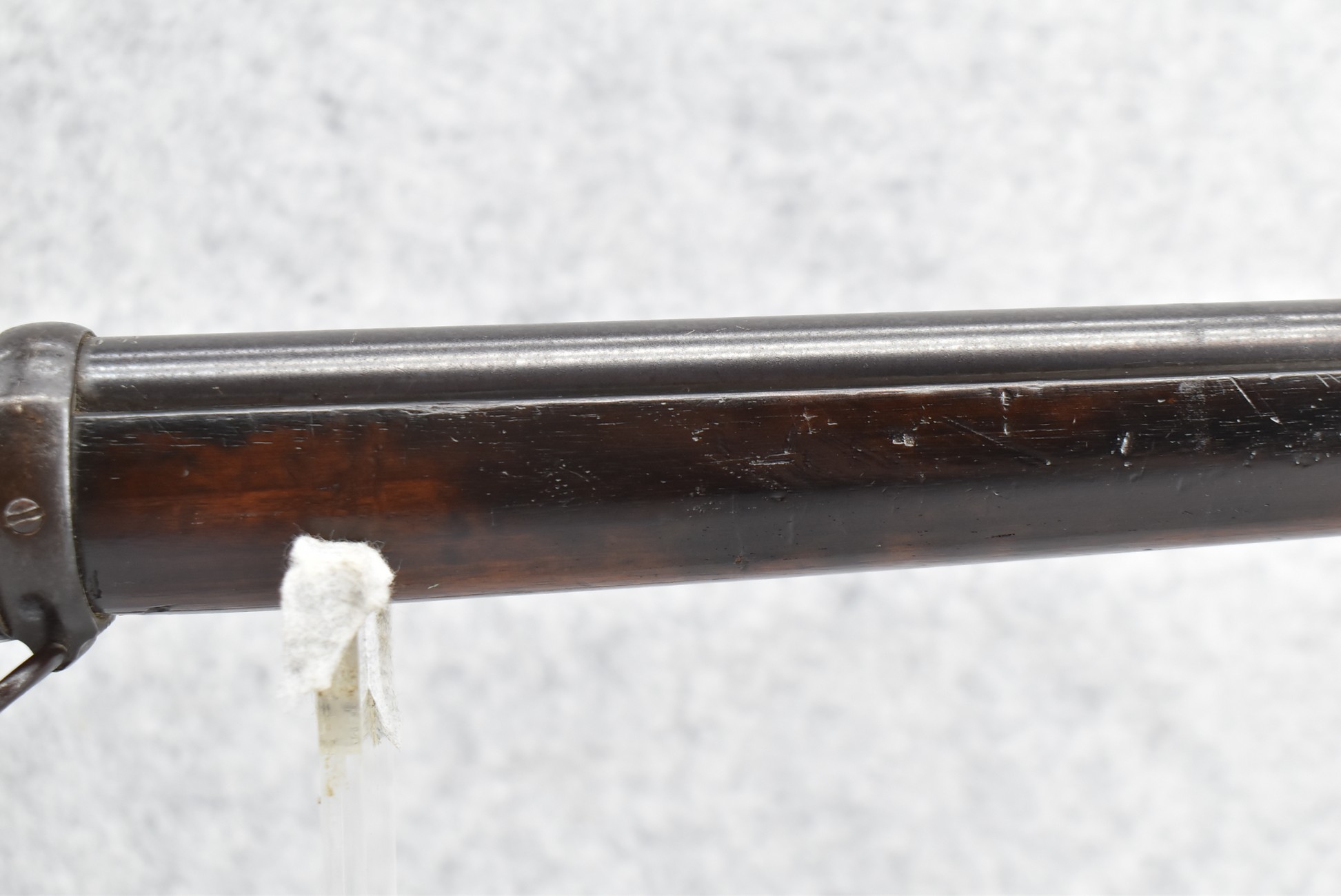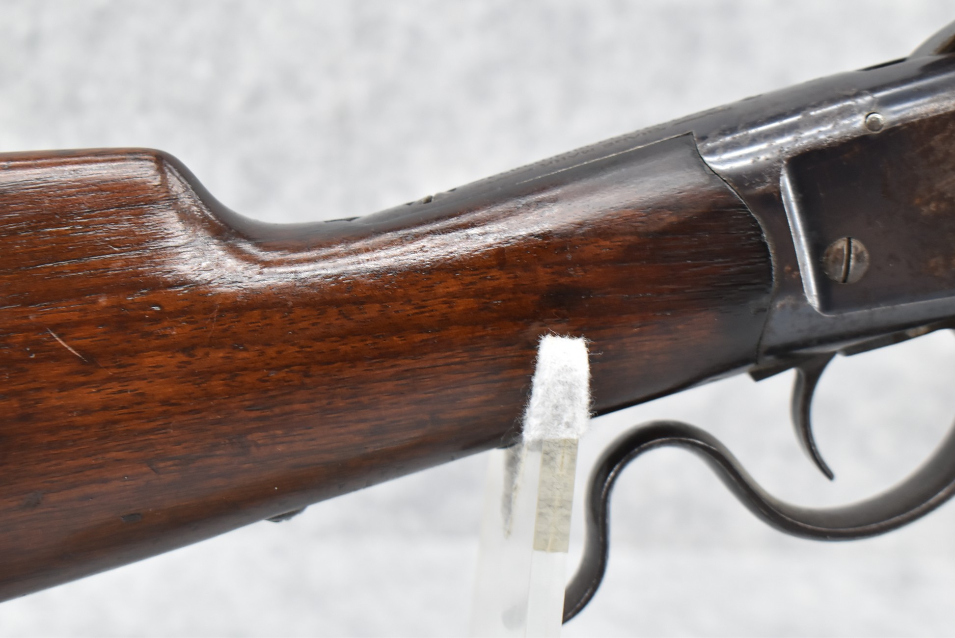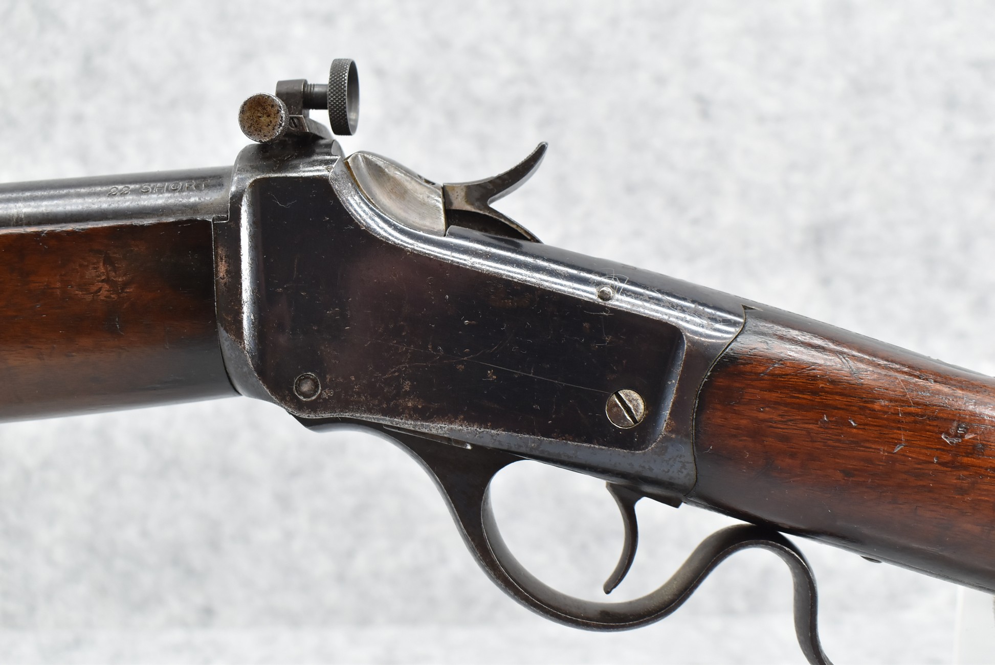 89R. Winchester – Mod. 1885 Low Wall Winder Musket – 22 Short Cal. Single Shot Breech Load Rifle – w/28” Barrel w/Blade Front & Correct Adj. Rear Receiver Peep Sights – Blued Finish – w/Straight Grip Wood Butt Stock w/Metal Butt Plate & Full Length Musket Wood Forearm – Marked “US” & Ordnance Bomb Stamped Tang – Mfg. 1918