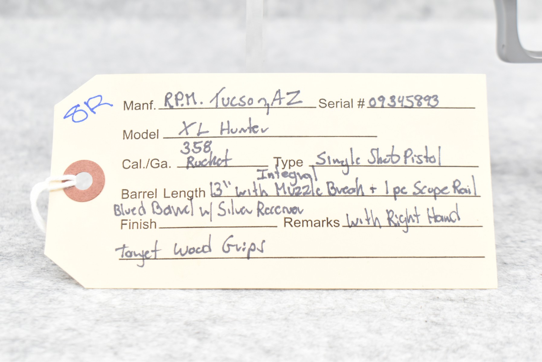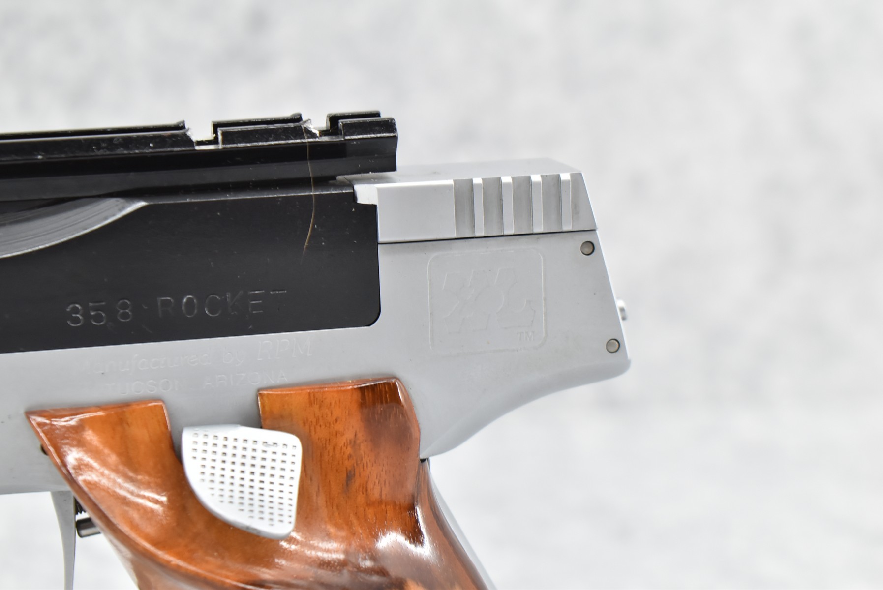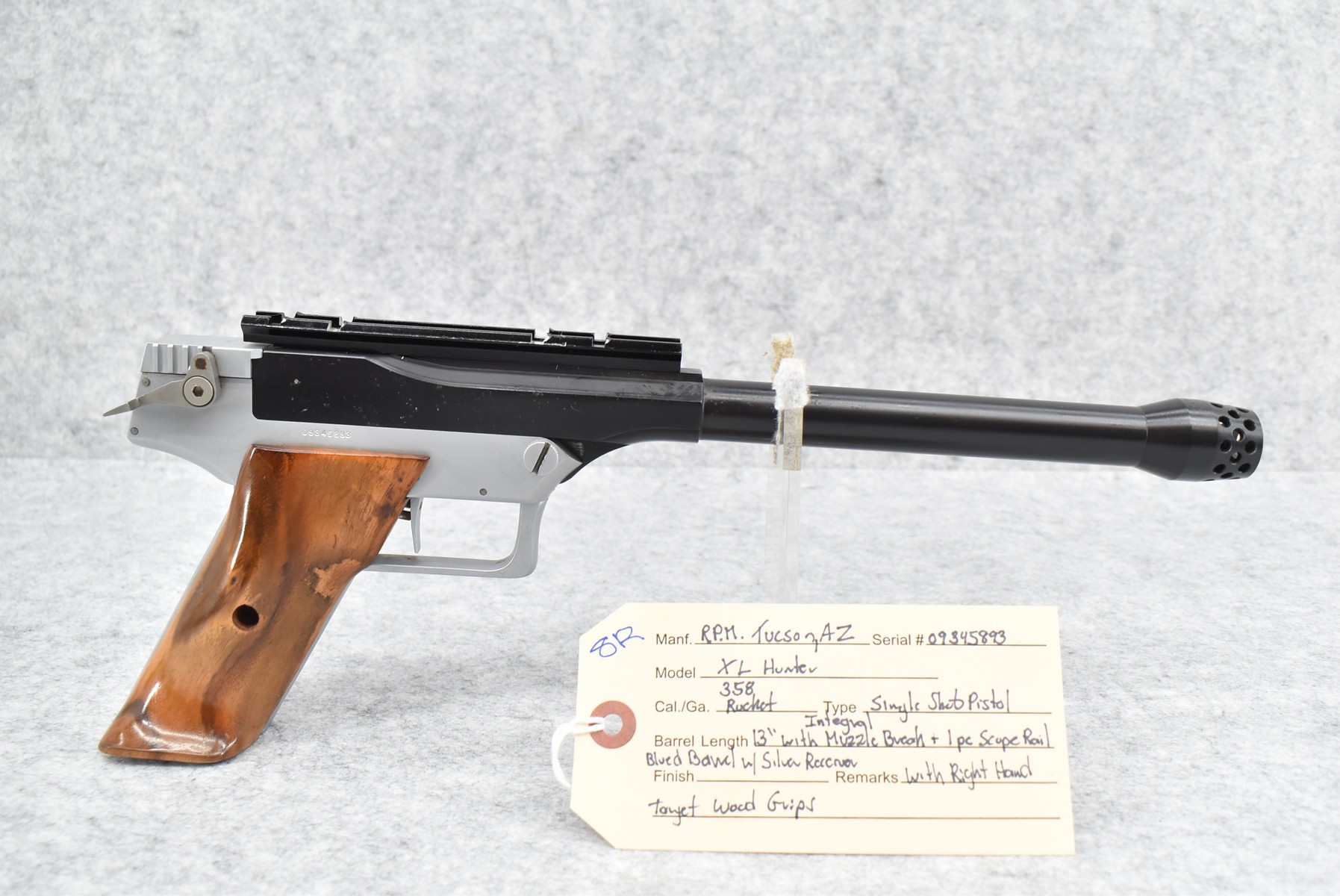 8R. R.P.M. Tucson, AZ – Mod. XL Hunter – 358 Rocket Cal. Single Shot Pistol – w/13” Barrel w/Integral Muzzle Break and 1-Piece Scope Rail – Blued Barrel w/Silver Receiver – w/Righthand Target Wood Grips
