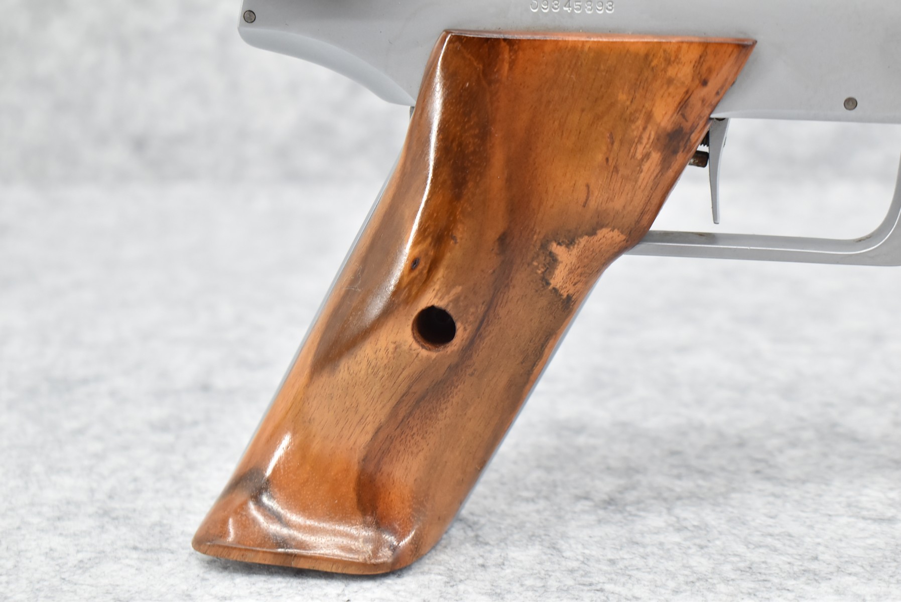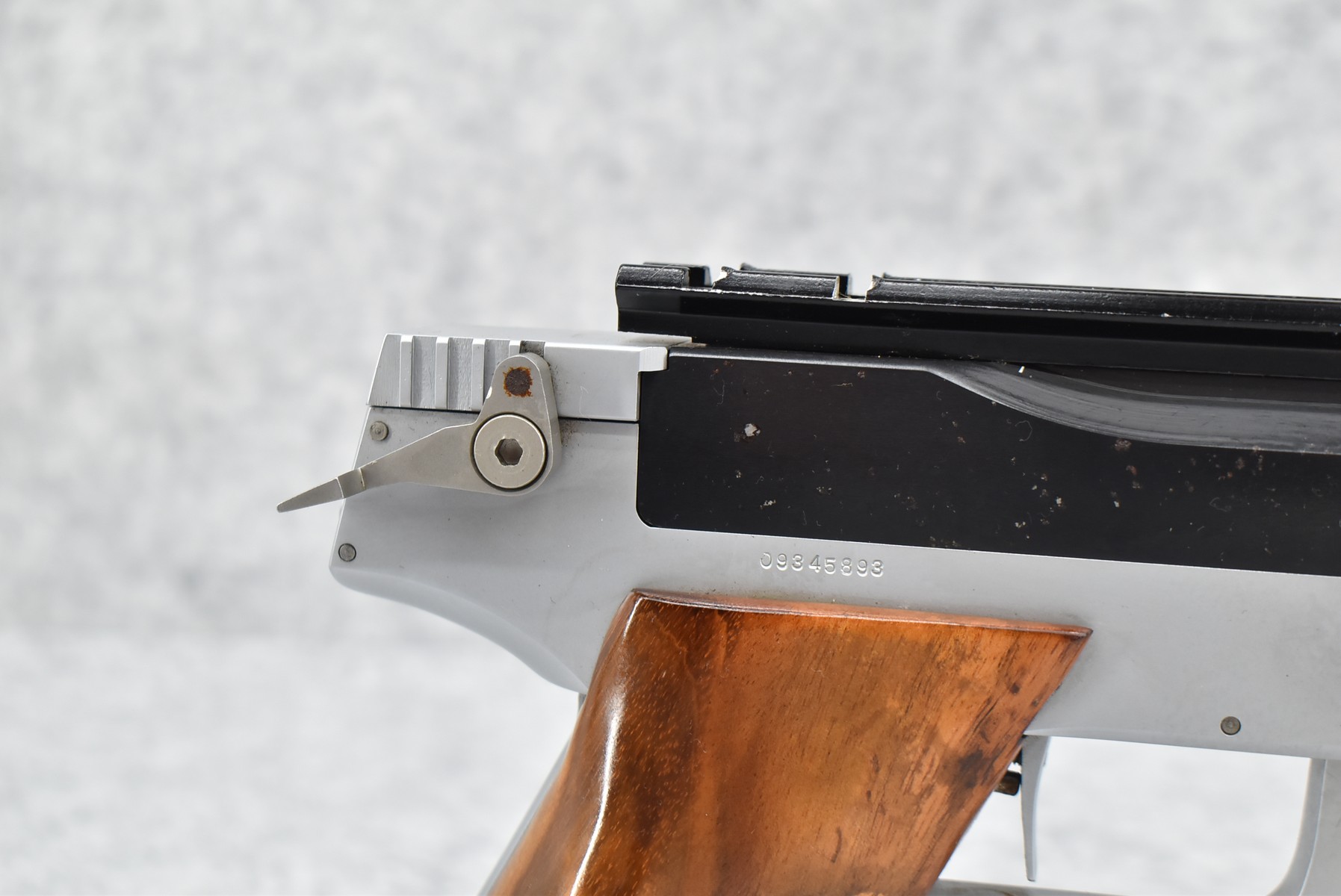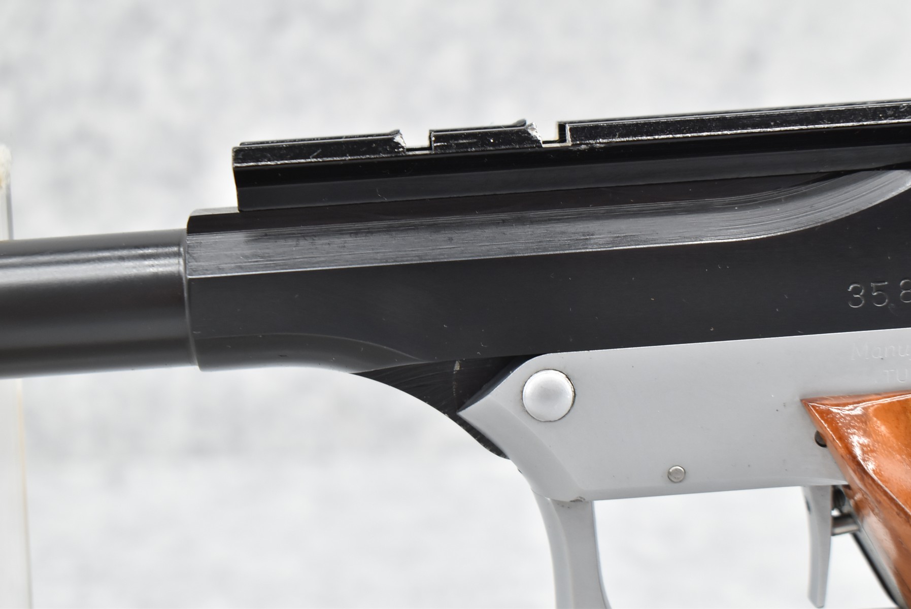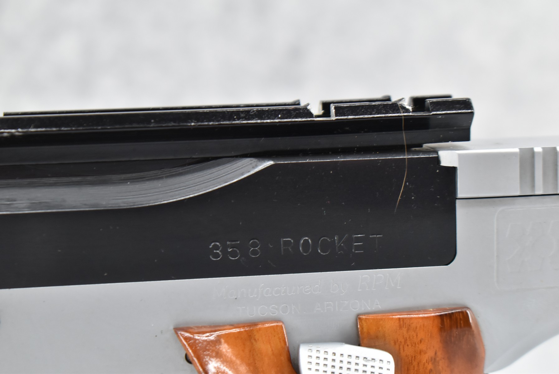 8R. R.P.M. Tucson, AZ – Mod. XL Hunter – 358 Rocket Cal. Single Shot Pistol – w/13” Barrel w/Integral Muzzle Break and 1-Piece Scope Rail – Blued Barrel w/Silver Receiver – w/Righthand Target Wood Grips