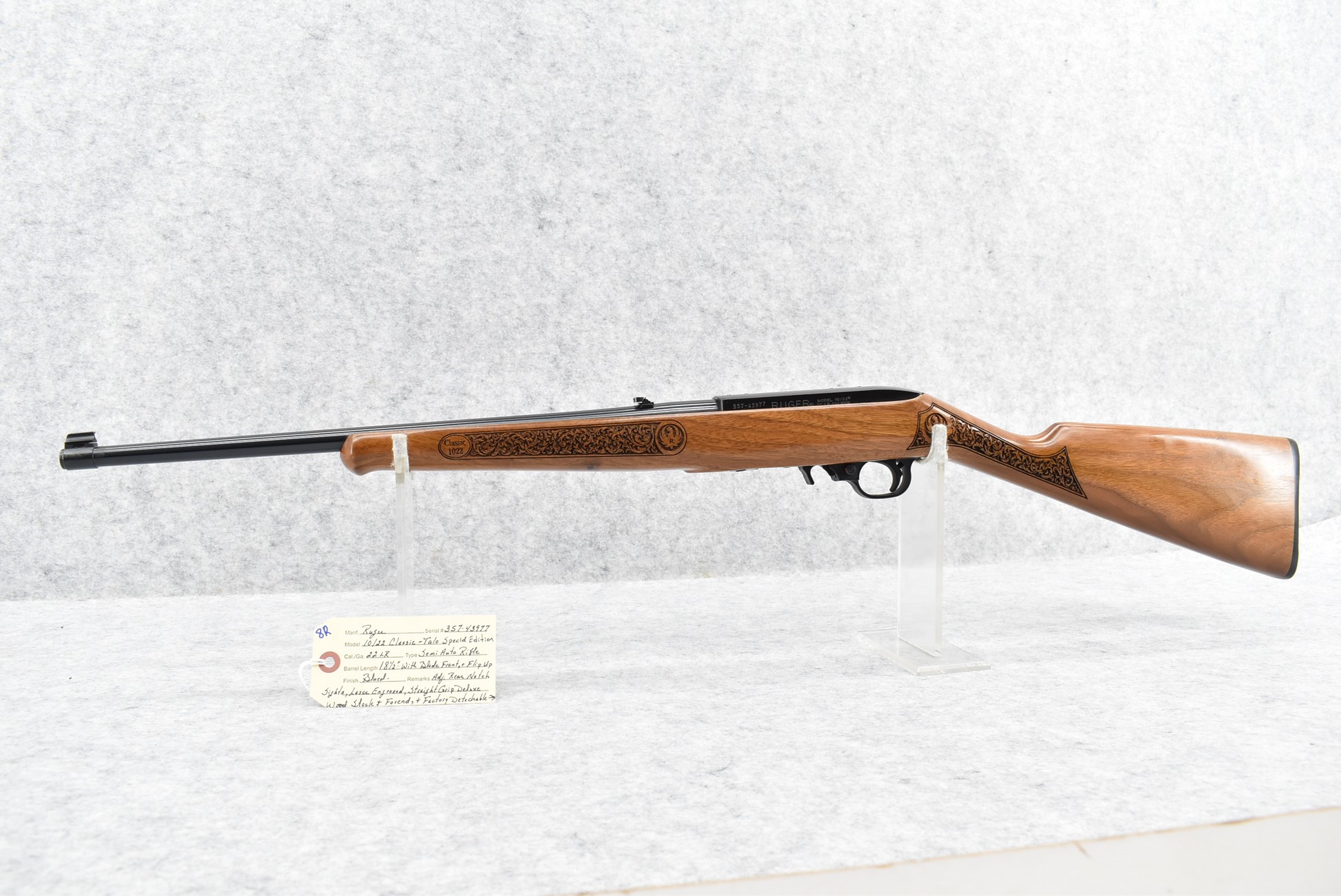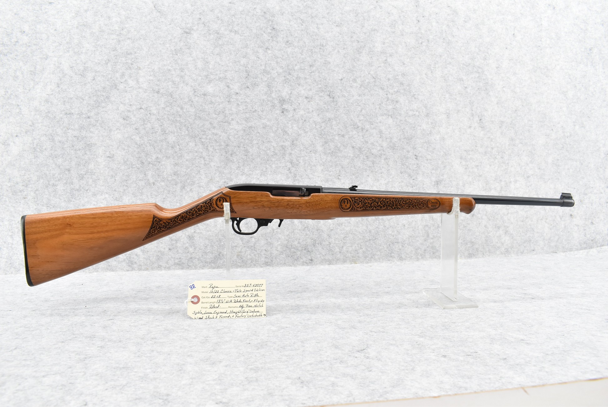 8R. Ruger – Mod. 10/22 Classic – Talo Special Edition – 22LR Cal. Semi-Auto Rifle – w/18 ½” Barrel w/Blade Front & Flip Up Adj. Rear Notch Sights – w/Laser Engraved Straight Grip Deluxe Wood Stock w/Factory Butt Plate – w/Factory Detachable Magazine