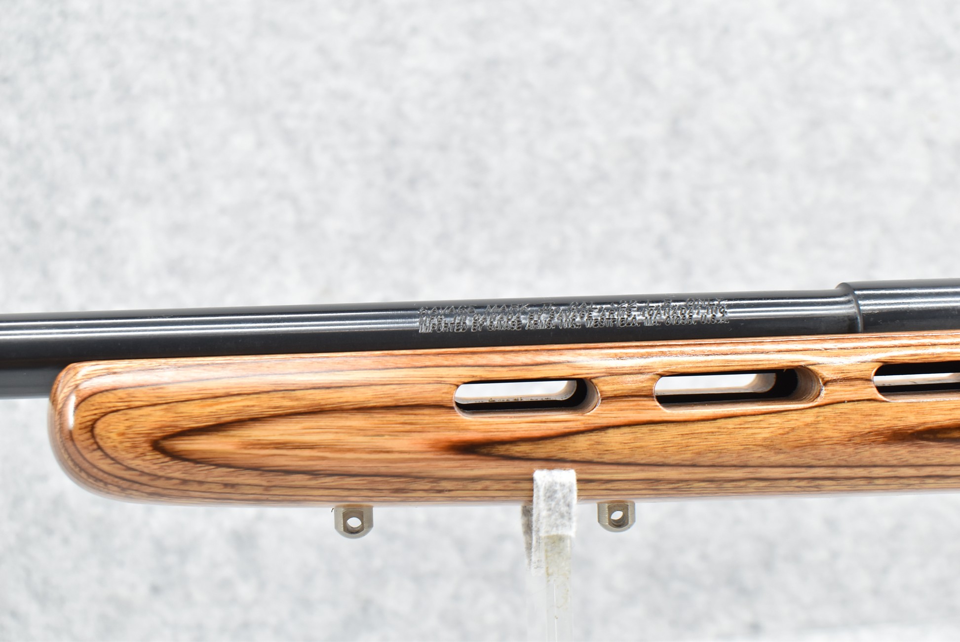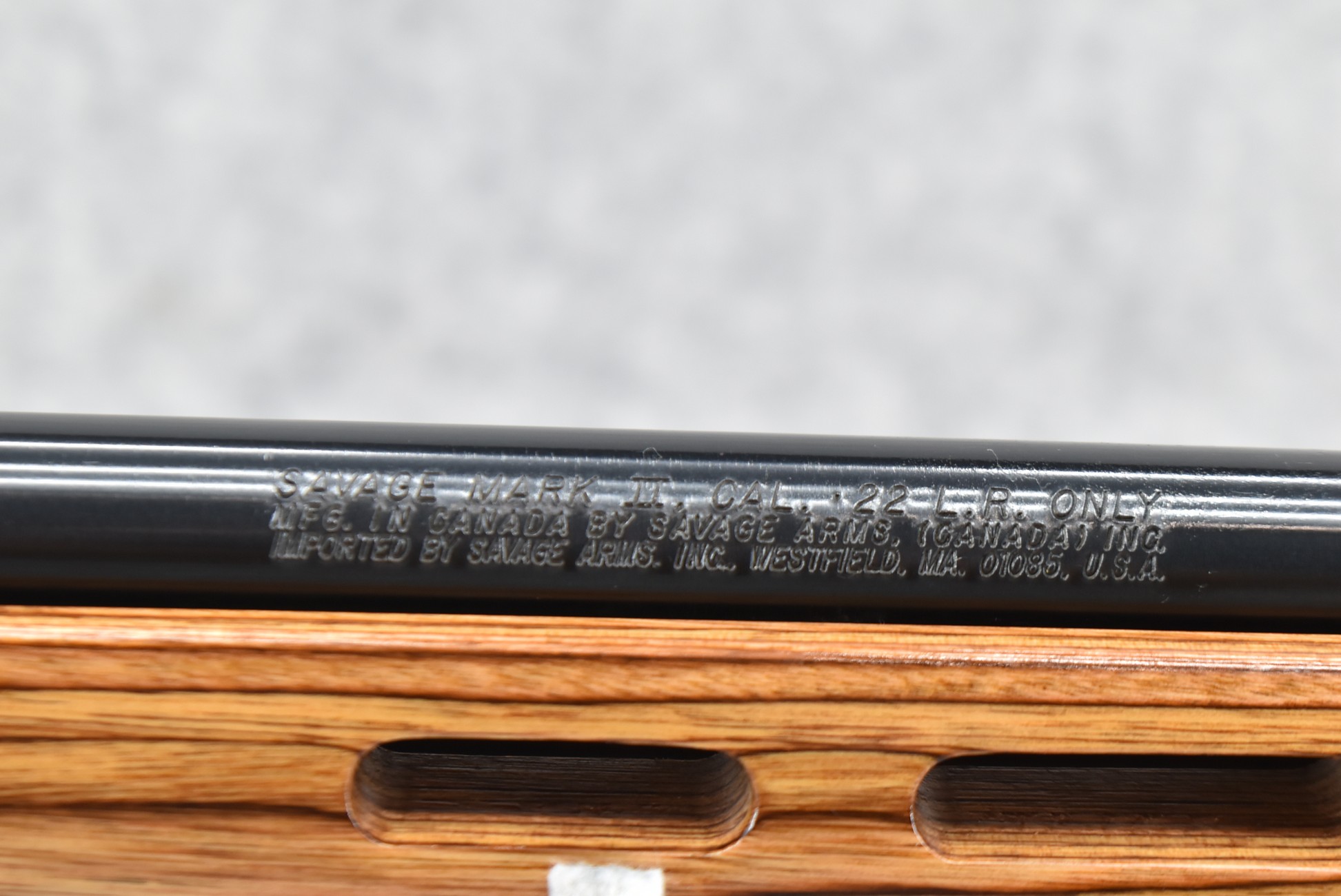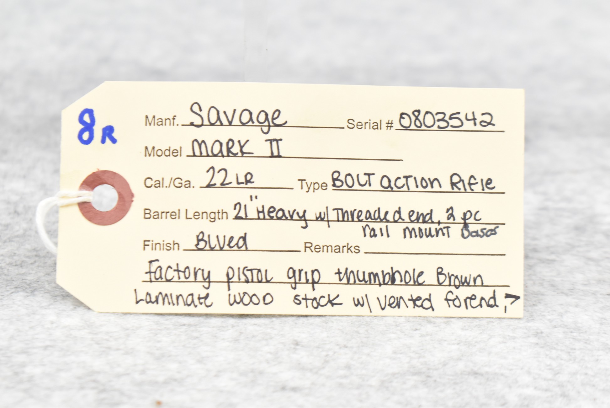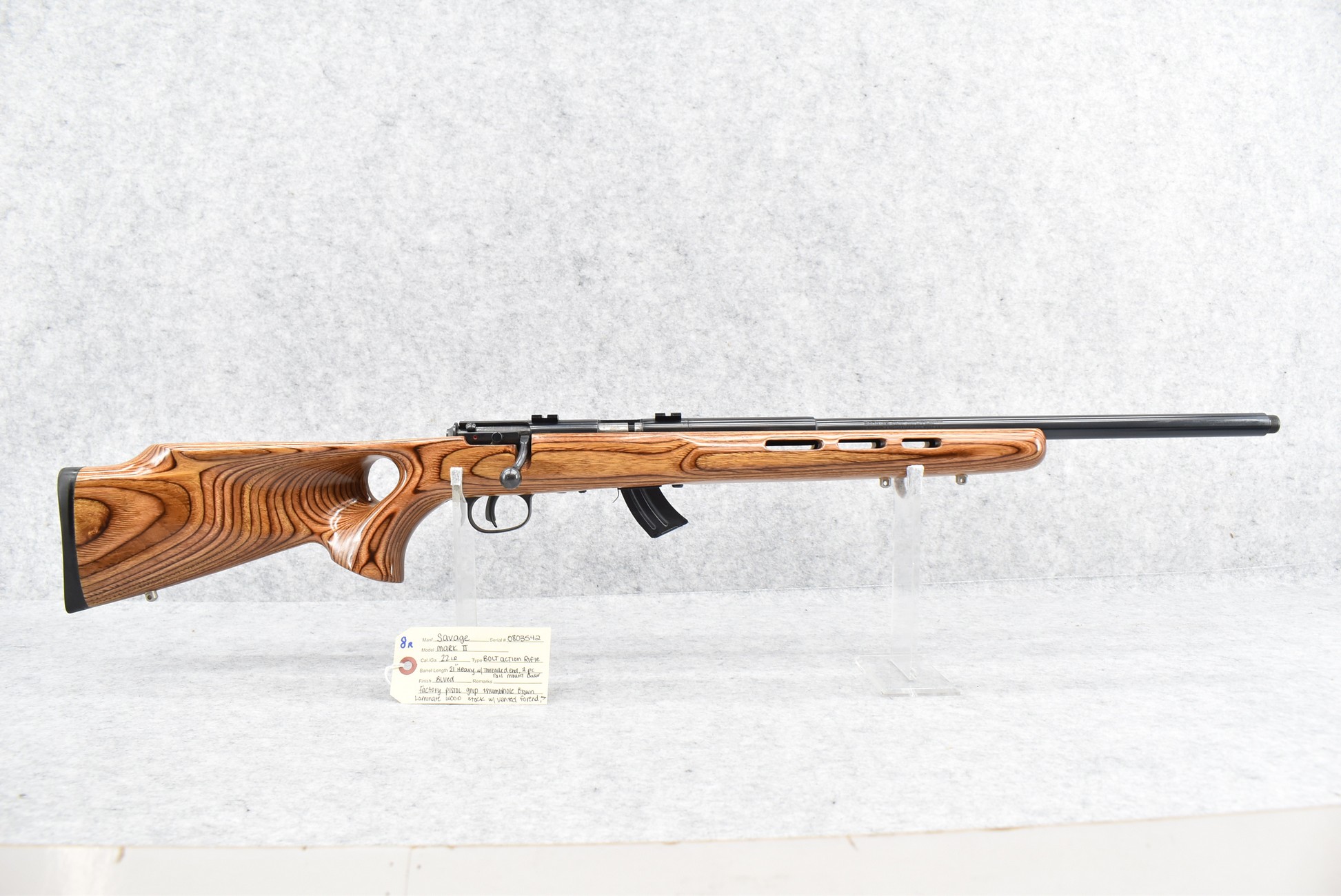 8R. Savage – Mod. Mark II – 22LR Cal. Bolt Action Rifle – w/21” Heavy Barrel w/Threaded Muzzle – Blued Finish – w/Factory Pistol Grip Thumb-Hole Brown Laminate Wood Stock w/Factory Recoil Pad & Vented Forend – w/Detachable Mag – w/2pc. Bases