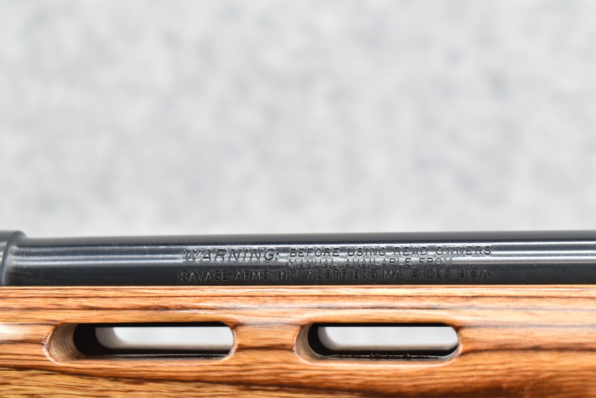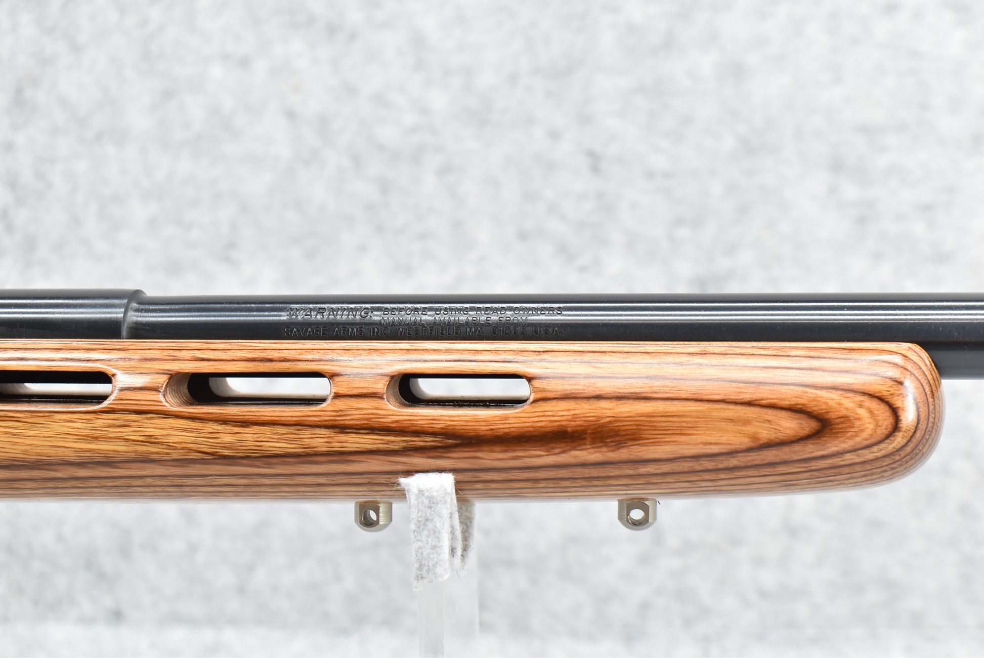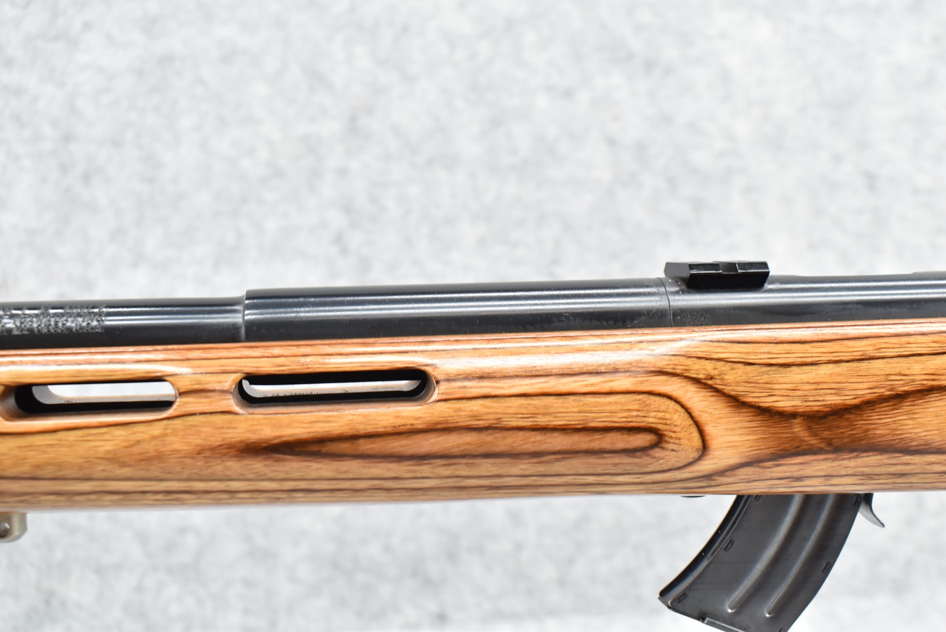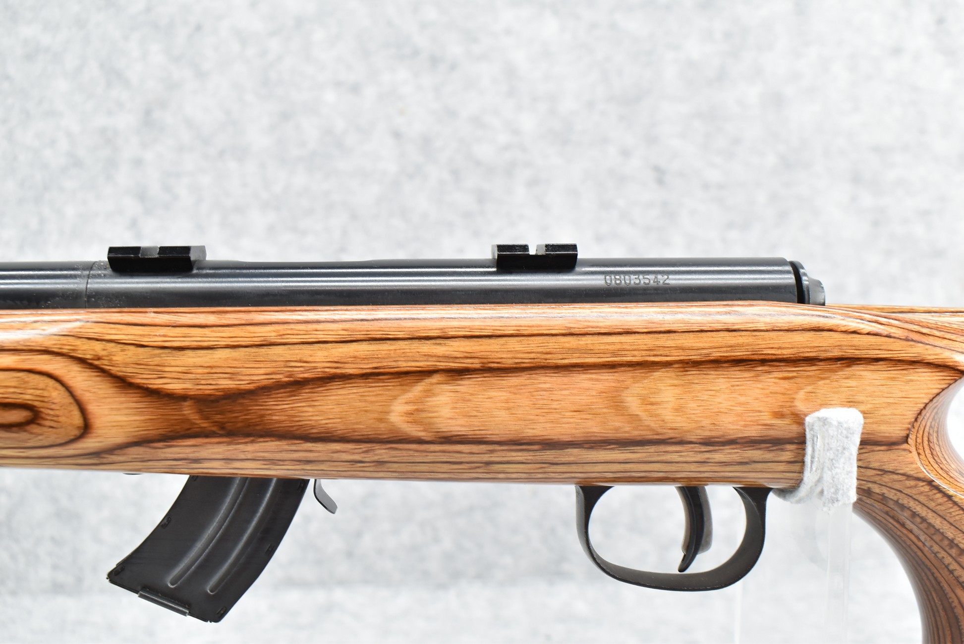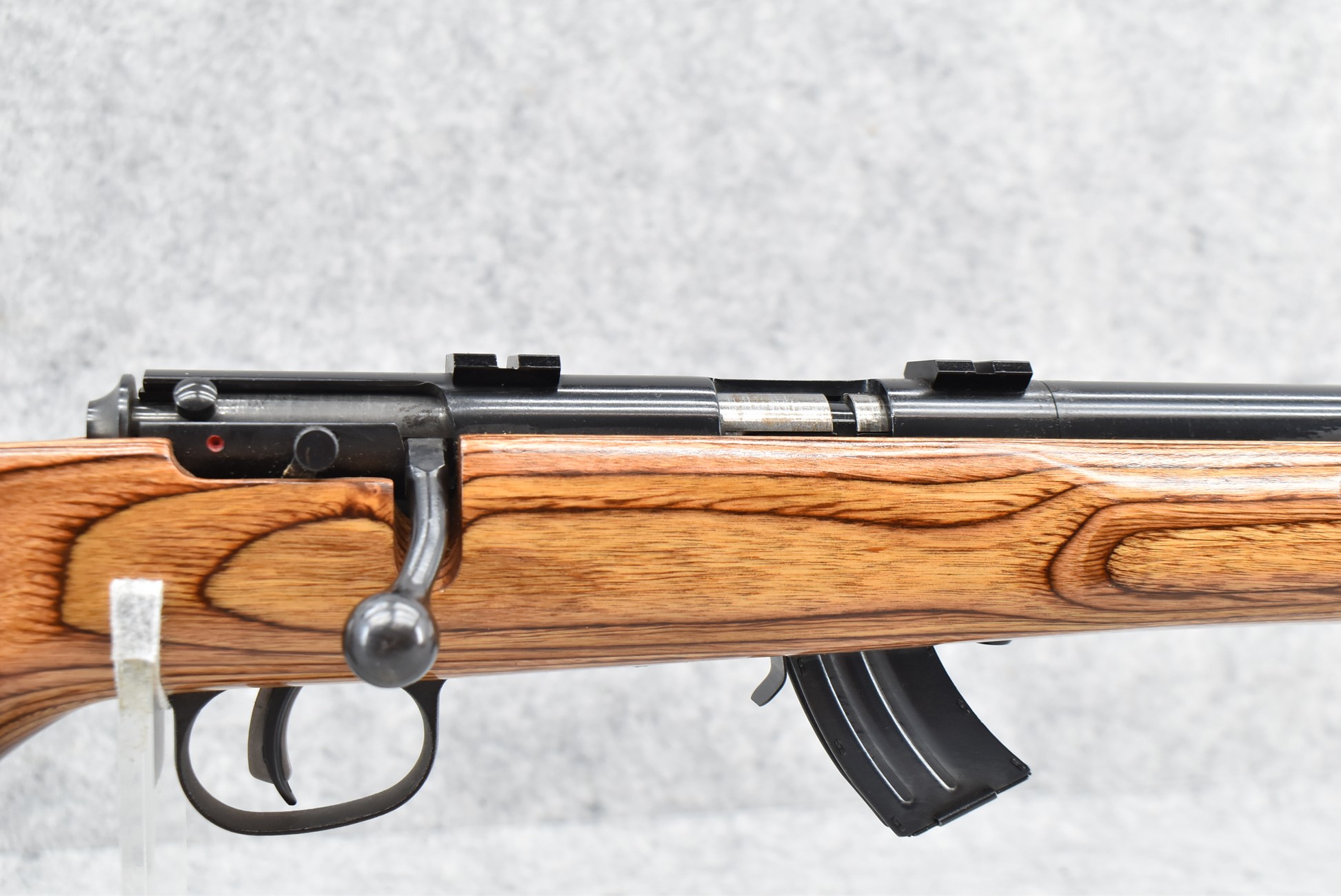 8R. Savage – Mod. Mark II – 22LR Cal. Bolt Action Rifle – w/21” Heavy Barrel w/Threaded Muzzle – Blued Finish – w/Factory Pistol Grip Thumb-Hole Brown Laminate Wood Stock w/Factory Recoil Pad & Vented Forend – w/Detachable Mag – w/2pc. Bases