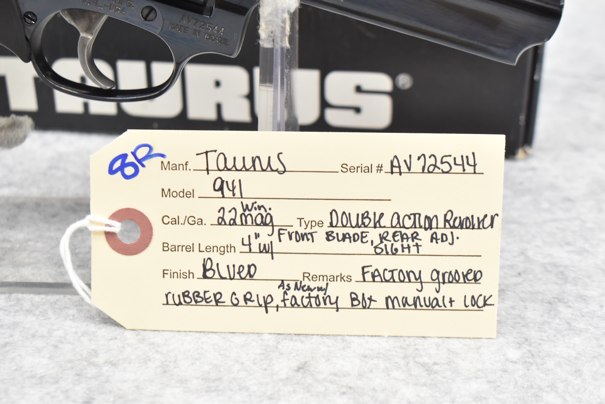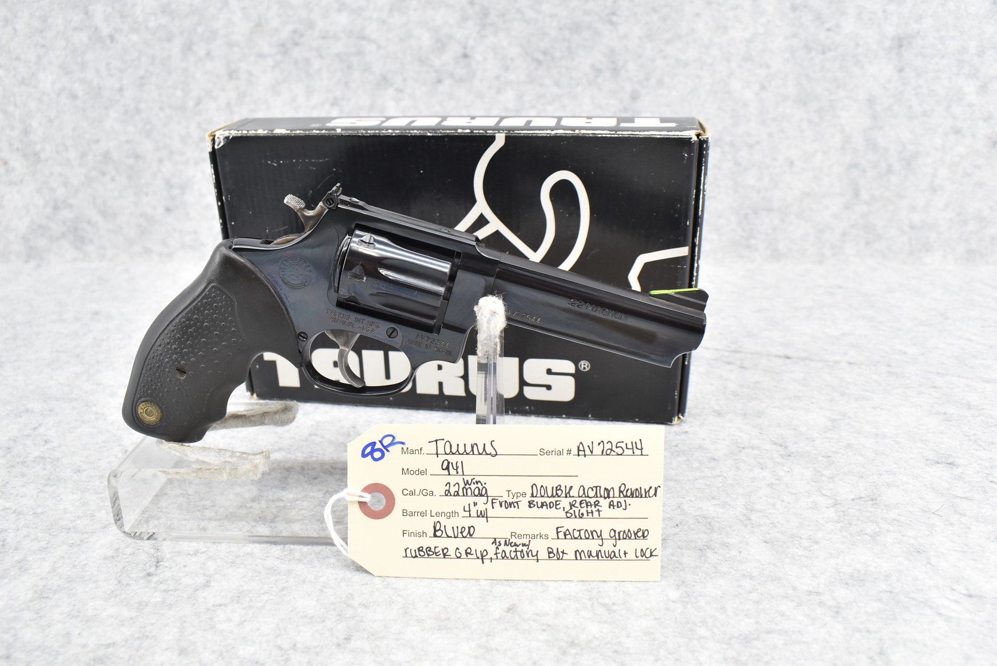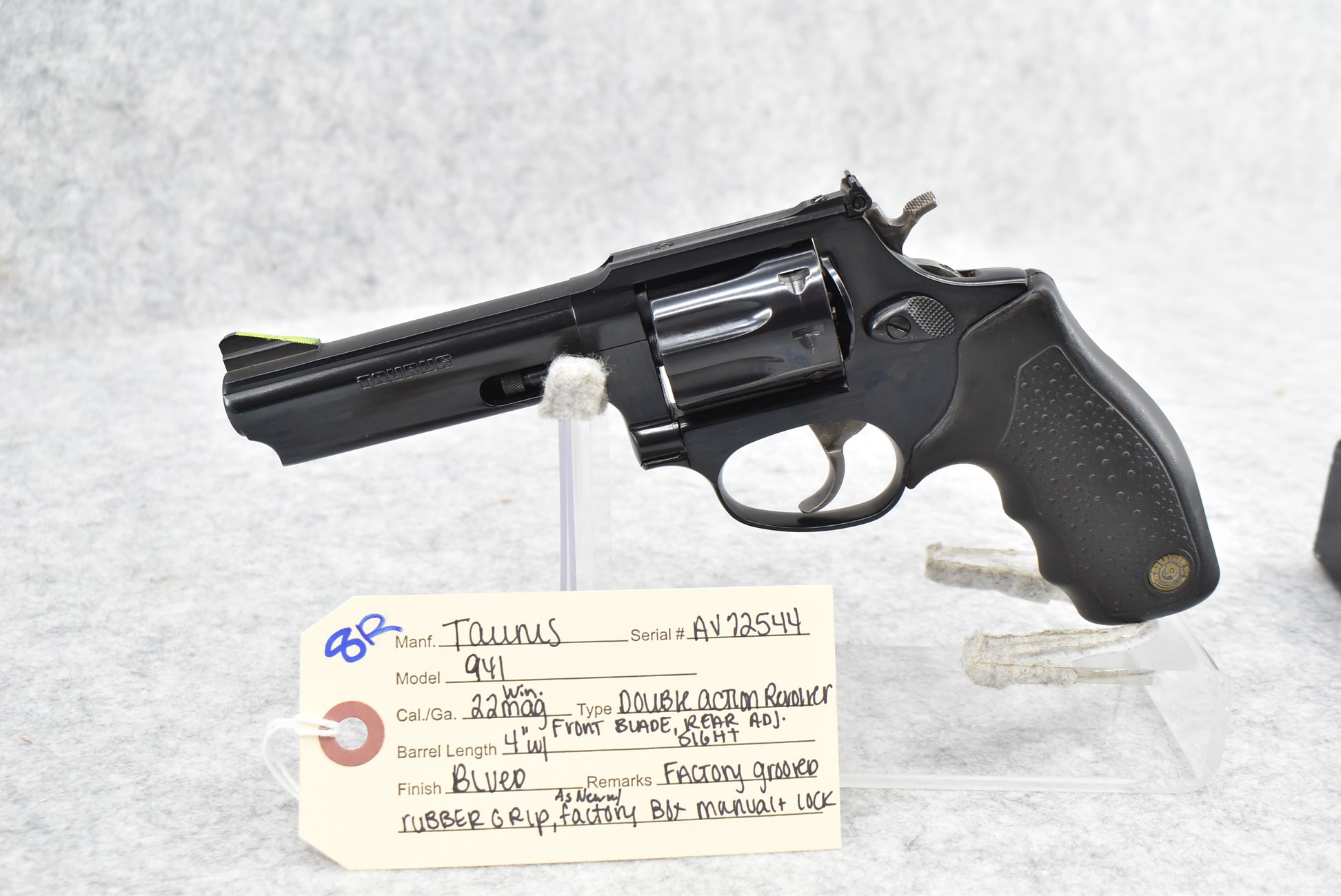 8R. Taurus – Mod. 941 – 22 Win. Mag. Cal. Double Action Revolver – w/4” Barrel w/Front Blade & Rear Adj. Sights – Blued Finish – w/Factory Grooved Rubber Grips – As New w/Factory Box & Manual