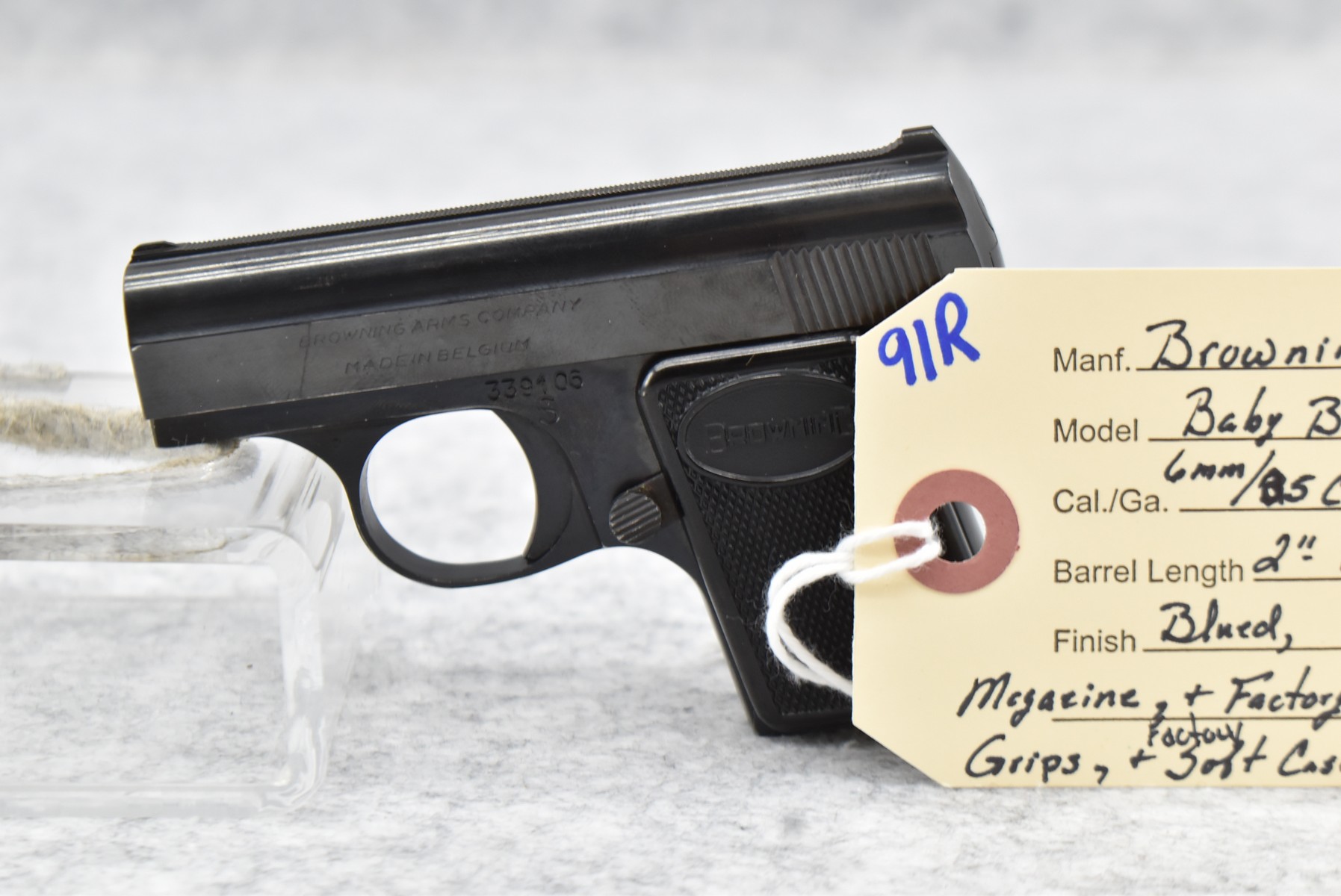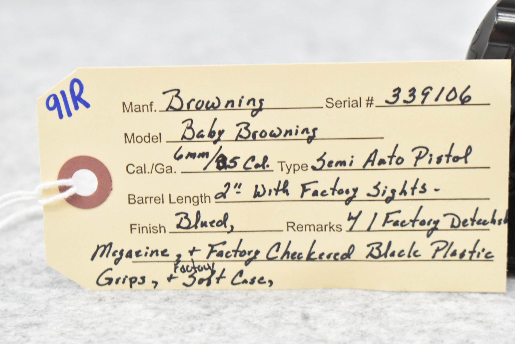 91R. Browning – Mod. Baby Browning – 25 ACP Cal. Semi-Auto Pistol – w/2” Barrel w/Factory Sights – Blued Finish – w/Factory Checkered Black Plastic Grips – w/Factory Detachable Magazine – w/Factory Soft Case