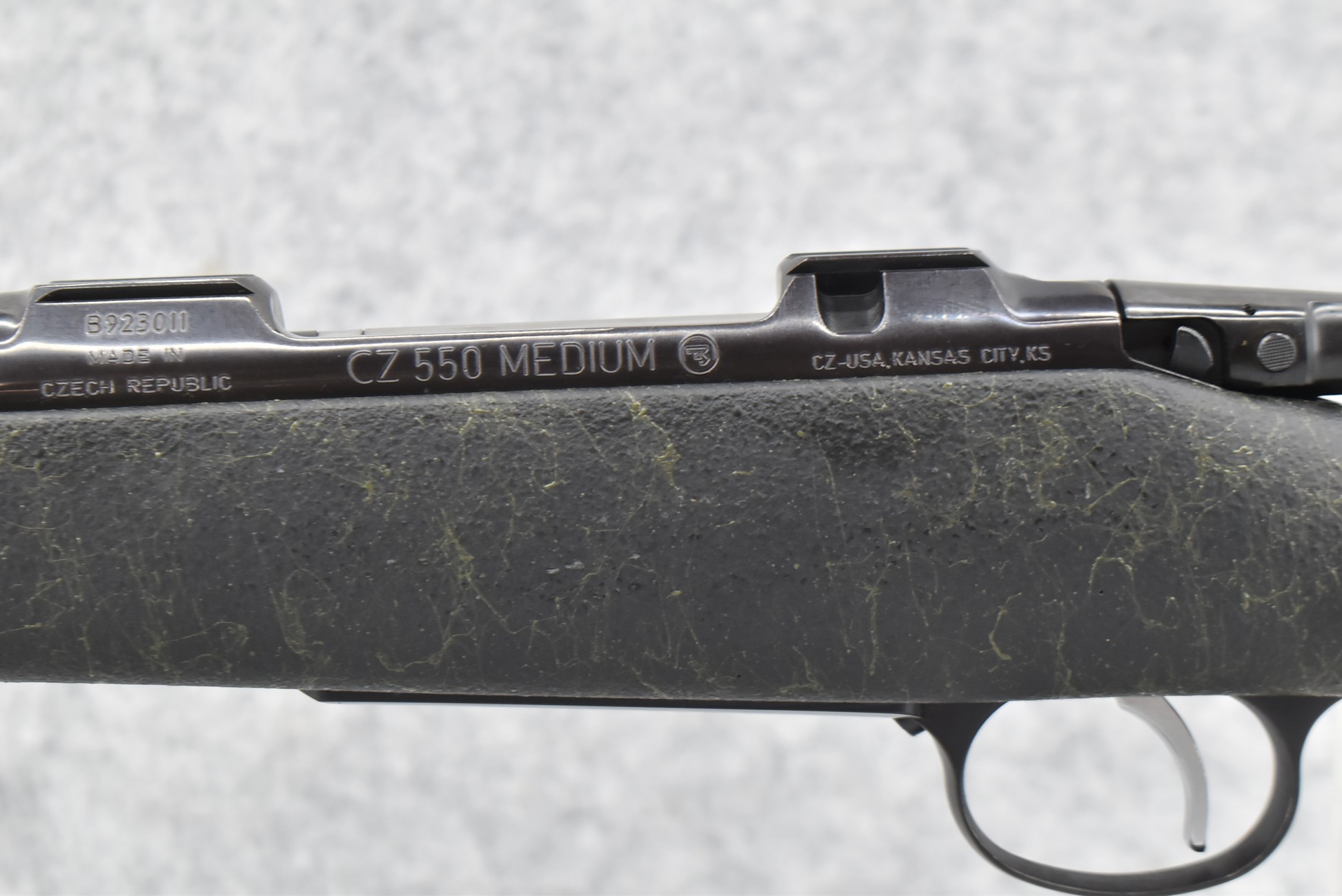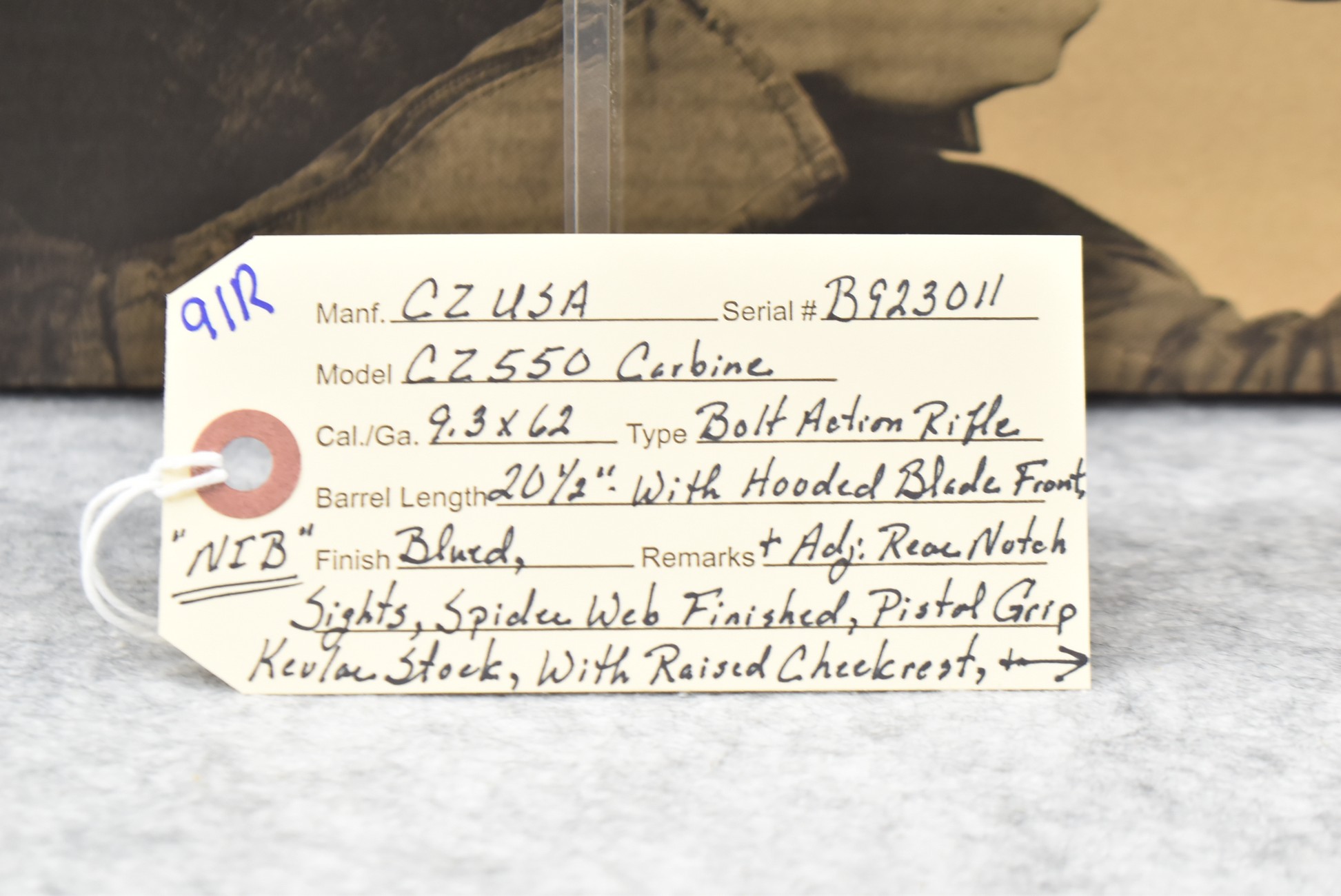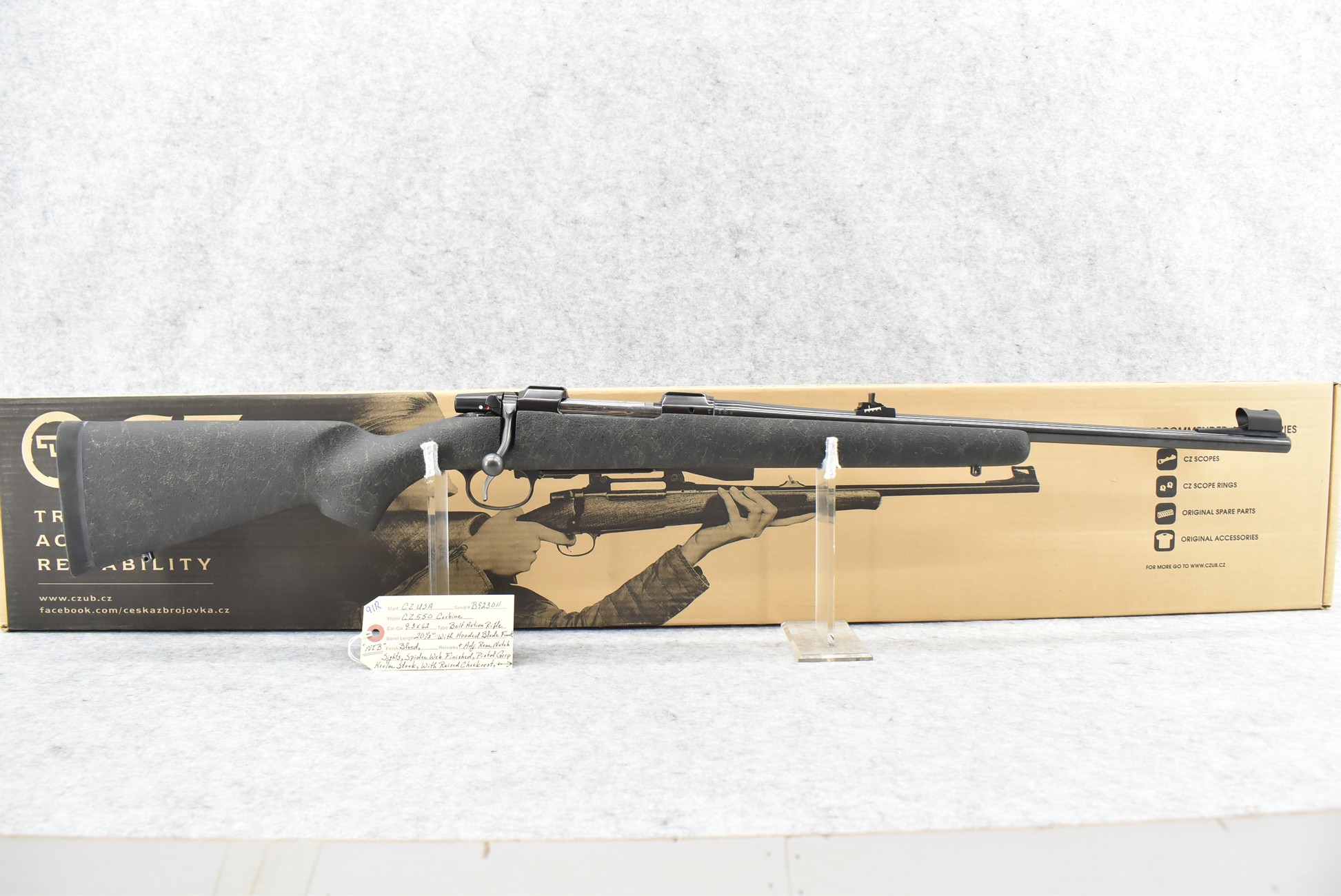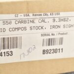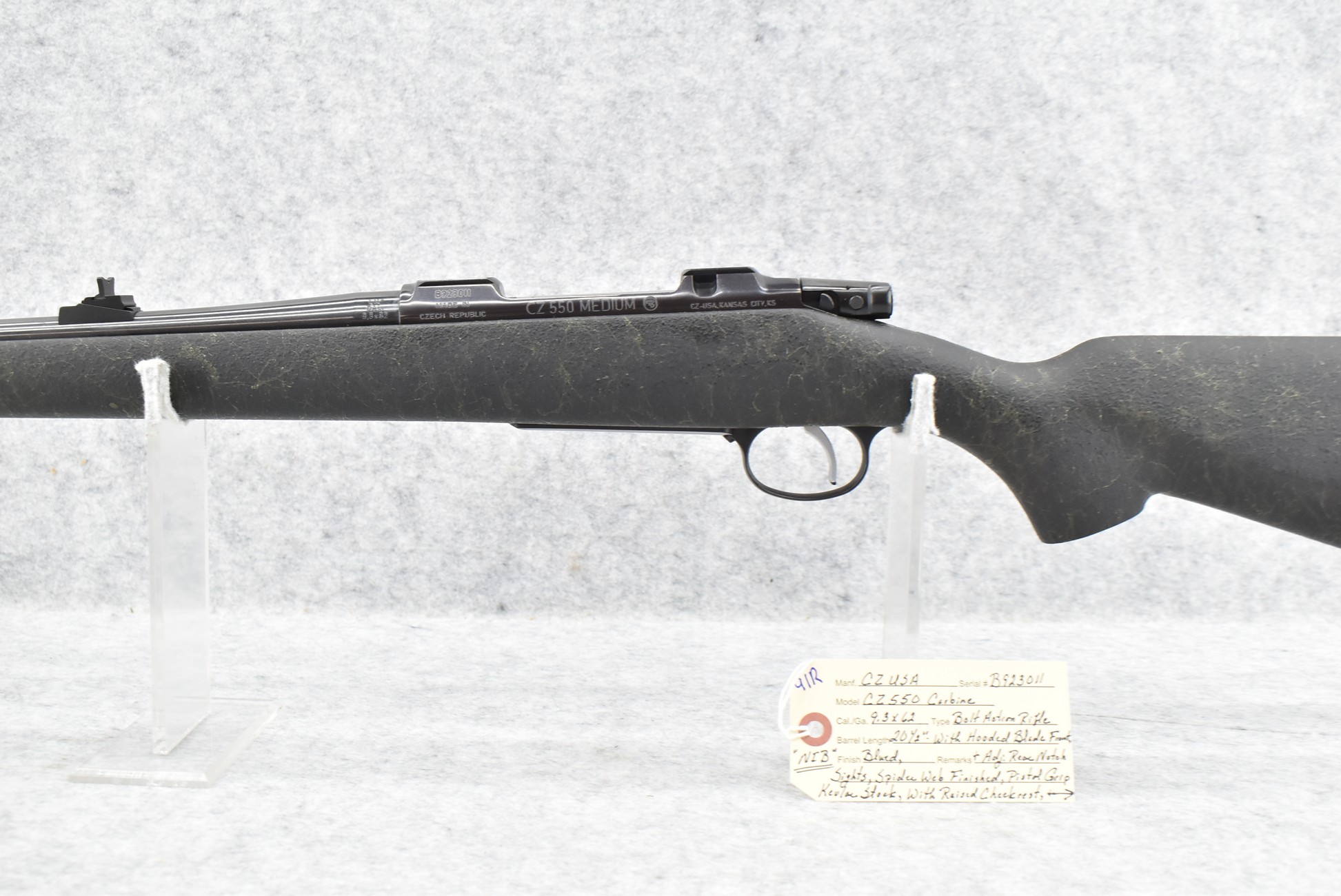 91R. CZ-USA – Mod. CZ550 Carbine – 9.3×62 Cal. Bolt Action Rifle – w/20 ½” Barrel w/Hooded Blade Front & Adj. Rear Notch Sights – Blued Finish – w/Spider Web Finished Pistol Grip Kevlar Stock w/Butt Pad – New w/Factory Box & Manual