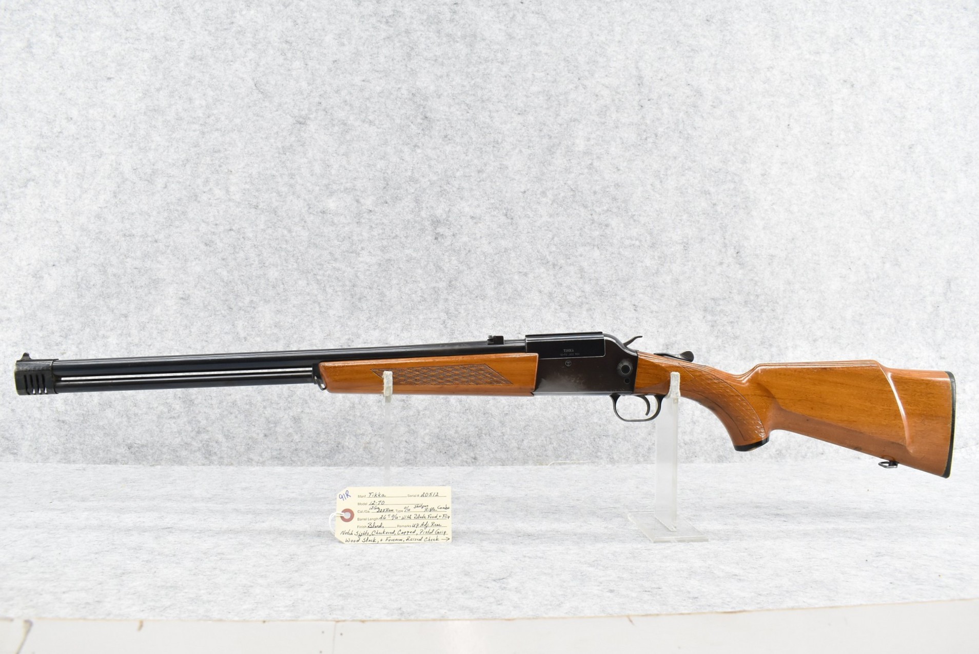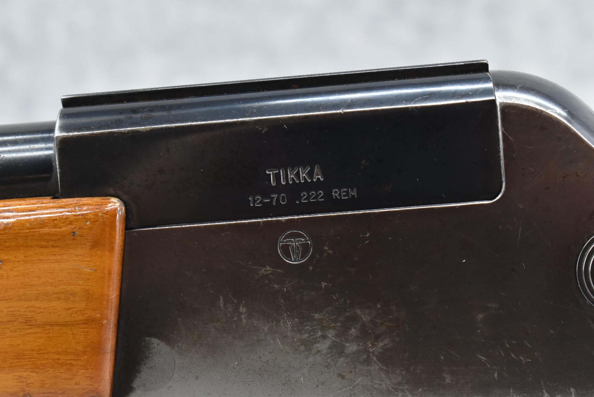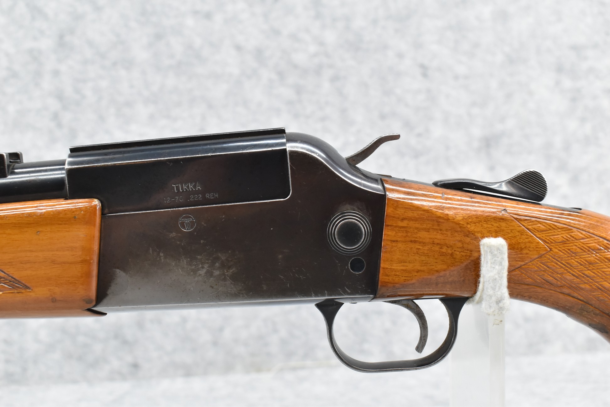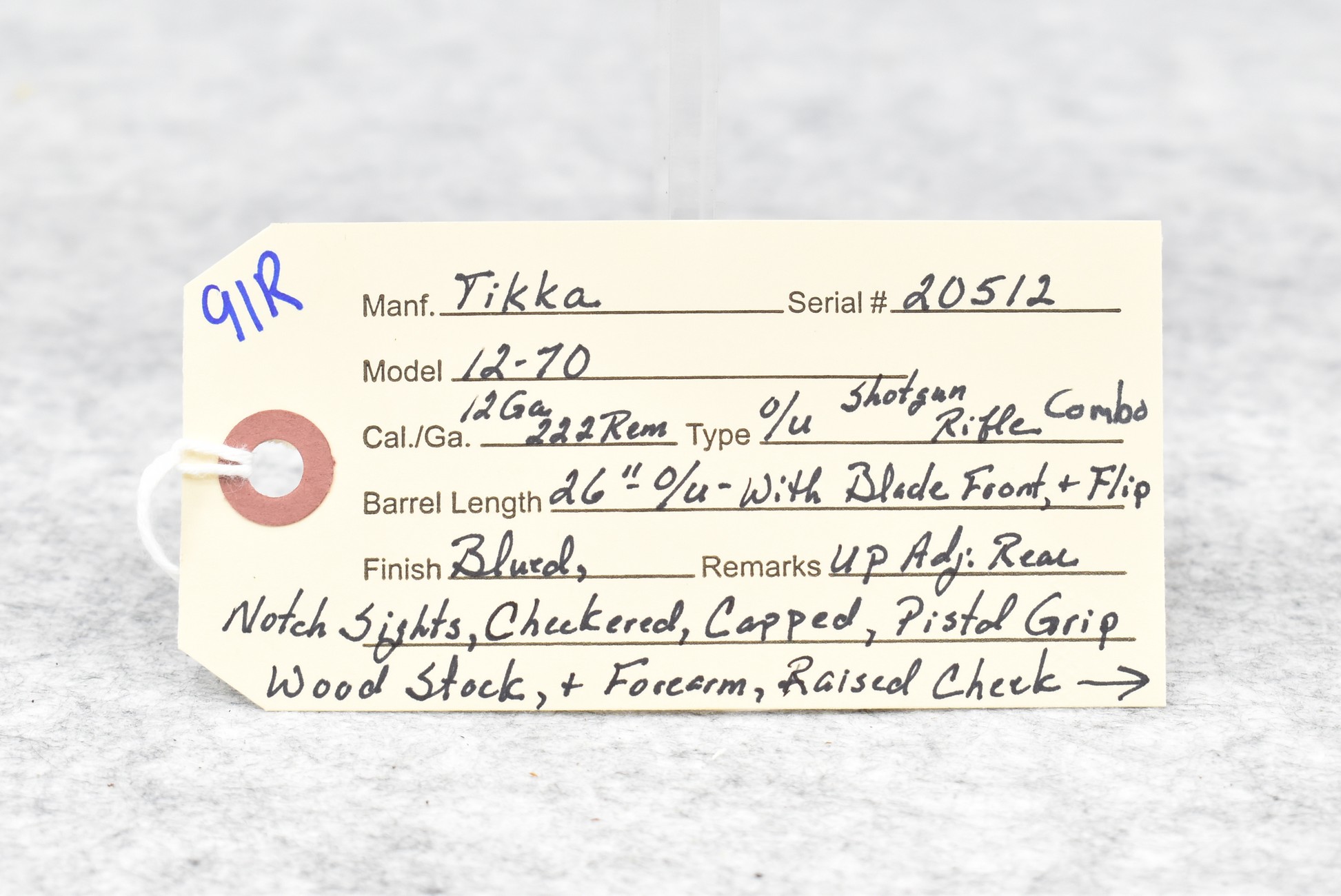 91R. Tikka – Mod. 12-70 – 12ga. Over 222 Rem. Cal. Over-Under Shotgun/Rifle Combo – w/26” Barrels w/Blade Front & Flip Up Adj. Rear Notch Sights – Blued Finish – w/Checkered Capped Pistol Grip Wood Stocks w/Raised Cheek Piece w/Factory Butt Plate – w/Round Button Barrel Selector