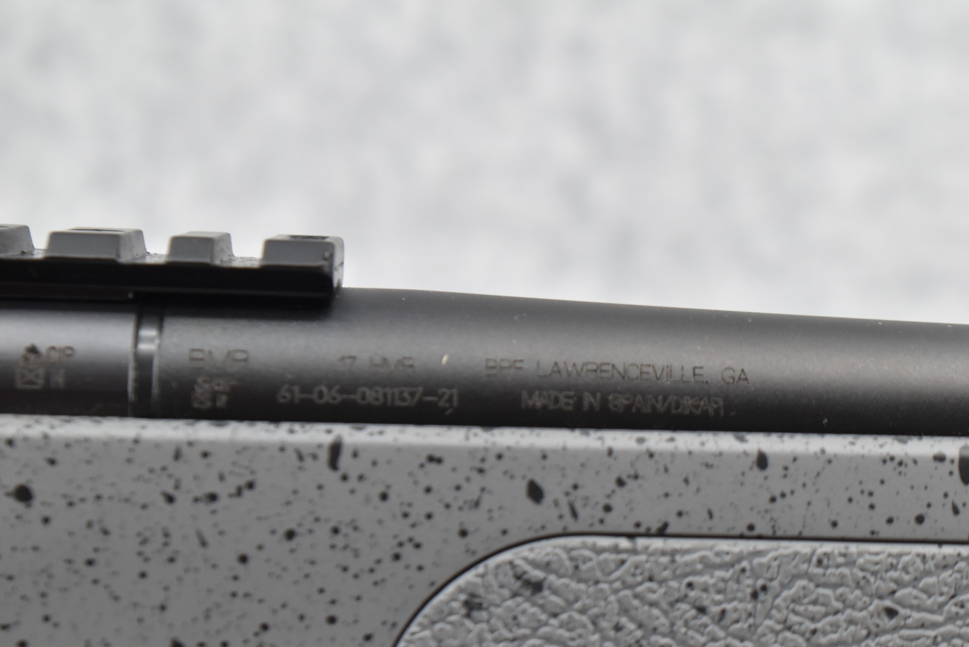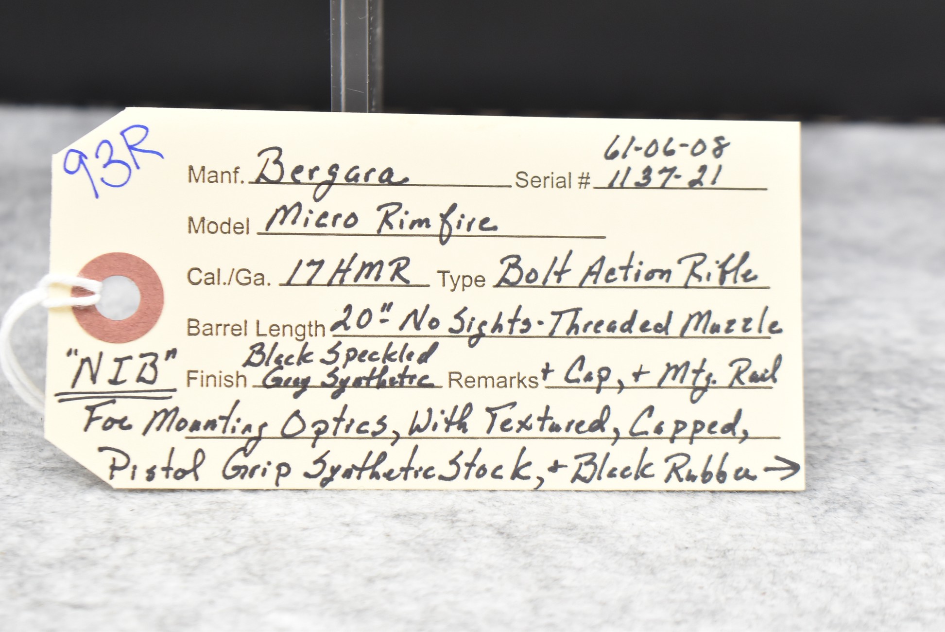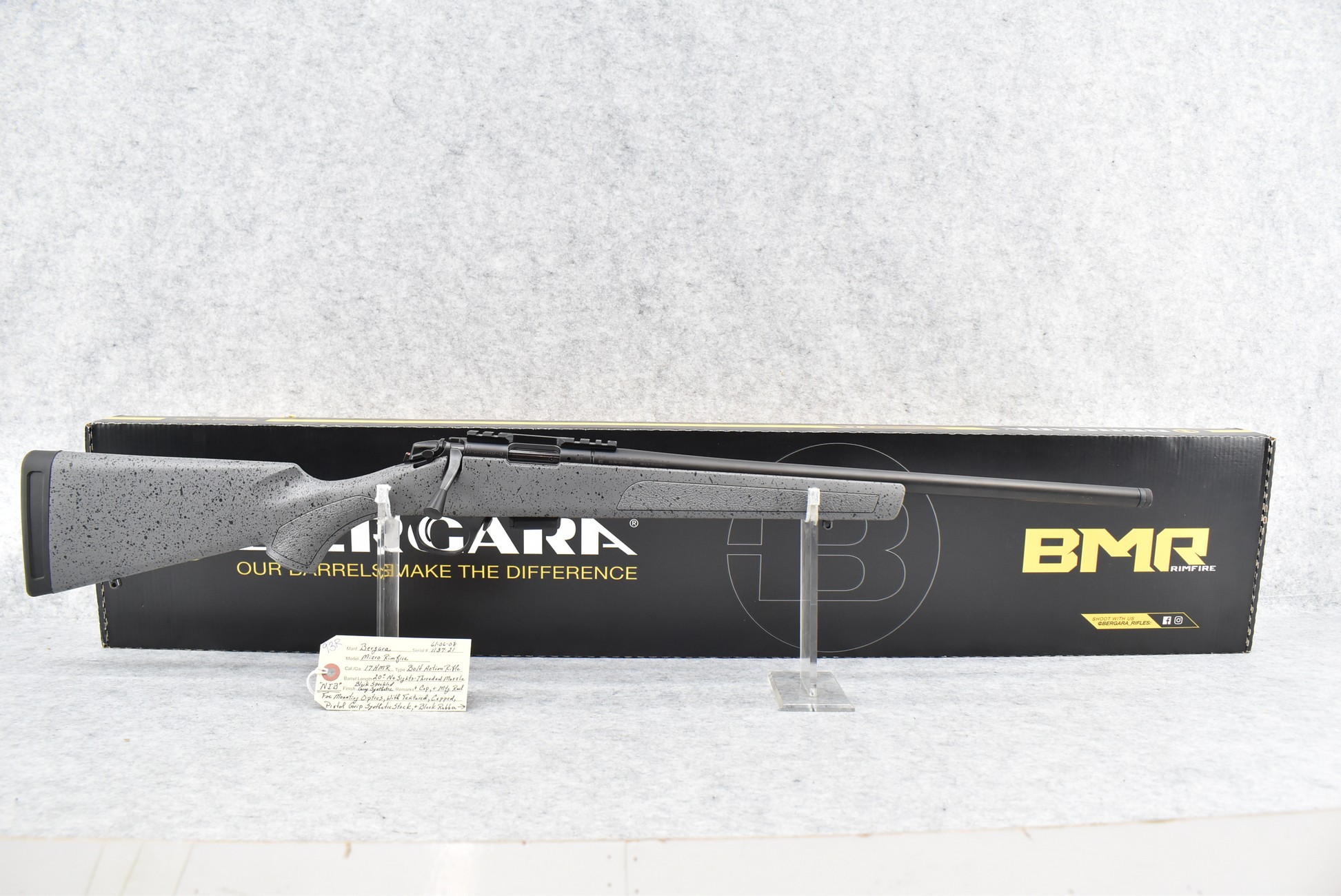 93R. Bergara – Mod. Micro Rimfire – 17 HMR Cal. Bolt Action Rifle – w/20” Barrel w/Threaded Muzzle & Cap (No Sights) – Matte Blued Finish – w/Black Speckled Gray Synthetic Finish Textured Capped Pistol Grip Synthetic Stock w/Butt Pad – w/2 Factory Detachable Mags – w/Mounting Rail for Optics – Unfired w/Box & Manuals