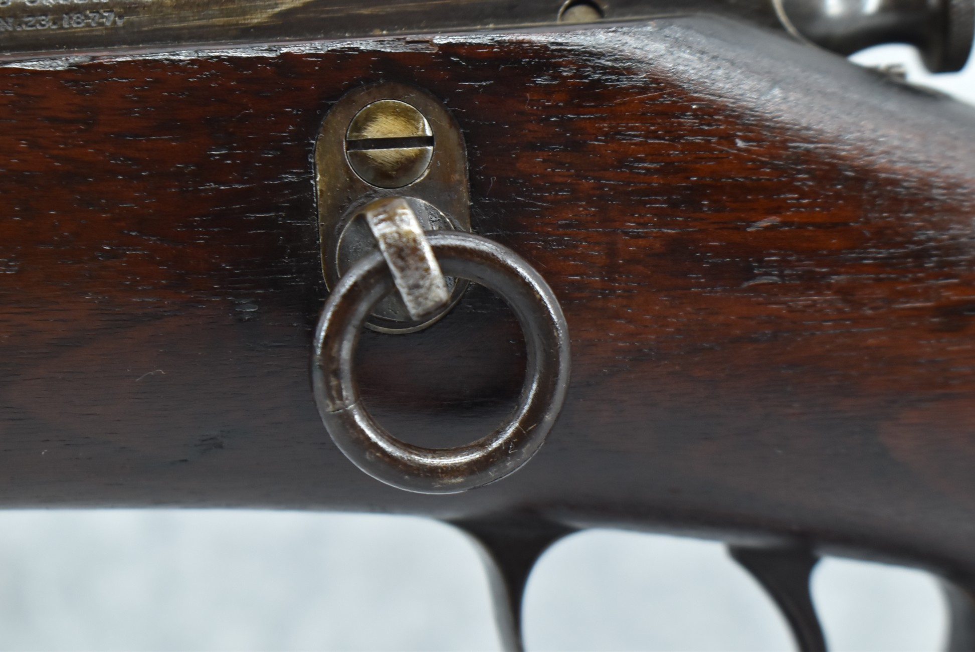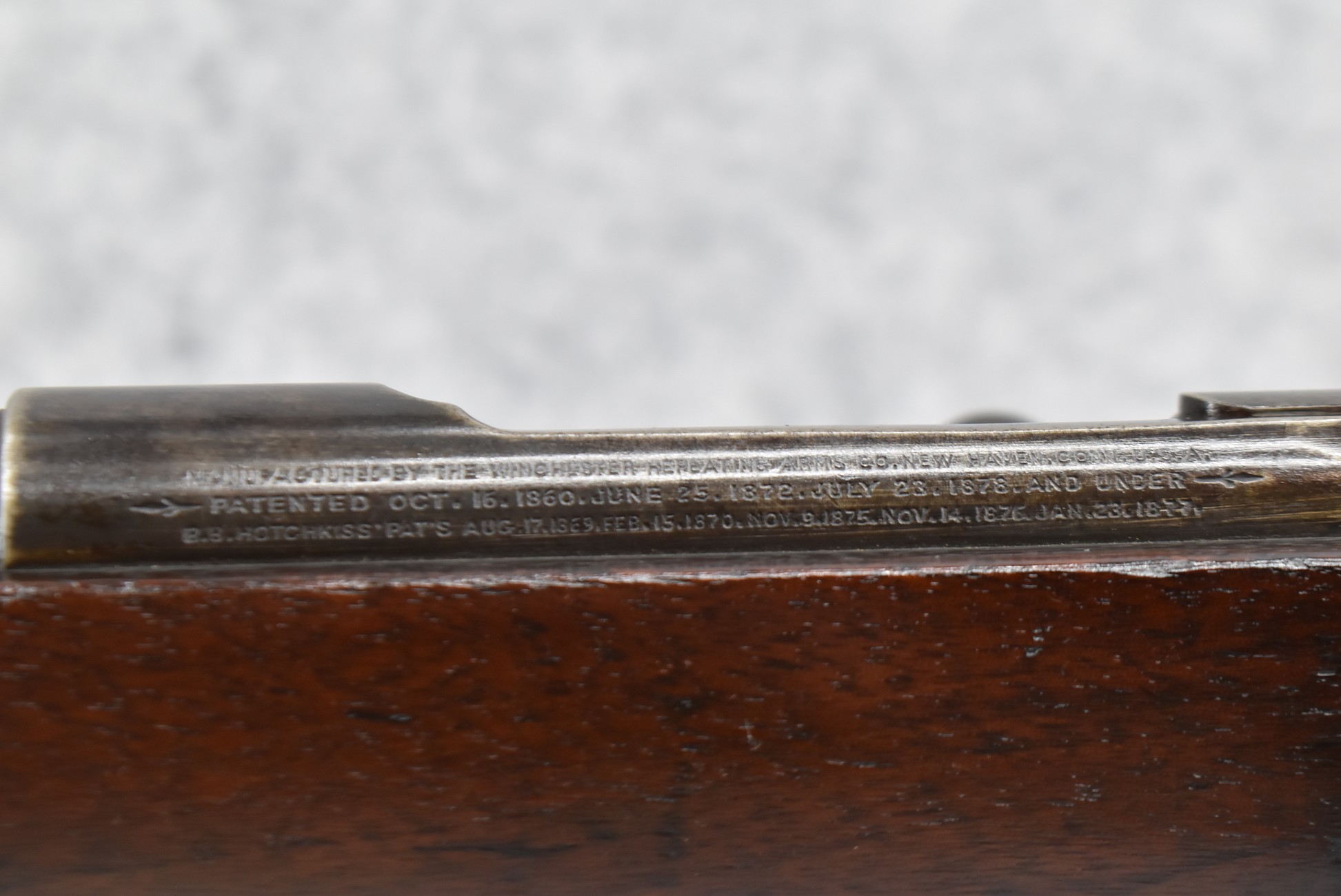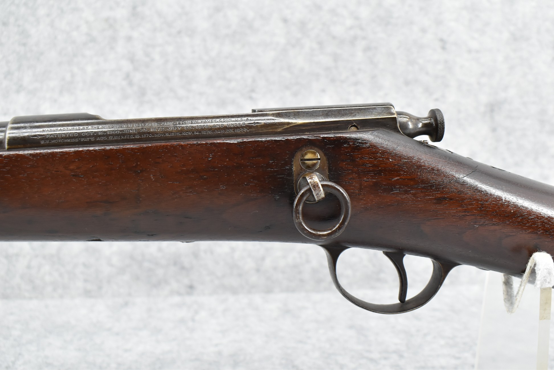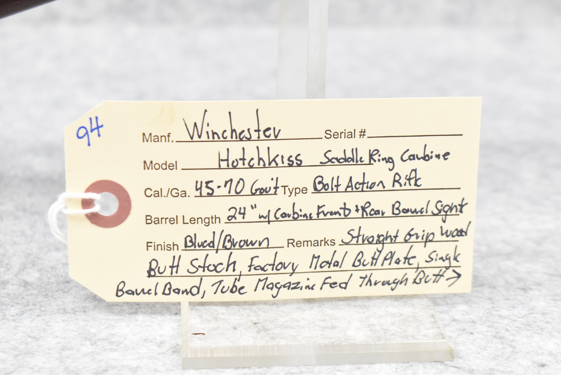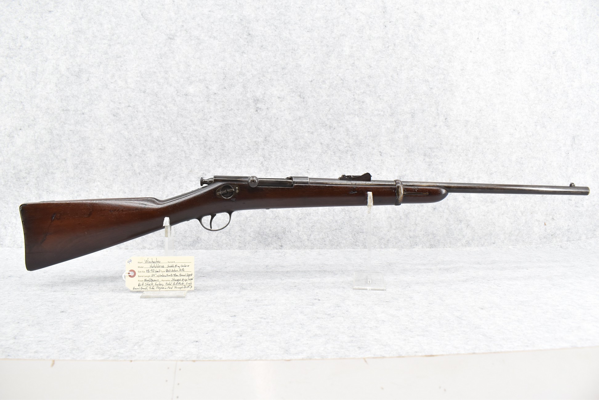 94. Winchester – Mod. Hotchkiss Saddle Ring Carbine – 45-70 Gov’t Cal. Bolt Action Rifle – w/24” Barrel w/Carbine Front & Rear Barrel Sights – Blued/Brown Finish – w/Straight Grip Wood Butt Stock w/Factory Metal Butt Plate & Single Barrel Band – w/Tube Magazine Fed Through Butt Stock – w/Magazine Cut Off