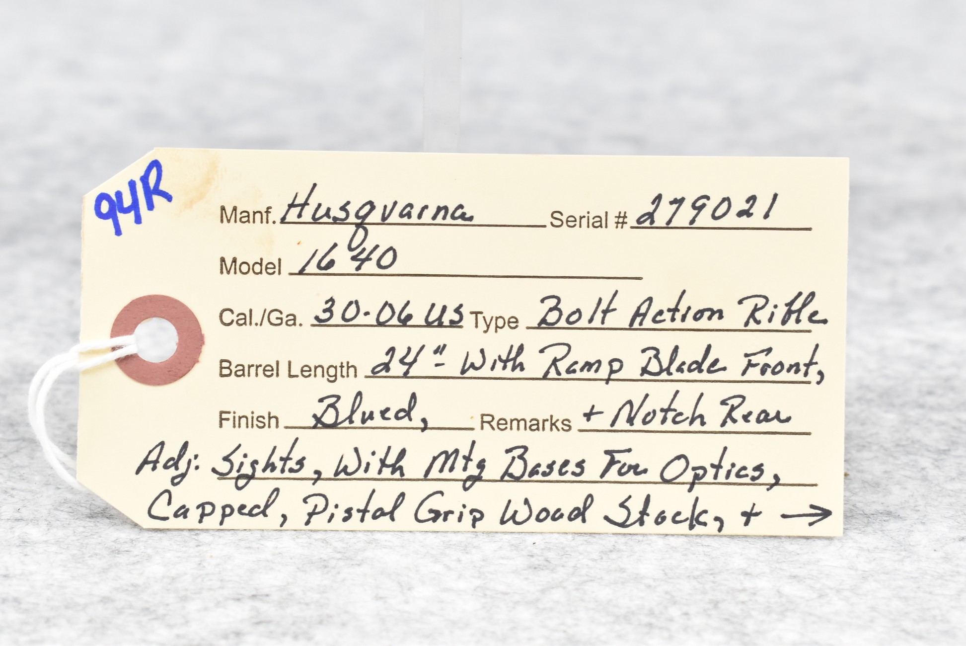 94R. Husqvarna – Mod. 1640 – 30-06 US Cal. Bolt Action Rifle – w/24” Barrel w/Ramp Blade Front & Notch Rear Adj. Sights – Blued Finish – w/Capped Pistol Grip Wood Stock w/Factory Butt Plate – w/Scope Bases