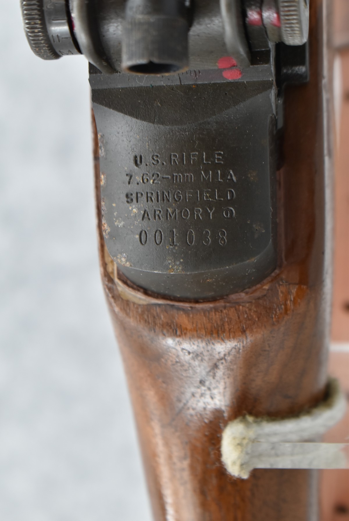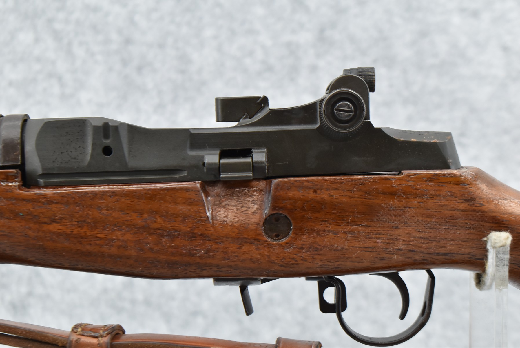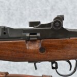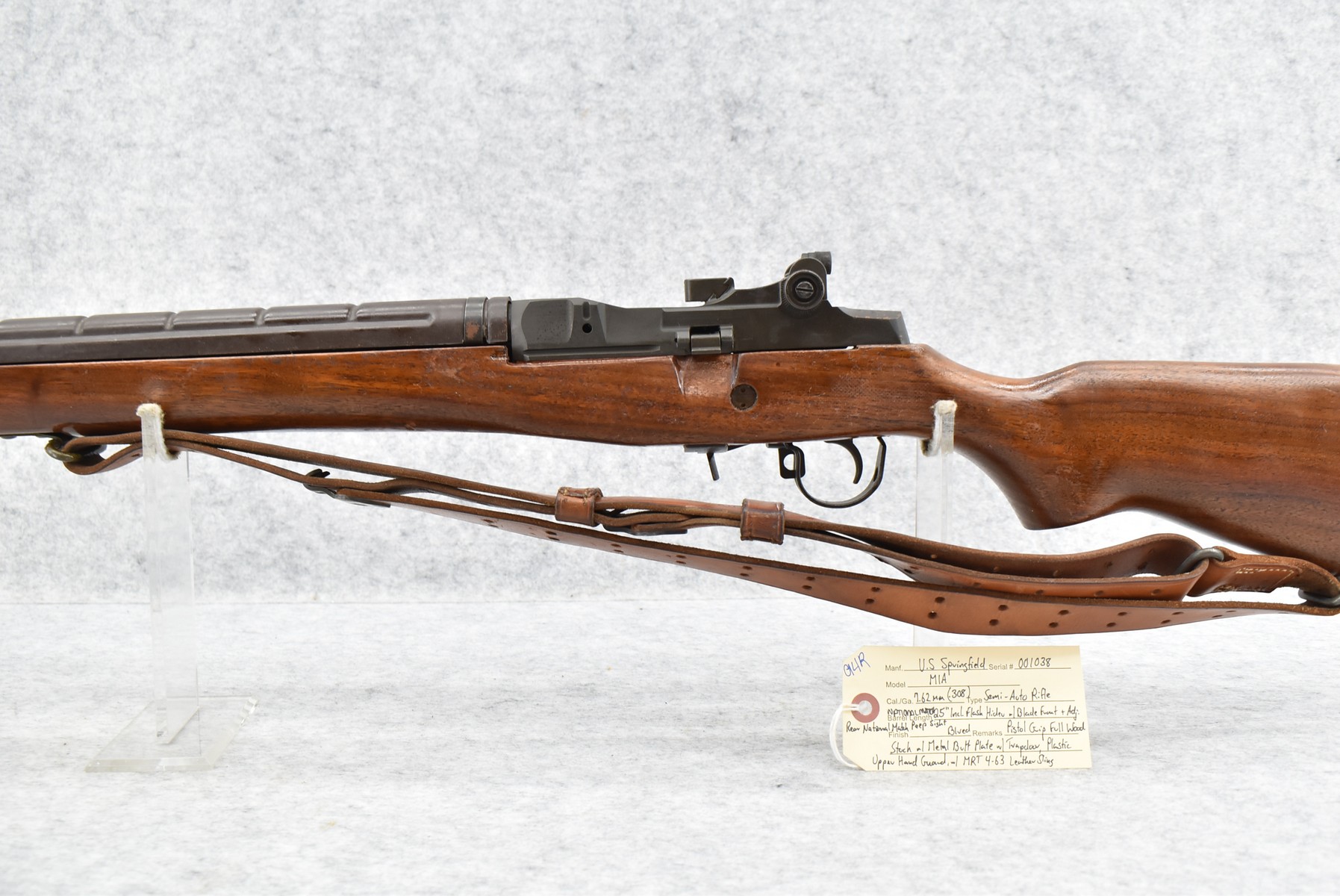 94R. U.S. Springfield – Mod. M1A – 7.62mm (308) Cal. Semi-Auto Rifle – w/25” National Match Barrel Including Flash Hider w/Blade Front & Adj. Rear National Match Peep Sight – Blued Finish – w/Pistol Grip Full Wood Stock w/Metal Butt Plate w/Trap Door & Plastic Upper Hand Guard – w/MRT 4-63 Leather Sling (CANNOT GO TO MARYLAND!)