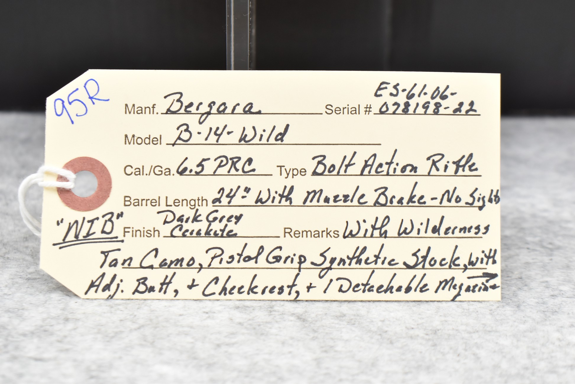95R. Bergara – Mod. B-14 Wilderness – 6.5 PRC Cal. Bolt Action Rifle – w/24” Gray Cerokate Finish Barrel w/Muzzle Brake (No Sights) – w/Wilderness Gray & Tan Camoed Pistol Grip Synthetic Stock w/Adj. Butt & Cheek Piece – w/Detachable Magazine – New w/Factory Box, Manual & Accessories