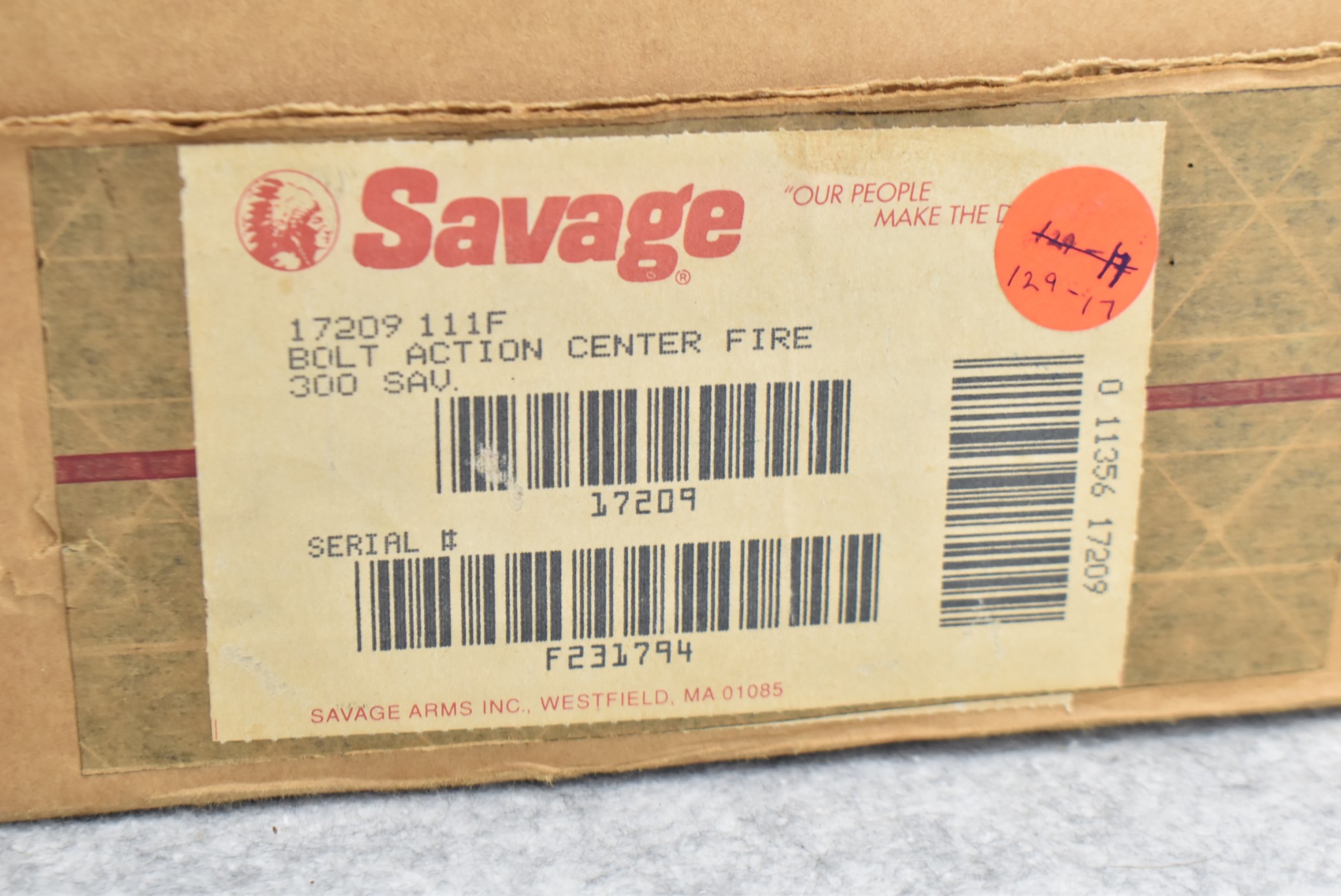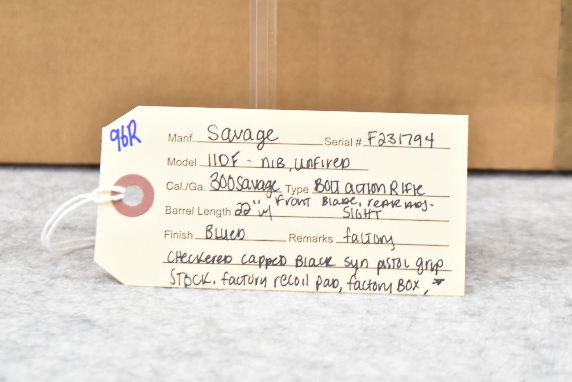 96R.       Savage – Mod. 110F – 300 Sav. Cal. Bolt Action Rifle – w/22” Barrel w/Front Blade & Rear Adj. Sights – Blued Finish – w/Factory Checkered Capped Black Synthetic Pistol Grip Stock w/Factory Recoil Pad – New & Unfired w/Factory Box & Manual – Mfg. Between 1989-1993, 300 Sav. Cal. Made in Very Little Quantities
