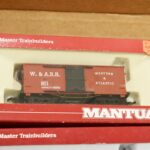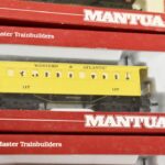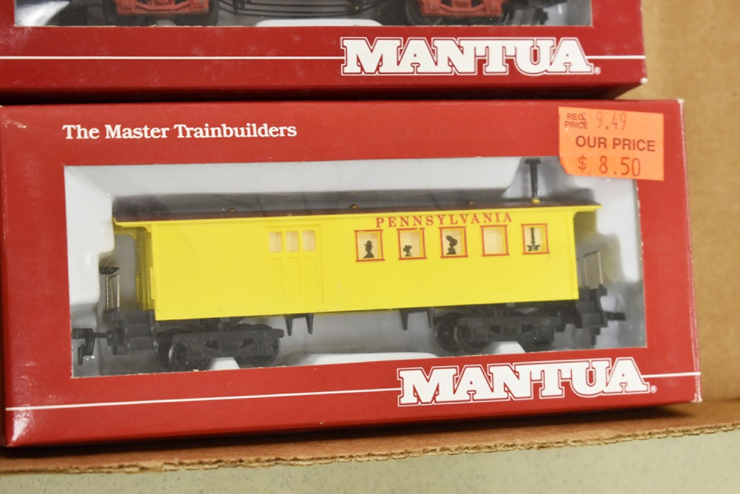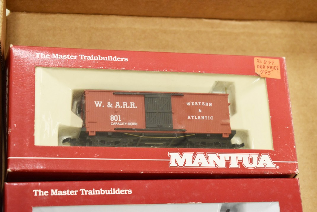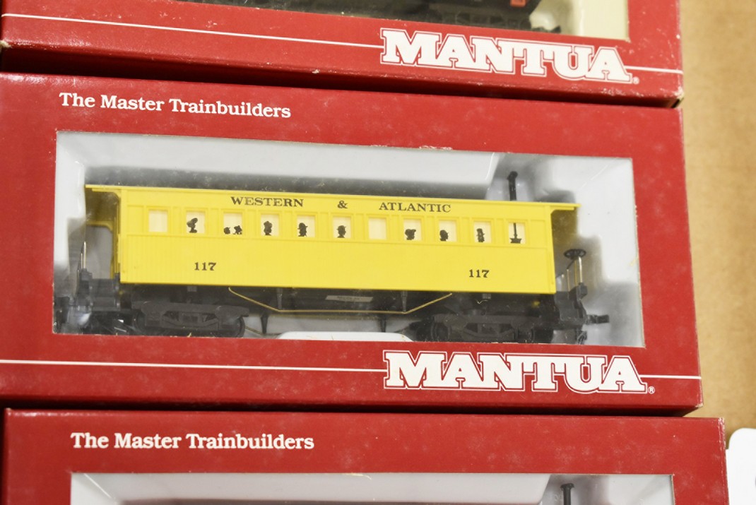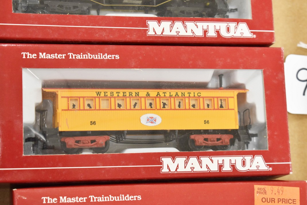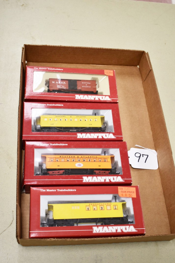 97. Lot of 4 Mantua Train Cars – Including 1860 Combine PRR 718-520, (2) 1860 Coach W&A Coach 717-544 1860 Box Cars, and Western & Atlantic 721-044 – All w/Boxes