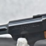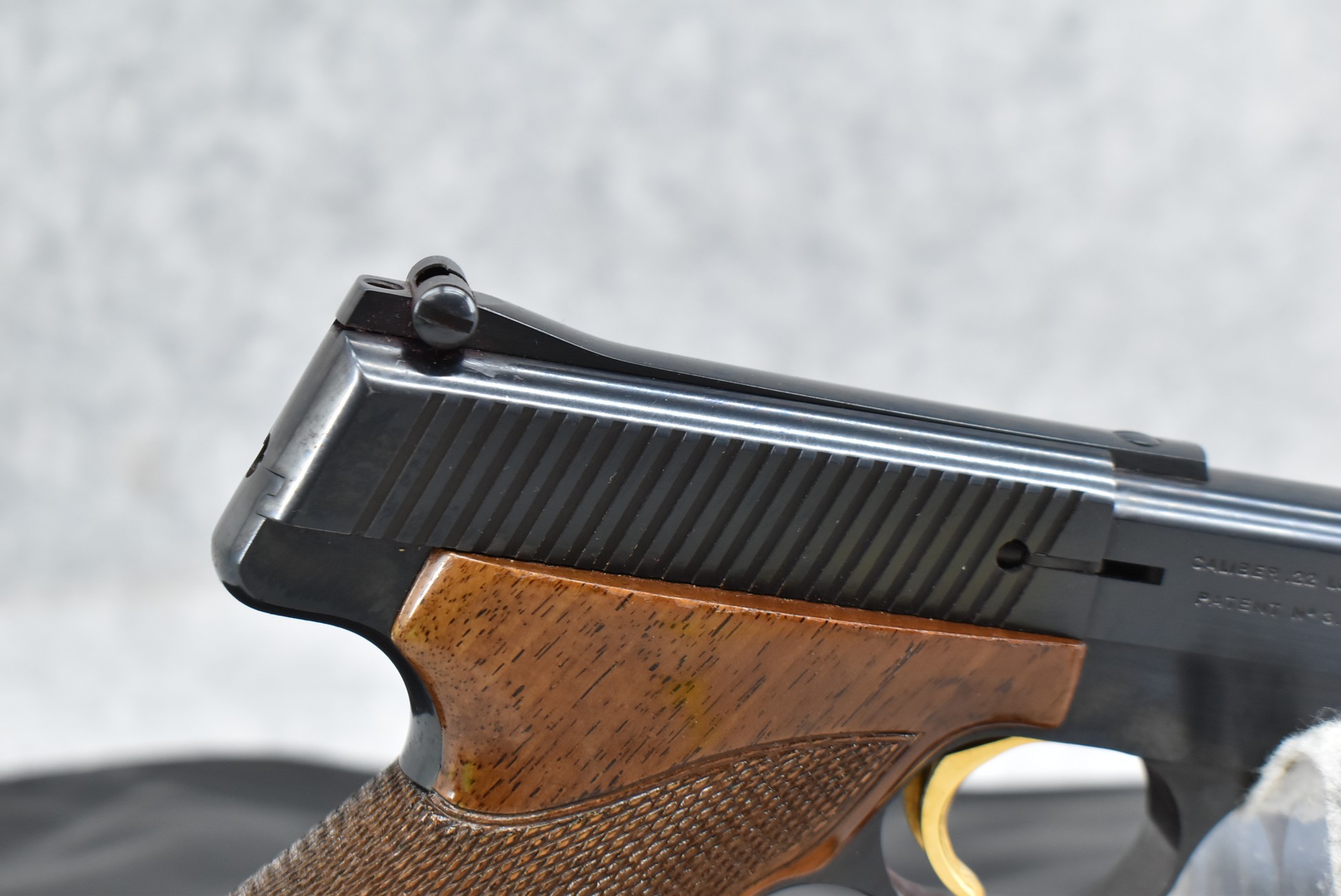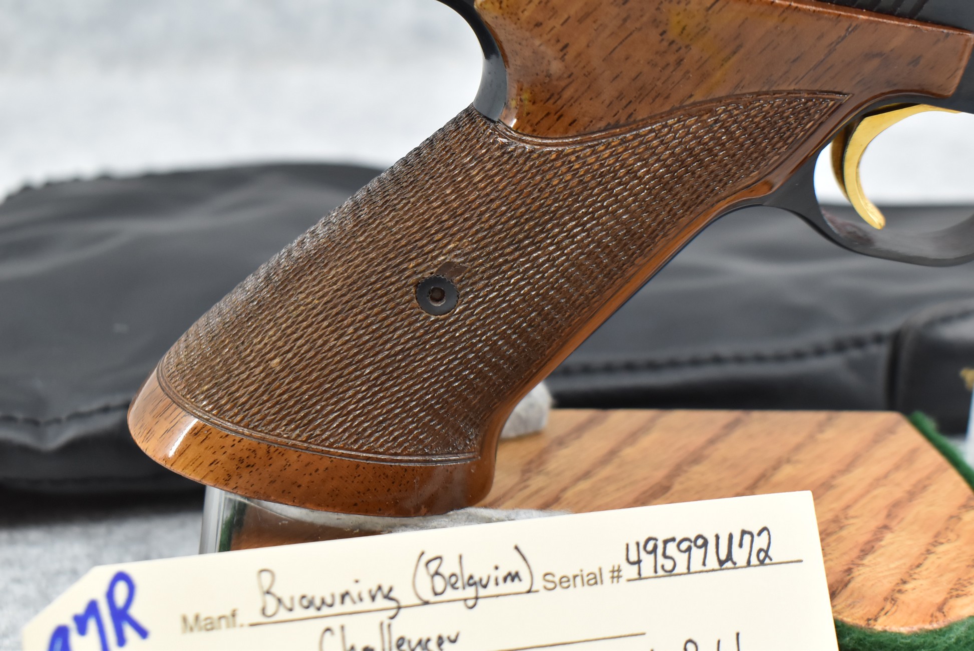 97R. Browning (Belgium) – Mod. Challenger – 22 Long Rifle Cal. Semi-Auto Pistol – w/6 ¾” Barrel w/Blade Front & Adj. Rear Sights – Blued Finish – w/Factory Checkered Wraparound Wood Grips – w/Factory Mag – w/Factory Soft Case