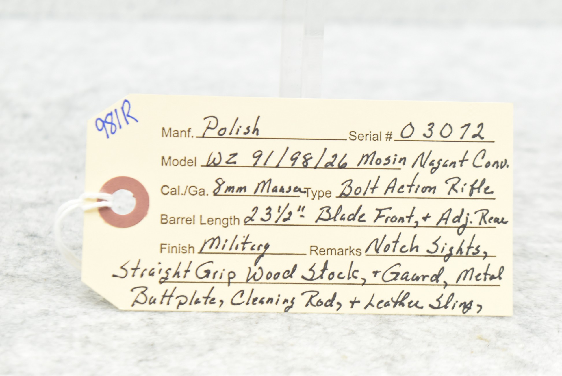 981R. Polish – Mod. WZ 91/98/26 Mosin-Nagant Conversion – 8mm Mauser Cal. Bolt Action Rifle – w/23 ½” Barrel w/Blade Front & Adj. Rear Notch Sights – Military Finish – w/Straight Grip Wood Stocks w/Metal Butt Plate – w/Leather Sling – w/Cleaning Rod