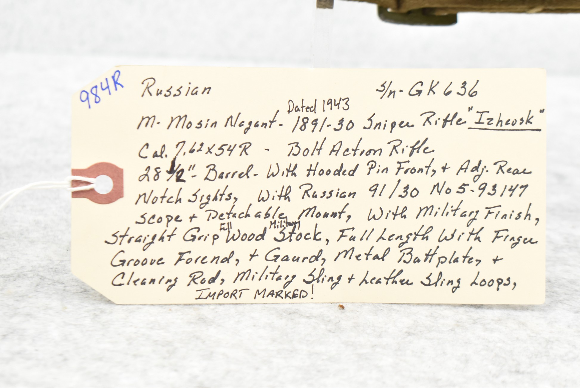 984R. Izhevsk (Russian) – Mosin-Nagant Mod. 1891-30 Sniper Rifle – 7.62x54R Cal. Bolt Action Rifle – w/28 ½” Barrel w/Hooded Pin Front & Adj. Rear Notch Sights – Military Finish – w/Straight Grip Full Wood Military Stock w/Finger Groove Forend & Guard w/Metal Butt Plate – w/Sling Loops – w/Leather Military Sling – w/Cleaning Rod – w/Russian 91/30 No. 5-93147 Scope & Detachable Mount – Dated 1943 – Import Marked!