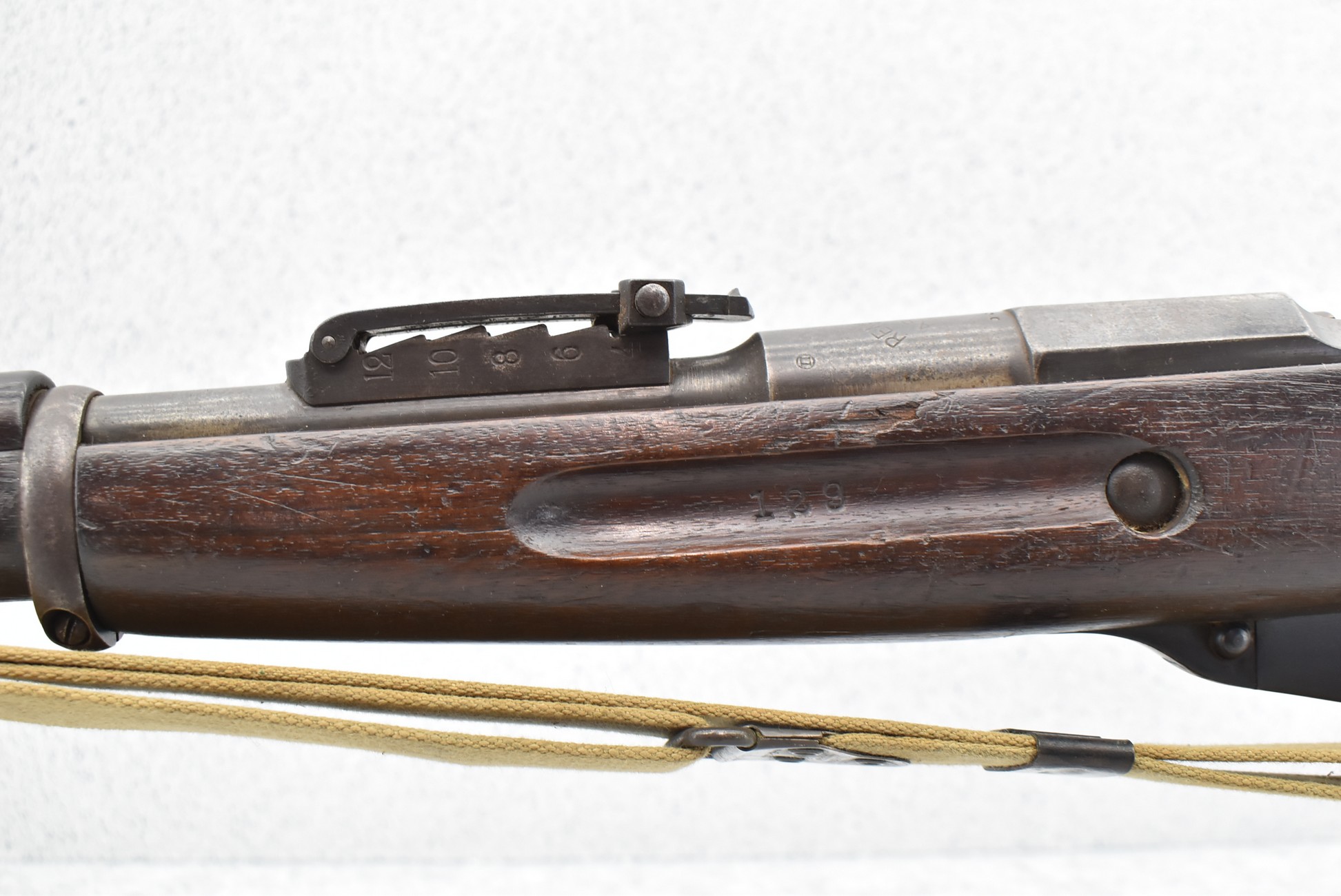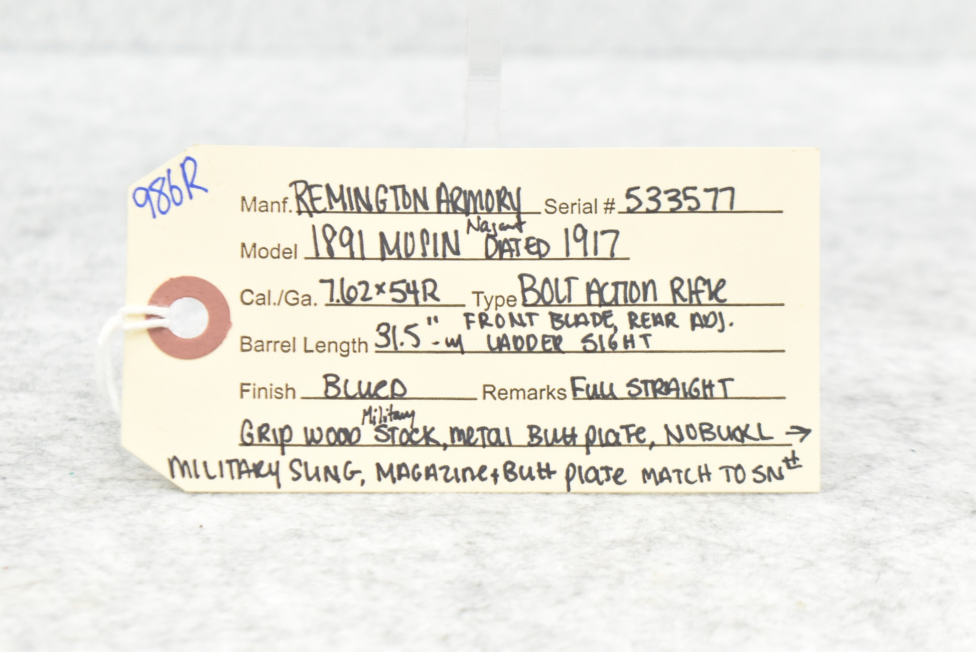 986R. Remington Armory – Mosin-Nagant Mod. 1891 – 7.62x54R Cal. Bolt Action Rifle – w/31.5” Barrel w/Front Blade & Rear Adj. Ladder Sights – Blued Finish – w/Full Straight Grip Wood Military Stock w/Metal Butt Plate – w/NoBuckl Military Sling – Magazine & Butt Plate Numbers Match to Gun Serial Number – Dated 1917