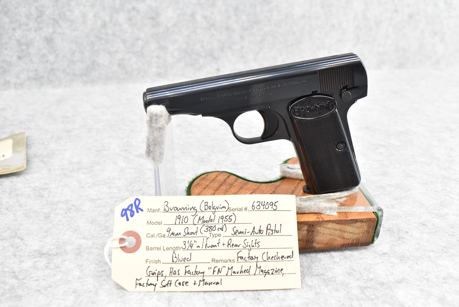 98R. Browning (Belgium) – Mod. 1910 (Model 1955) – 9mm Short (380 ACP) Cal. Semi-Auto Pistol – w/3 ¼” Barrel w/Front & Rear Sights – Blued Finish – w/Factory Checkered Grips – w/Factory “FN” Marked Magazine – w/Factory Soft Case & Manual