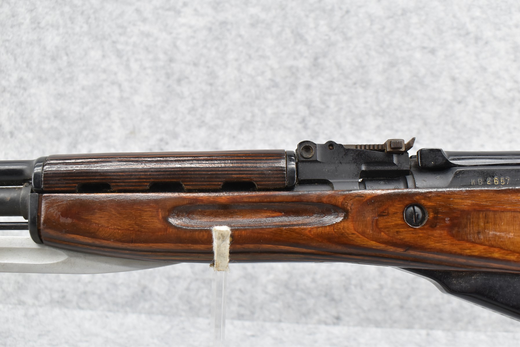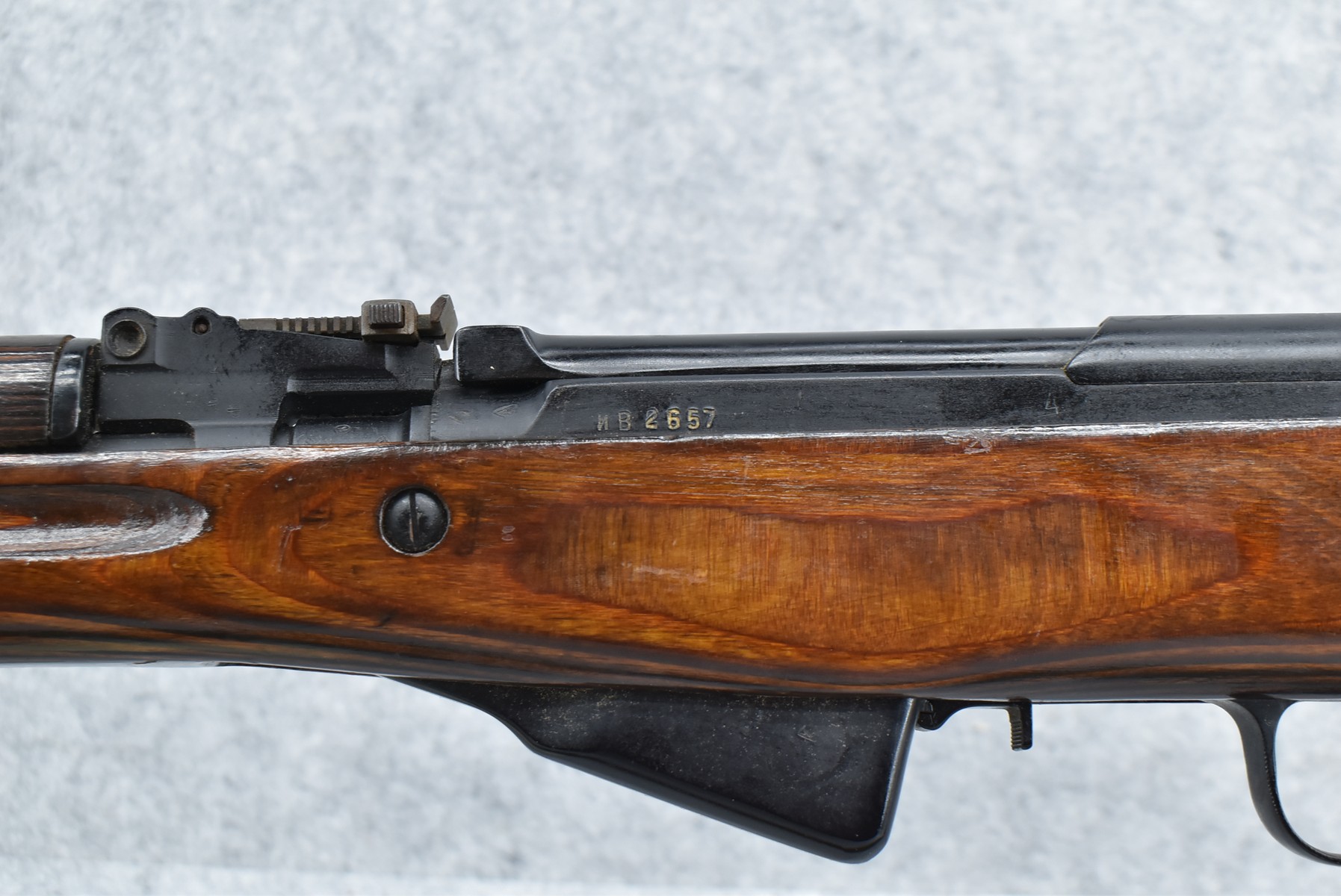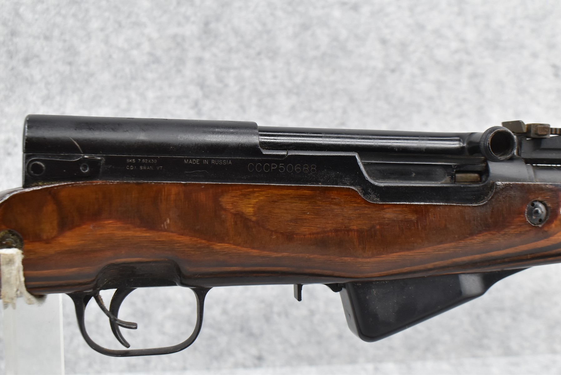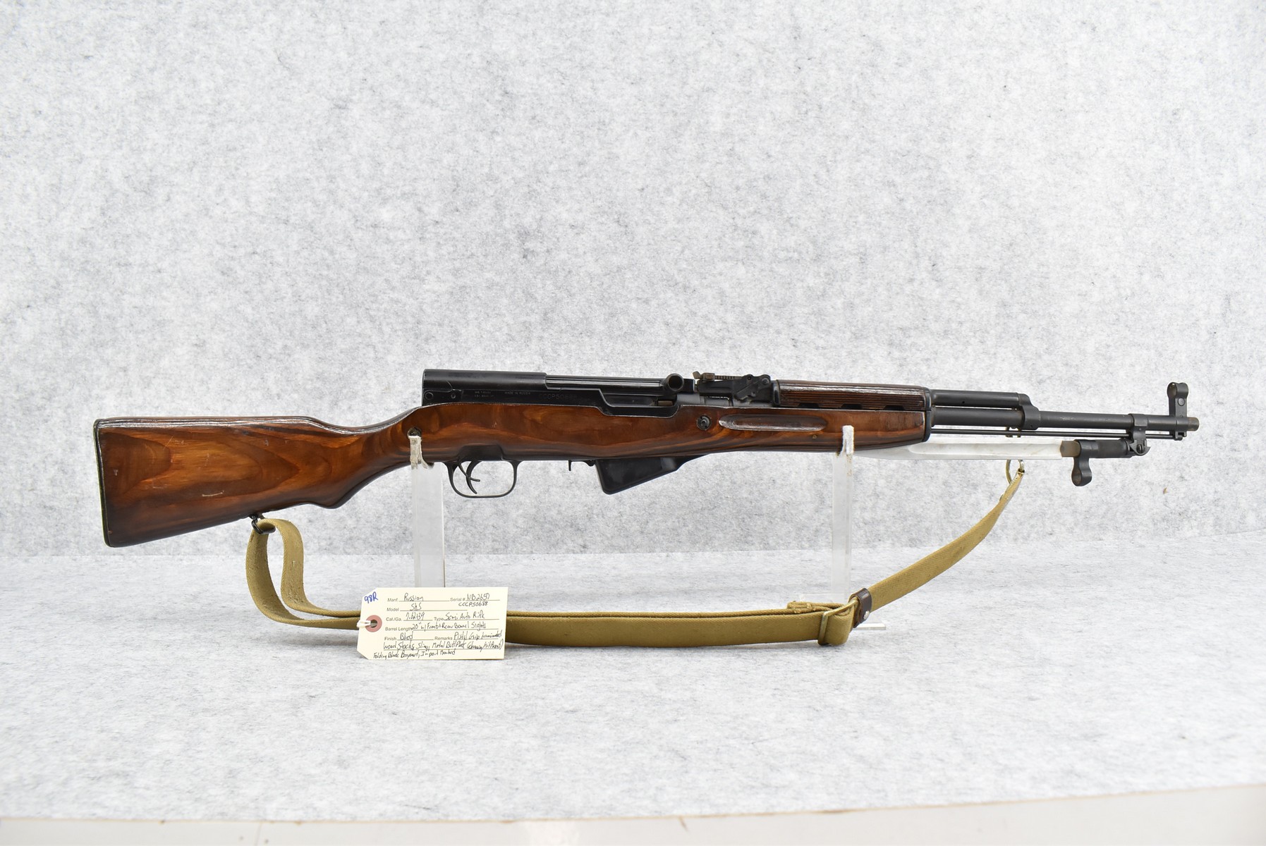 98R.       Russian – Mod. SKS – 7.62×39 Cal. Semi-Auto Rifle – w/20” Barrel w/Front & Rear Barrel Sights – Blued Finish – w/Pistol Grip Laminated Wood Stocks w/Metal Butt Plate (Cleaning Kit Present) – w/Sling – w/Folding Blade Bayonet – Import Marked
