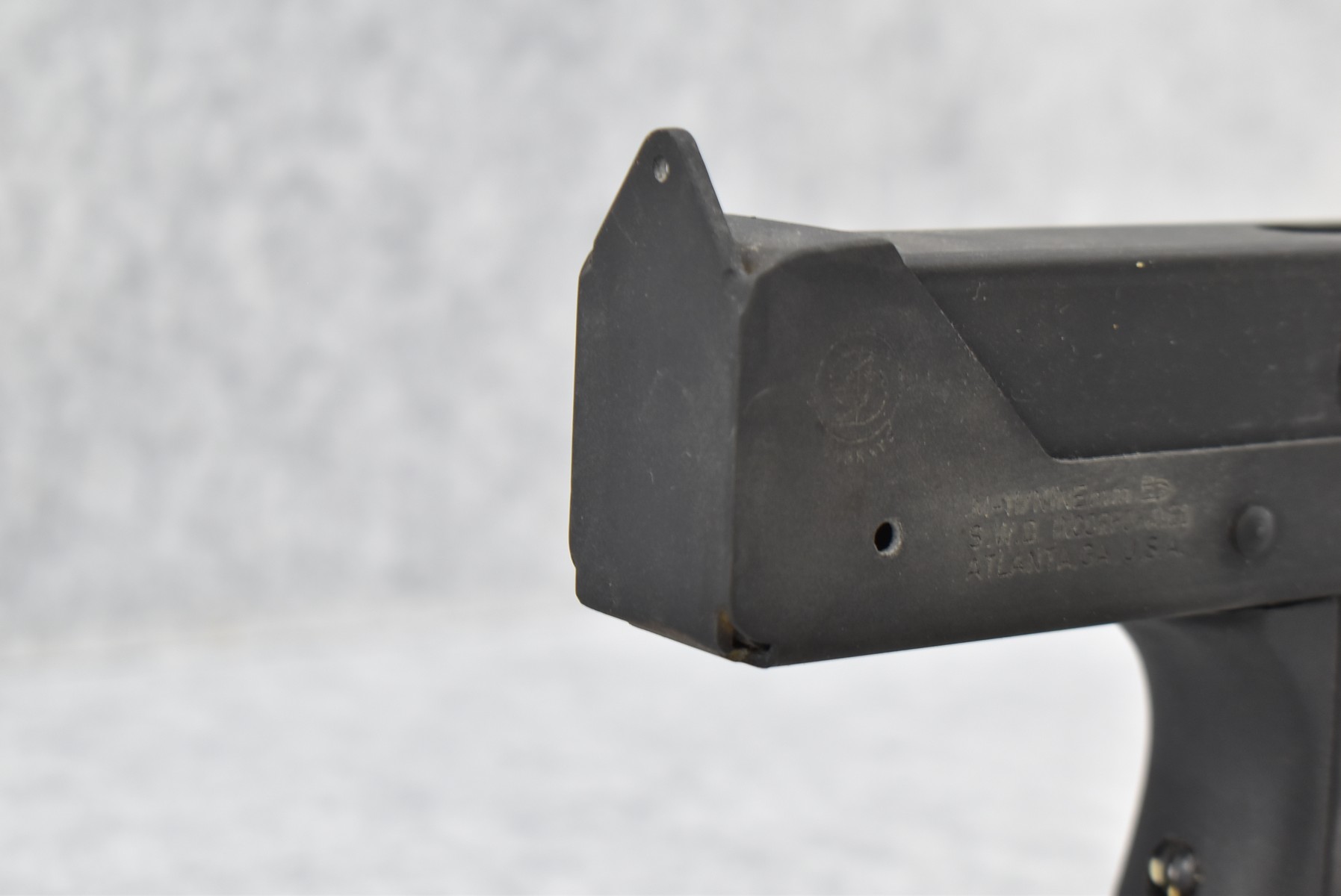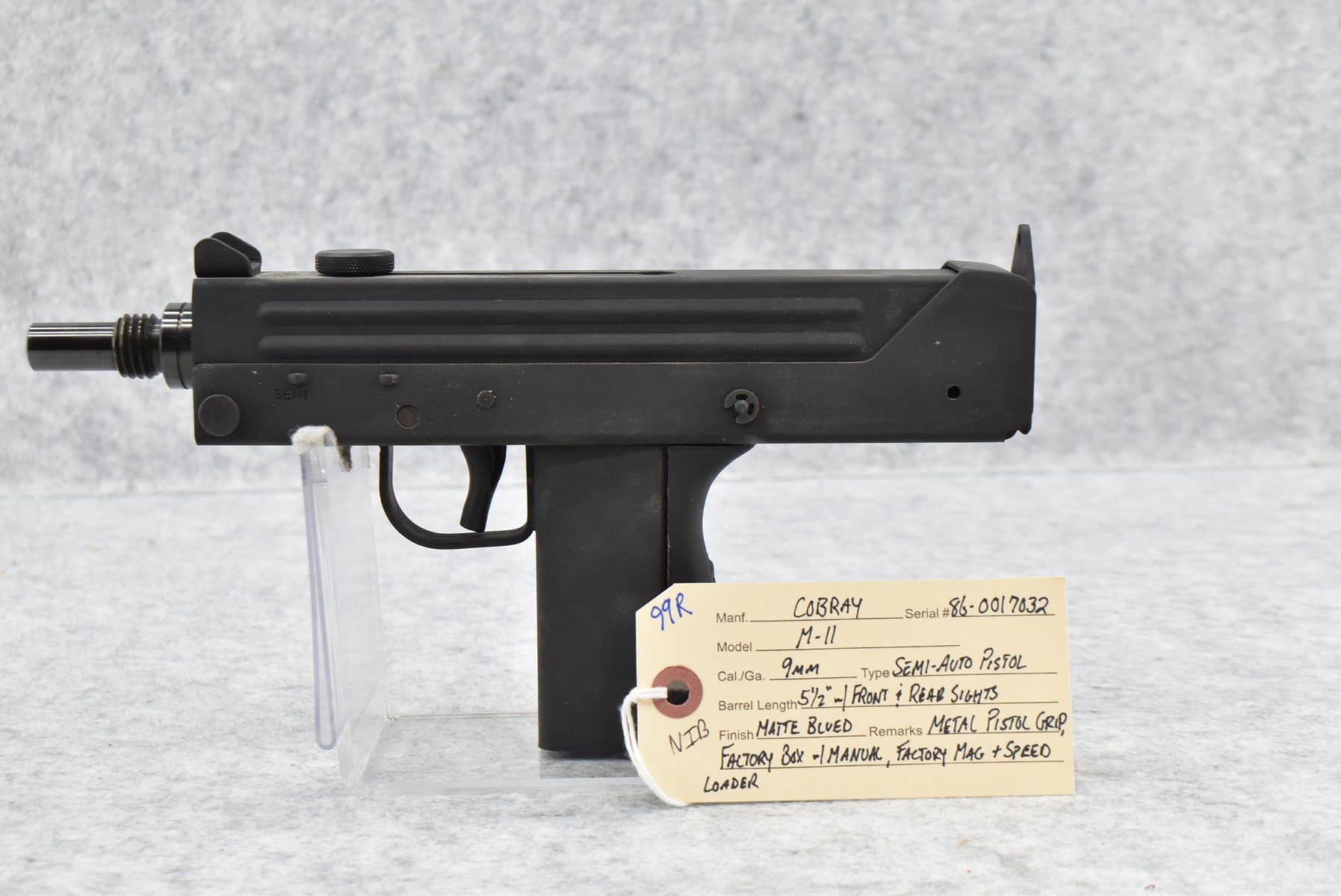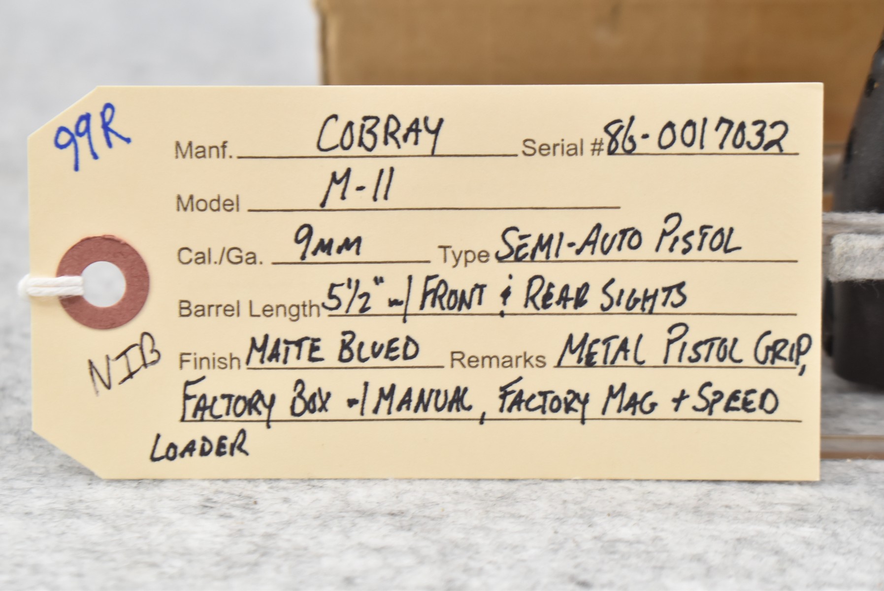 99R.       Cobray – Mod. M-11 – 9mm Cal. Semi-Auto Pistol – w/5 ½” Barrel w/Front & Rear Sights – Matte Blued Finish – w/Metal Pistol Grip – New w/Factory Box, Manual, Factory Mag & Speed Loader (CANNOT GO TO MARYLAND!)