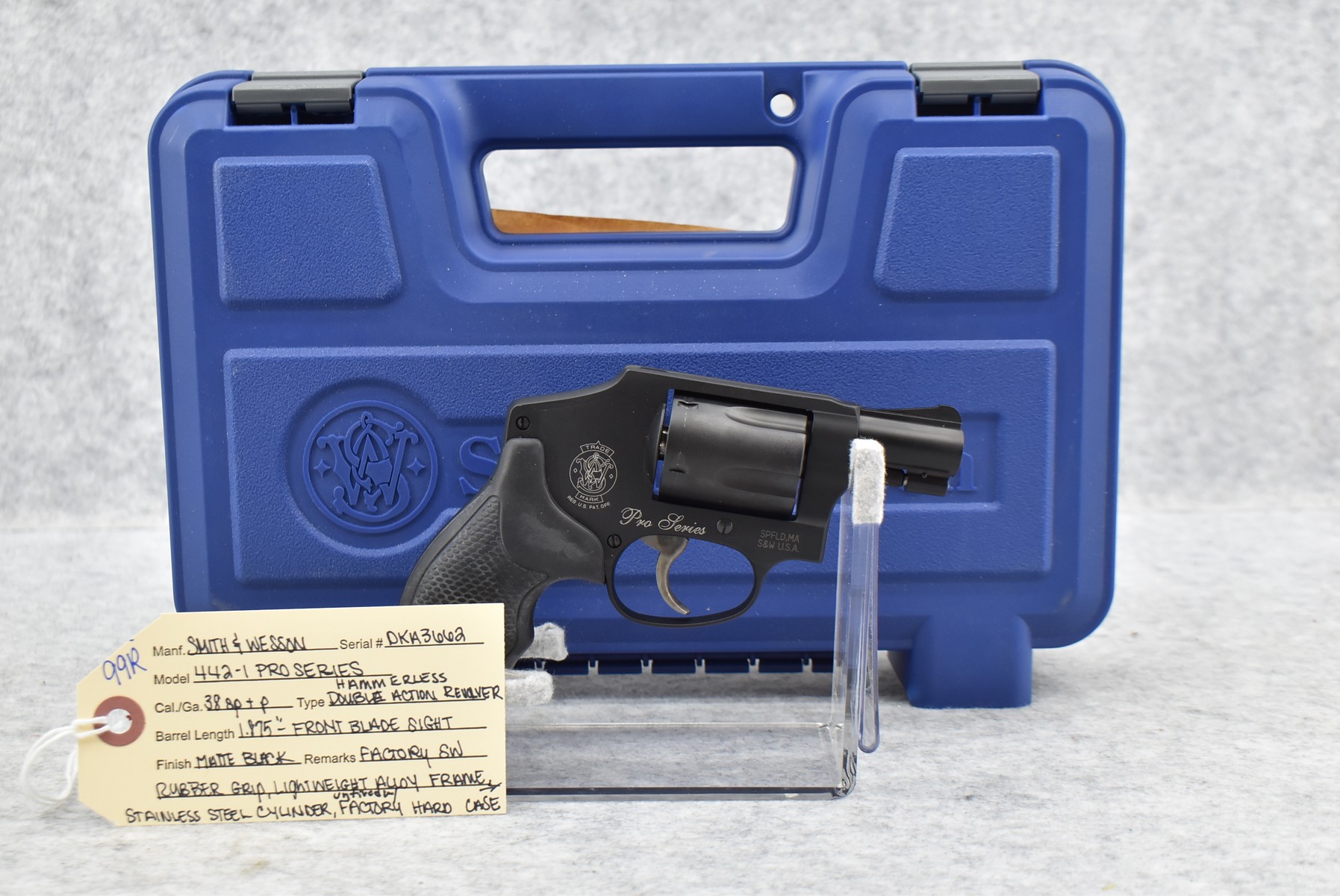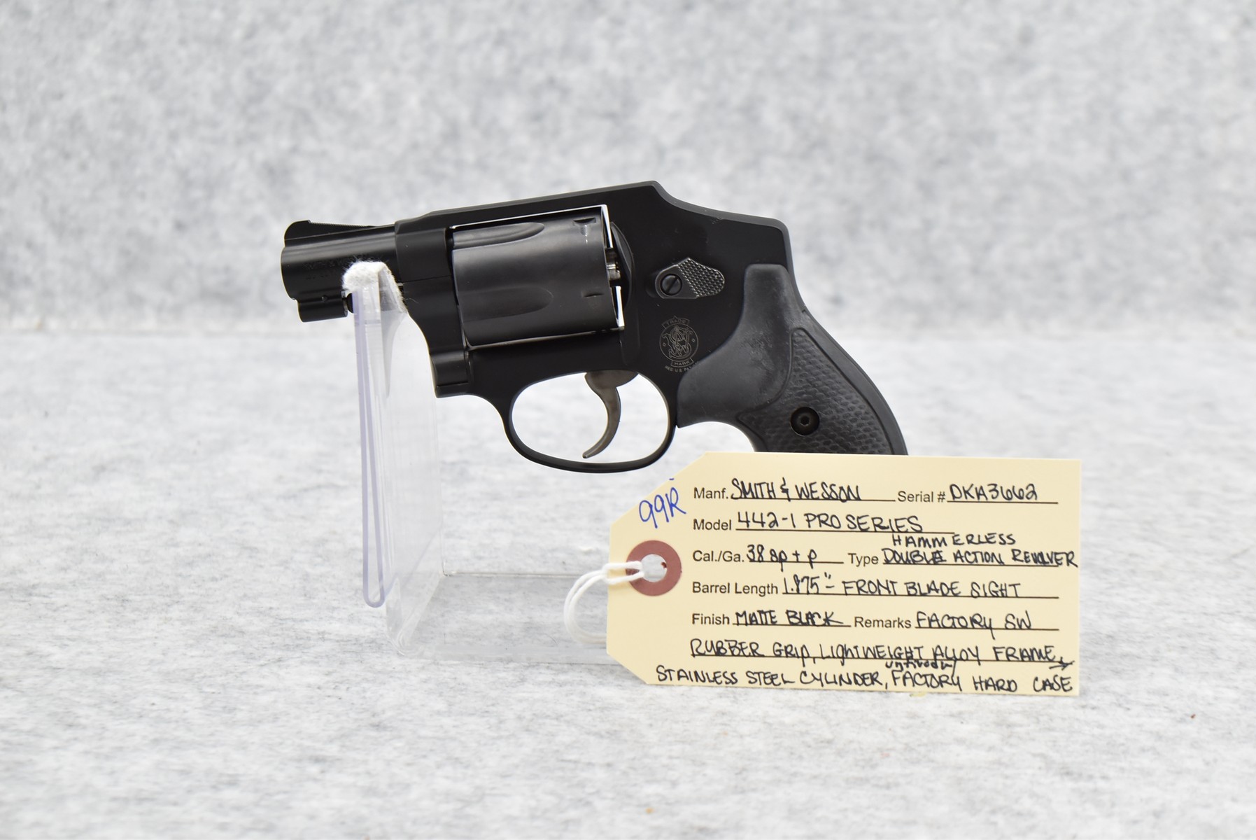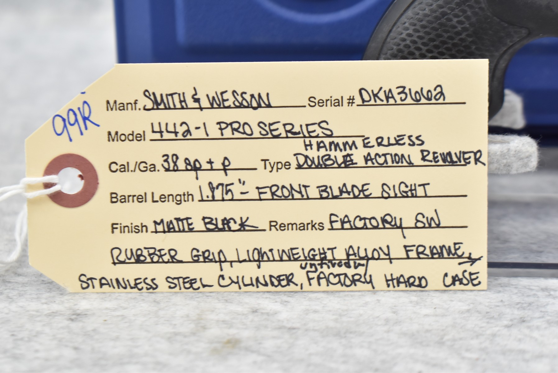 99R. Smith & Wesson – Mod. 442-1 Pro Series – 38 Spl. & P Cal. Hammerless Double Action Revolver – w/1.875” Barrel w/Front Blade Sight – Matte Black Finish – w/Factory Grips – Unfired w/Factory Hard Case, Moon Clips, Manual, and Lock