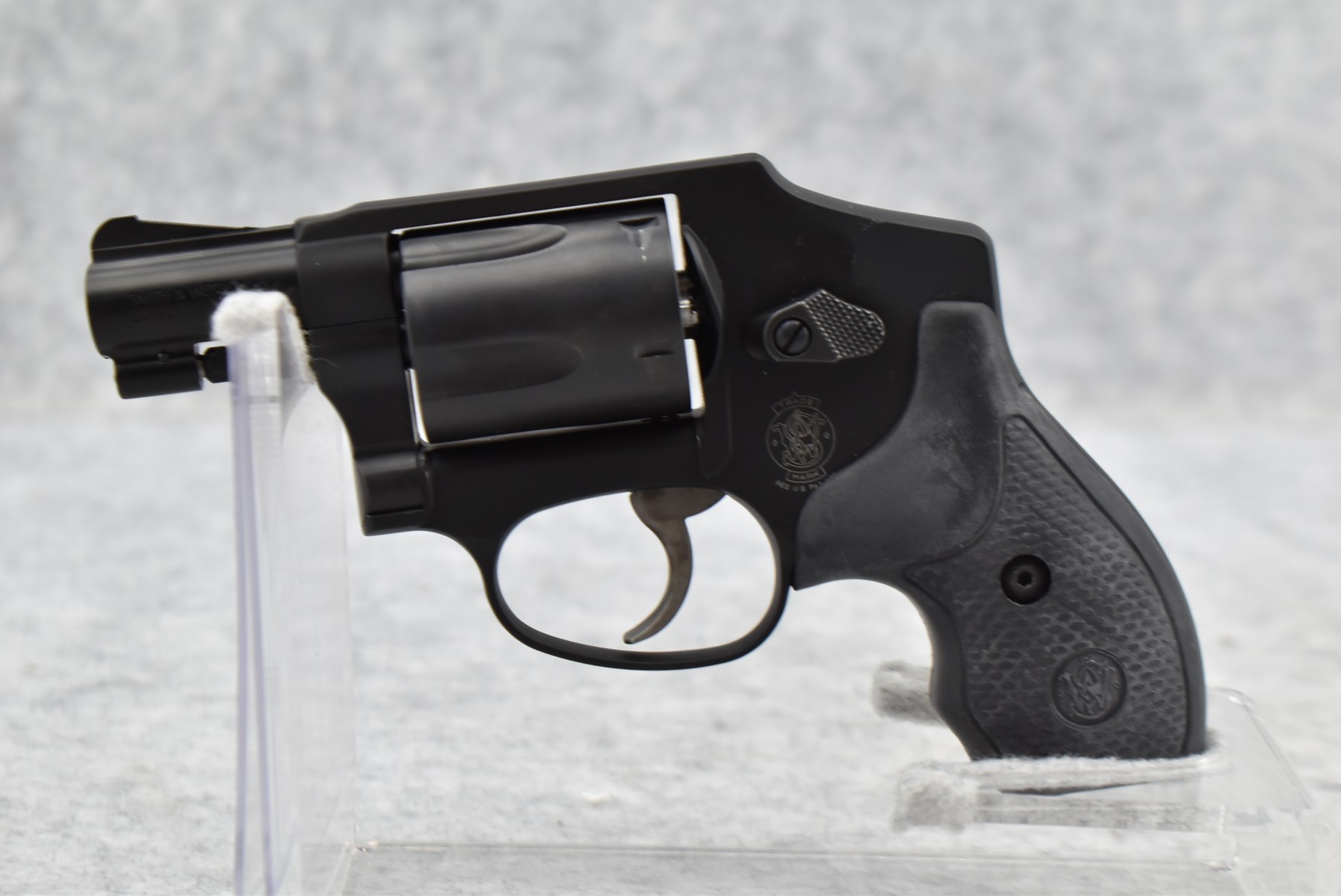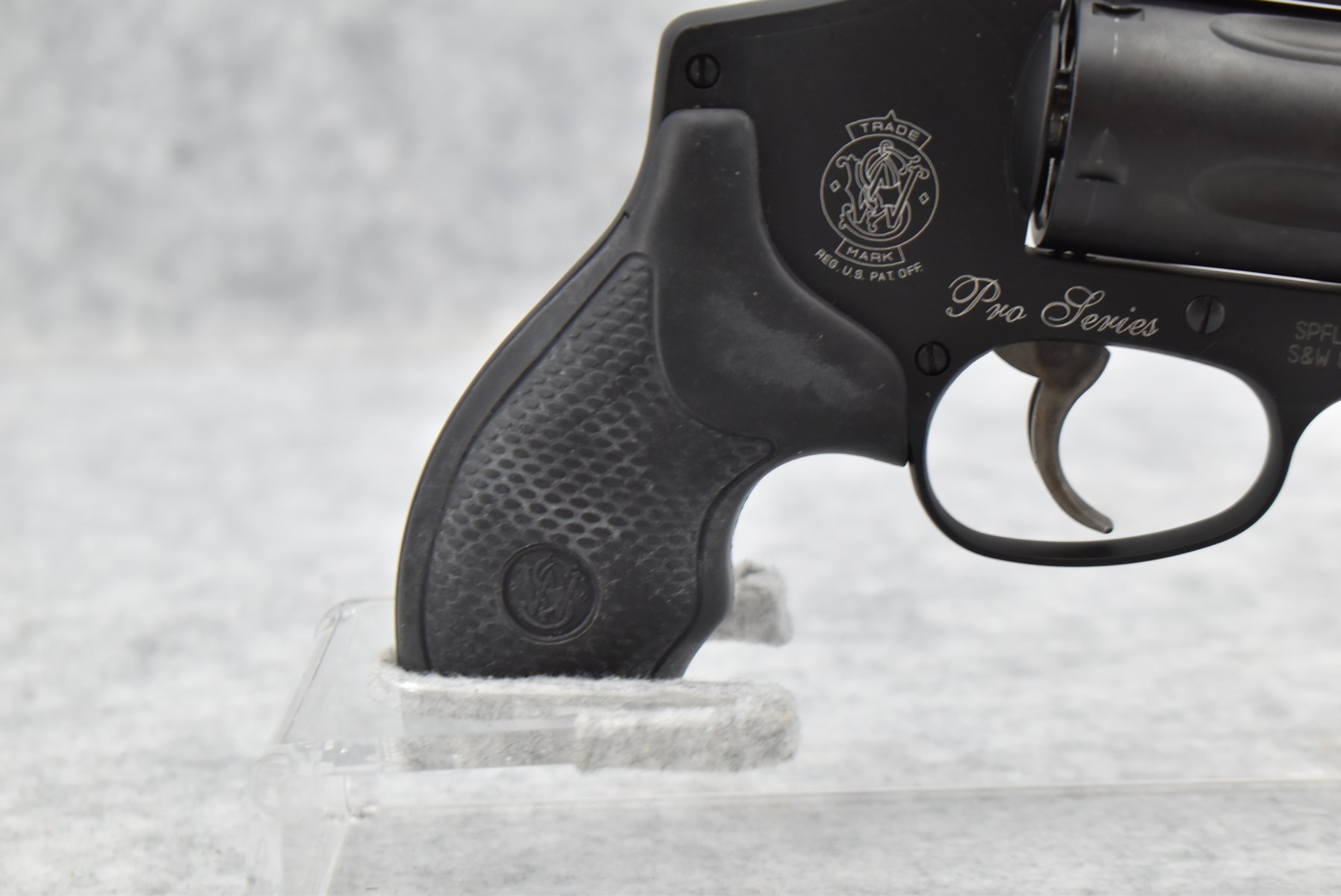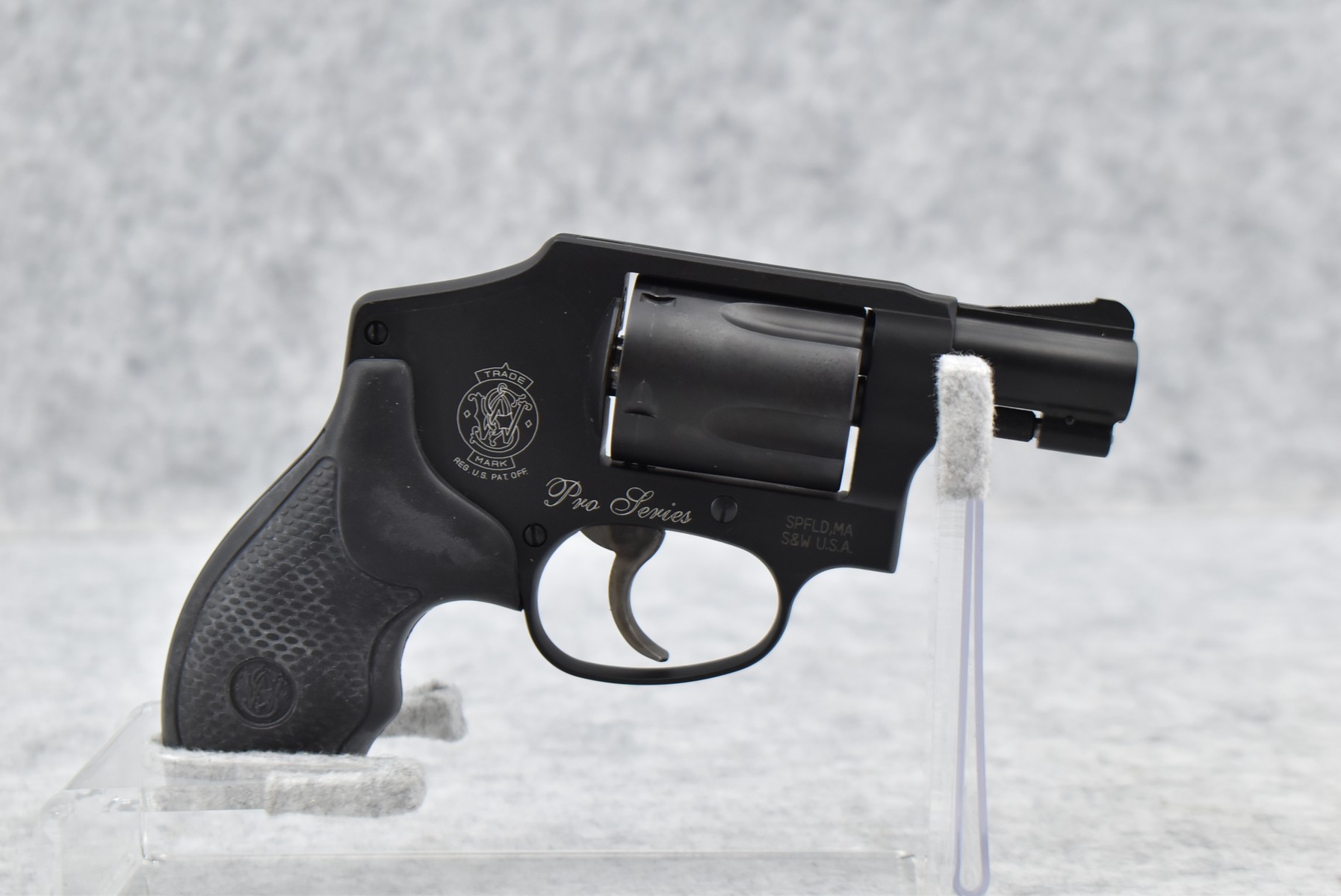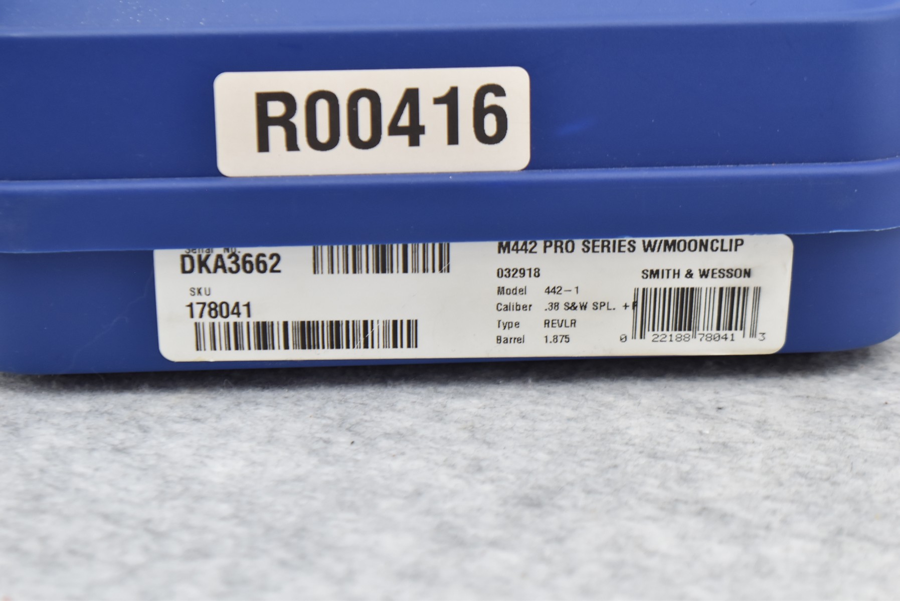 99R. Smith & Wesson – Mod. 442-1 Pro Series – 38 Spl. & P Cal. Hammerless Double Action Revolver – w/1.875” Barrel w/Front Blade Sight – Matte Black Finish – w/Factory Grips – Unfired w/Factory Hard Case, Moon Clips, Manual, and Lock
