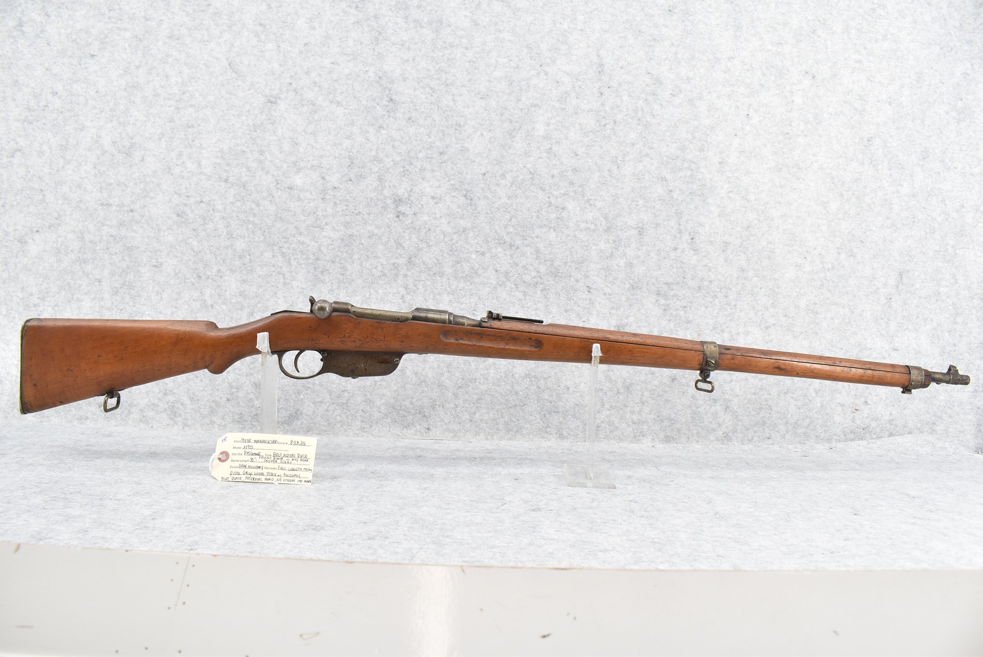 9R. Steyr-Mannlicher – Mod. M95 – 8x56mmR Cal. Bolt Action Rifle – w/30” Barrel w/Front Blade & Adj. Rear Ladder Sights – Gray/Military Finish – w/Pistol Grip Full Length Wood Military Stock w/Factory Butt Plate – w/Internal Mag