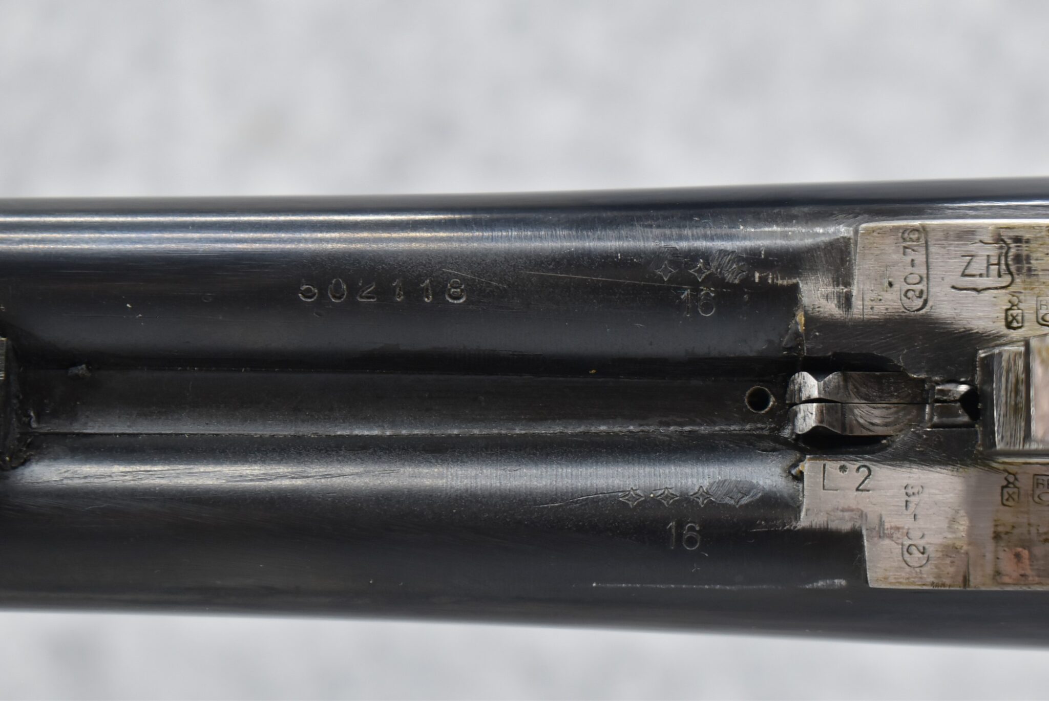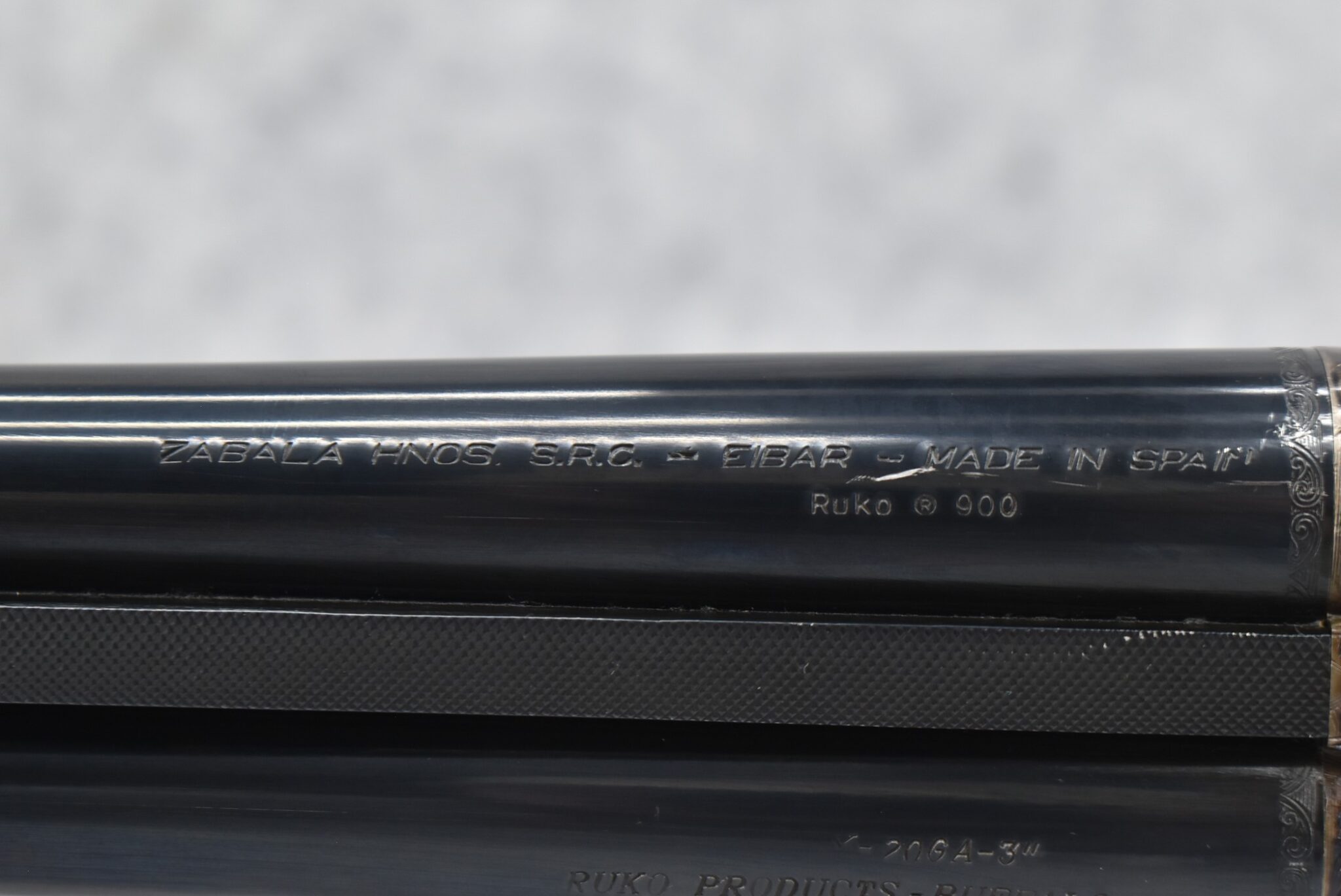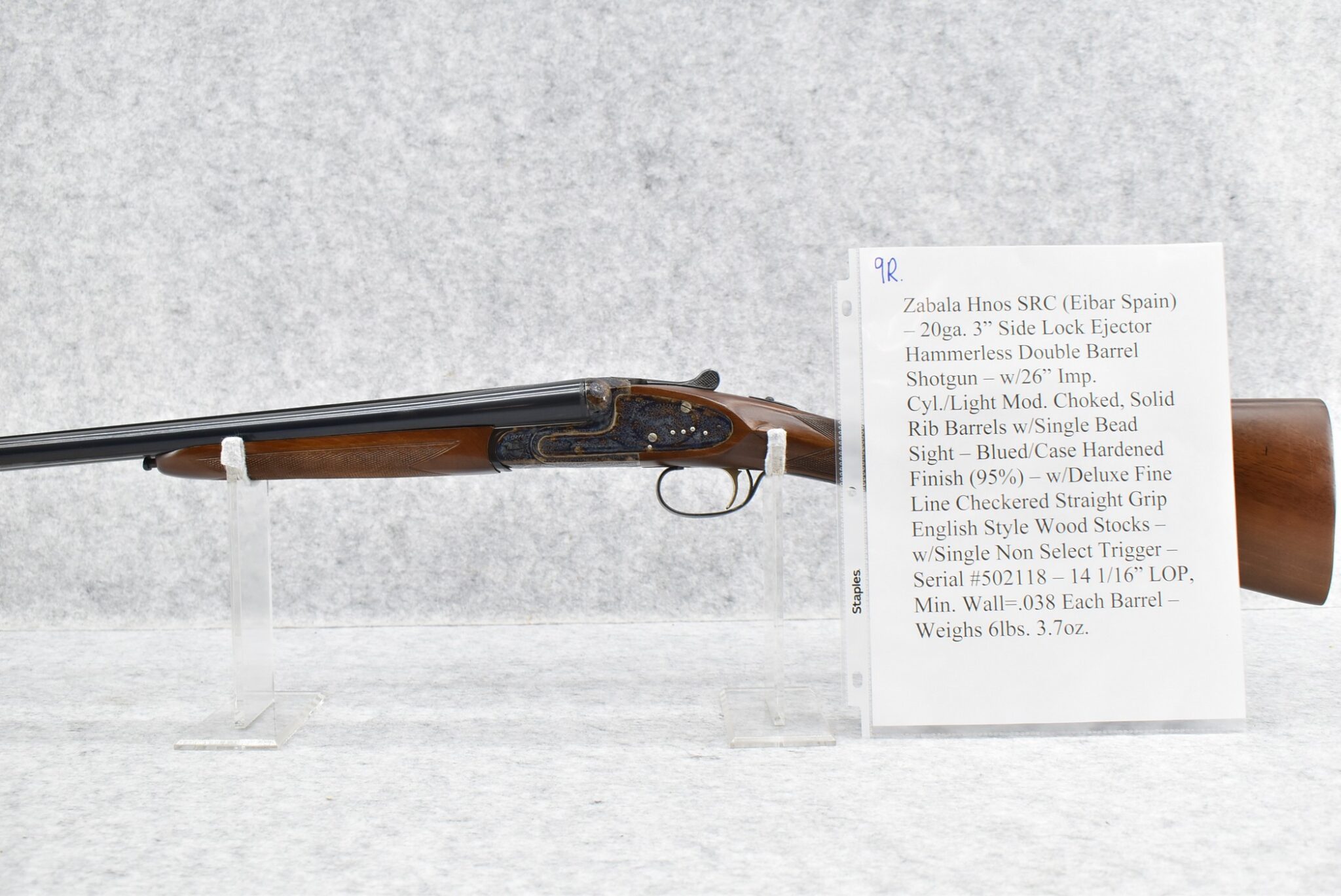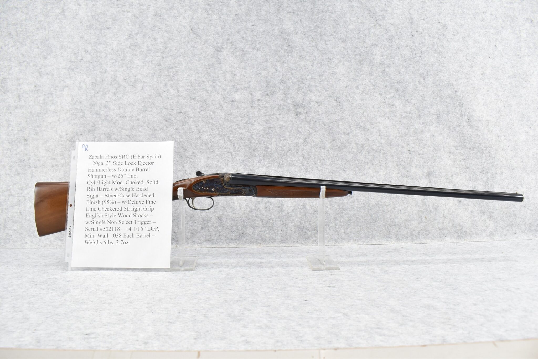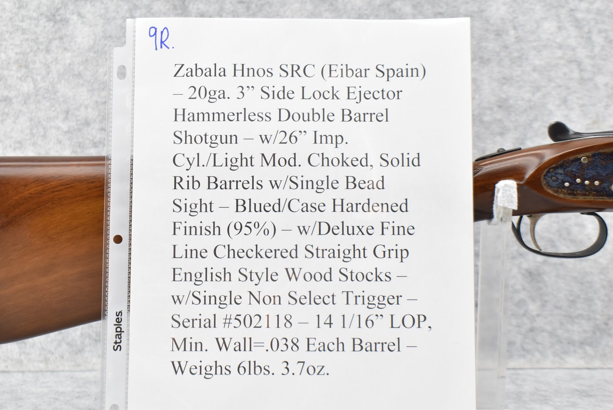9R. Zabala Hnos SRC (Eibar Spain) – 20ga. 3” Side Lock Ejector Hammerless Double Barrel Shotgun – w/26” Imp. Cyl./Light Mod. Choked, Solid Rib Barrels w/Single Bead Sight – Blued/Case Hardened Finish (95%) – w/Deluxe Fine Line Checkered Straight Grip English Style Wood Stocks – w/Single Non Select Trigger – Serial #502118 – 14 1/16” LOP, Min. Wall .038 Each Barrel – Weighs 6lbs. 3.7oz.