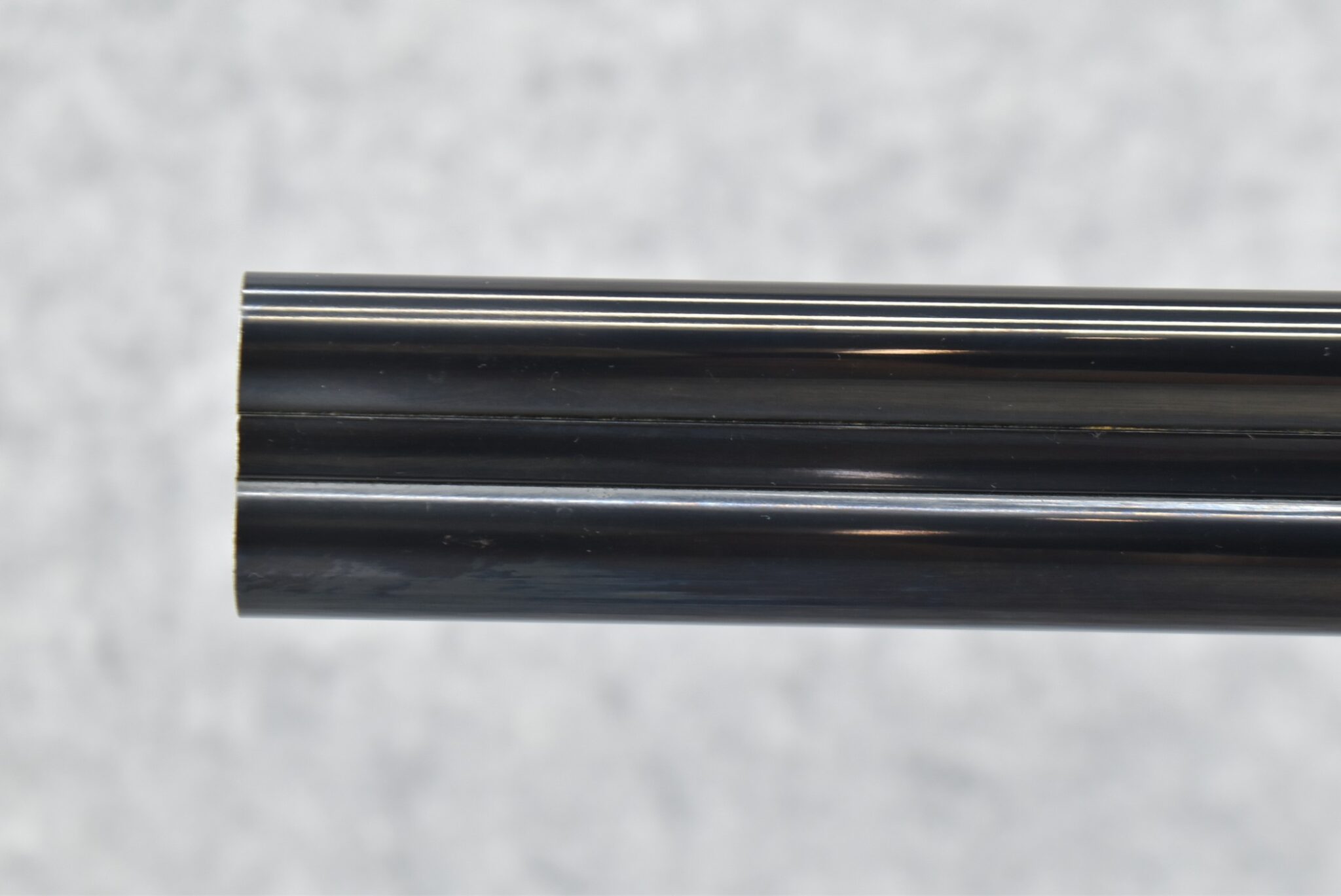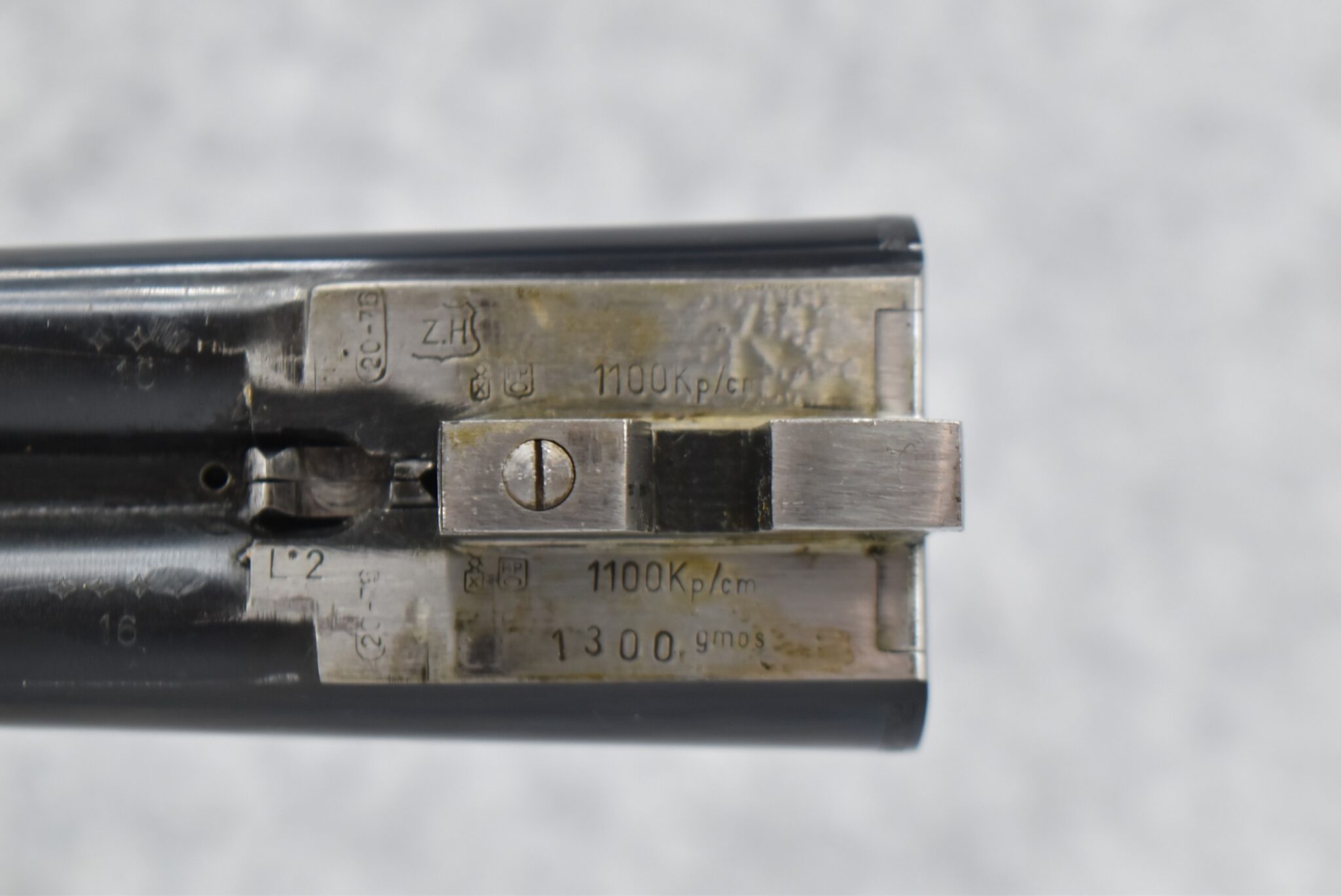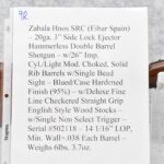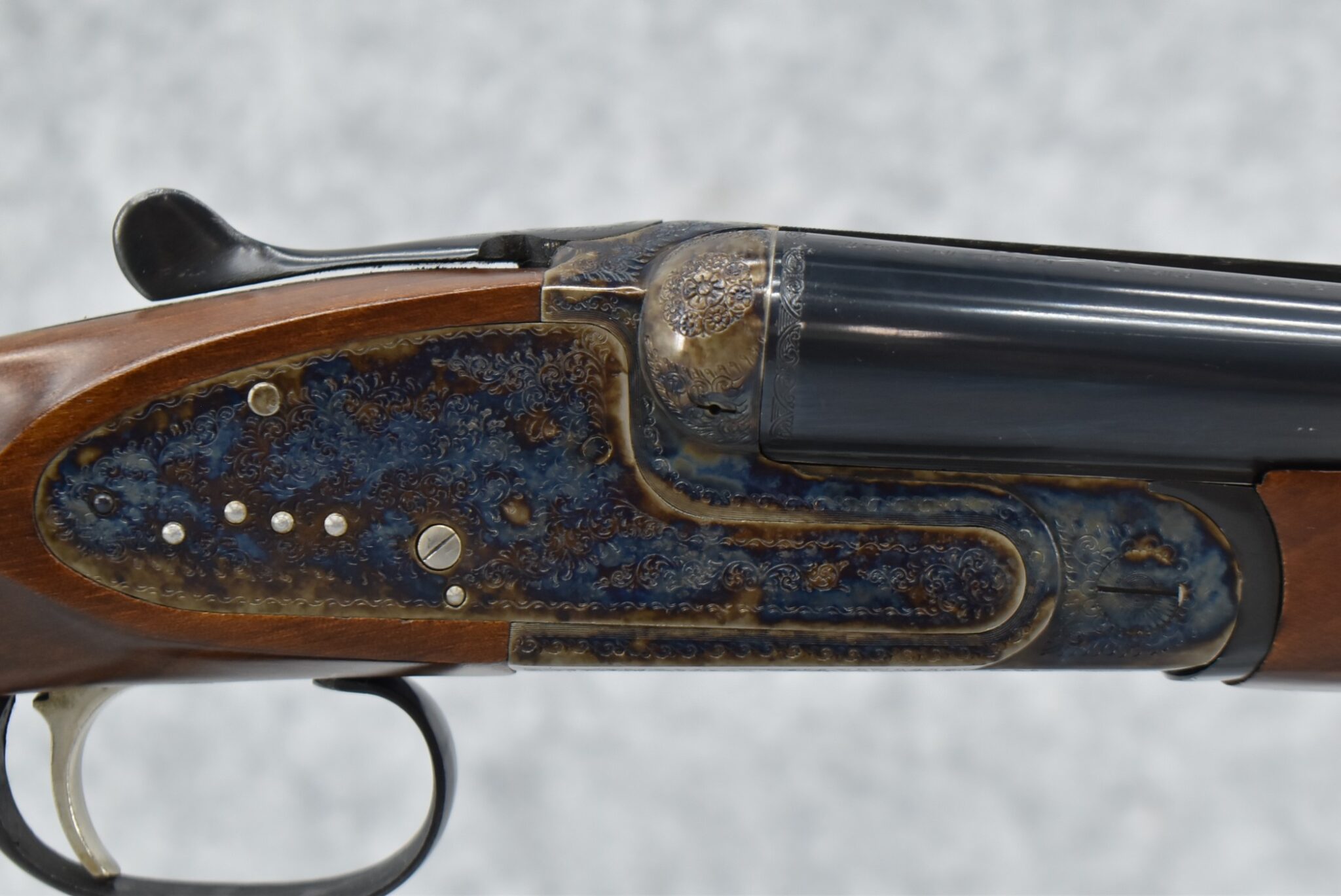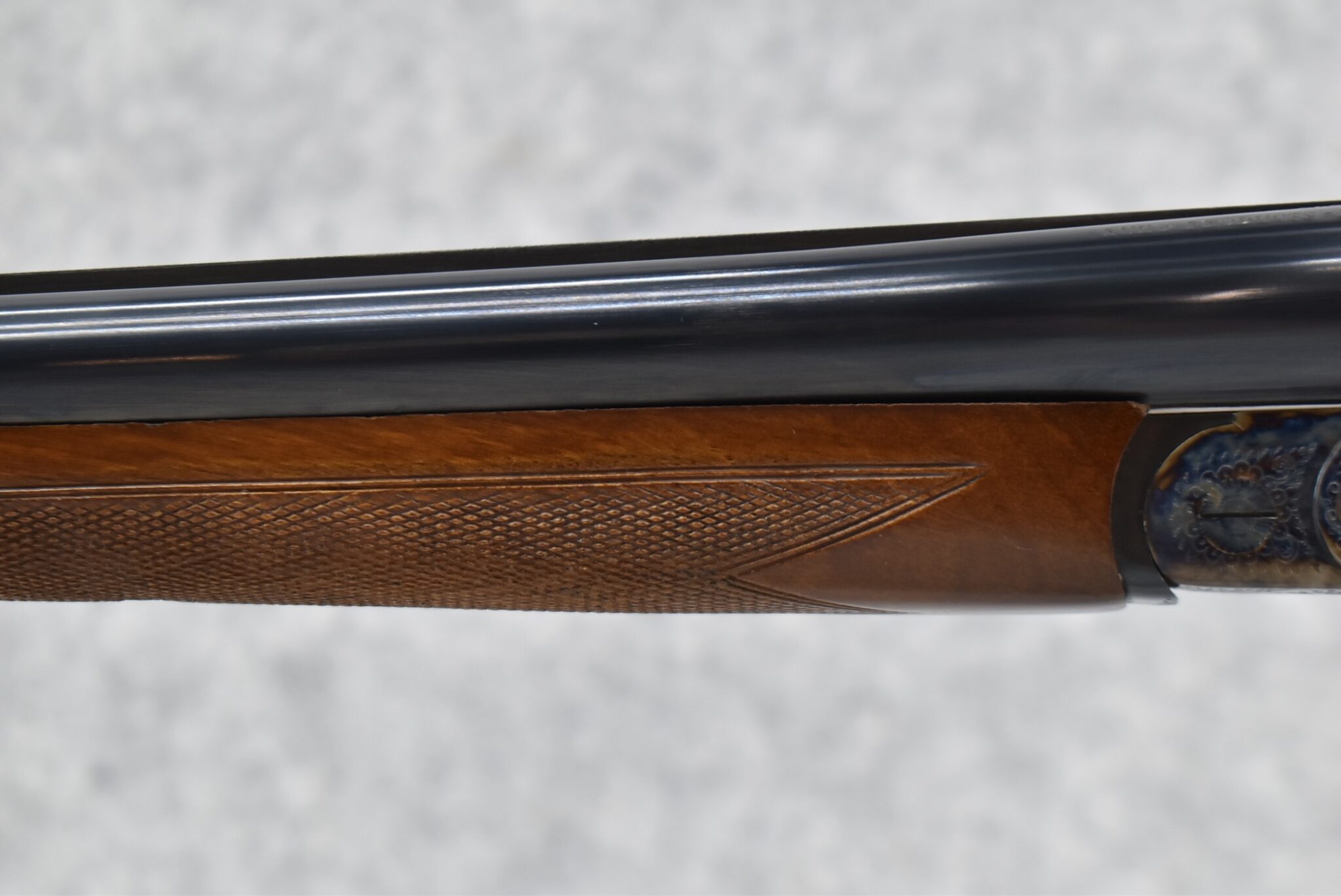 9R. Zabala Hnos SRC (Eibar Spain) – 20ga. 3” Side Lock Ejector Hammerless Double Barrel Shotgun – w/26” Imp. Cyl./Light Mod. Choked, Solid Rib Barrels w/Single Bead Sight – Blued/Case Hardened Finish (95%) – w/Deluxe Fine Line Checkered Straight Grip English Style Wood Stocks – w/Single Non Select Trigger – Serial #502118 – 14 1/16” LOP, Min. Wall .038 Each Barrel – Weighs 6lbs. 3.7oz.