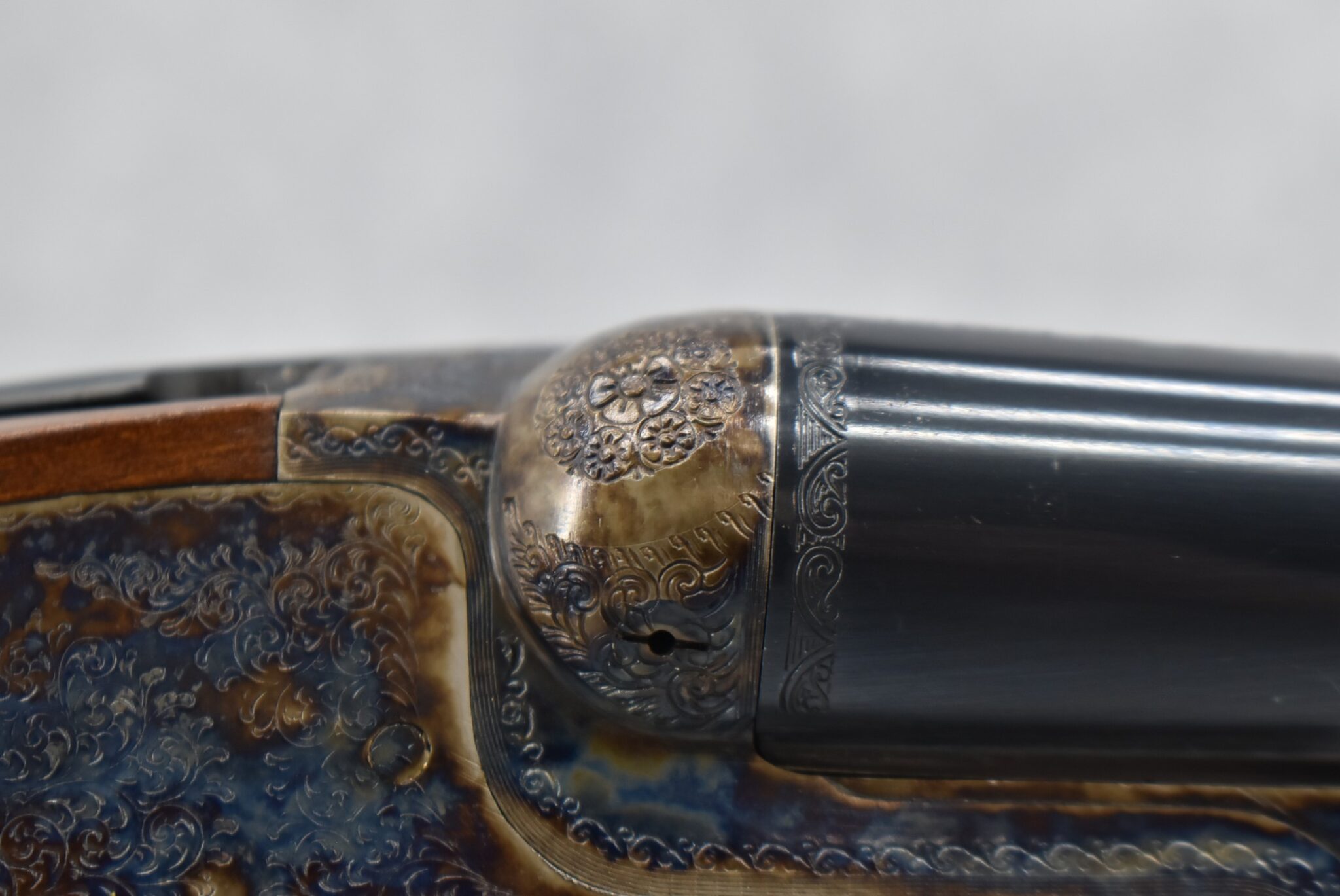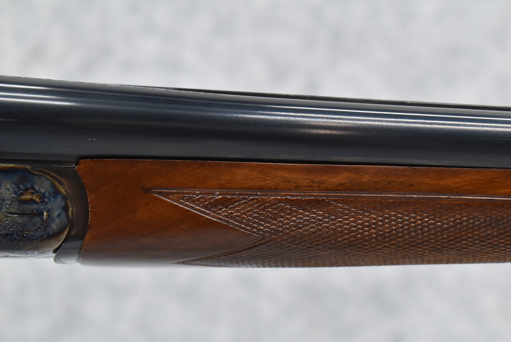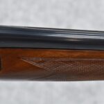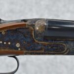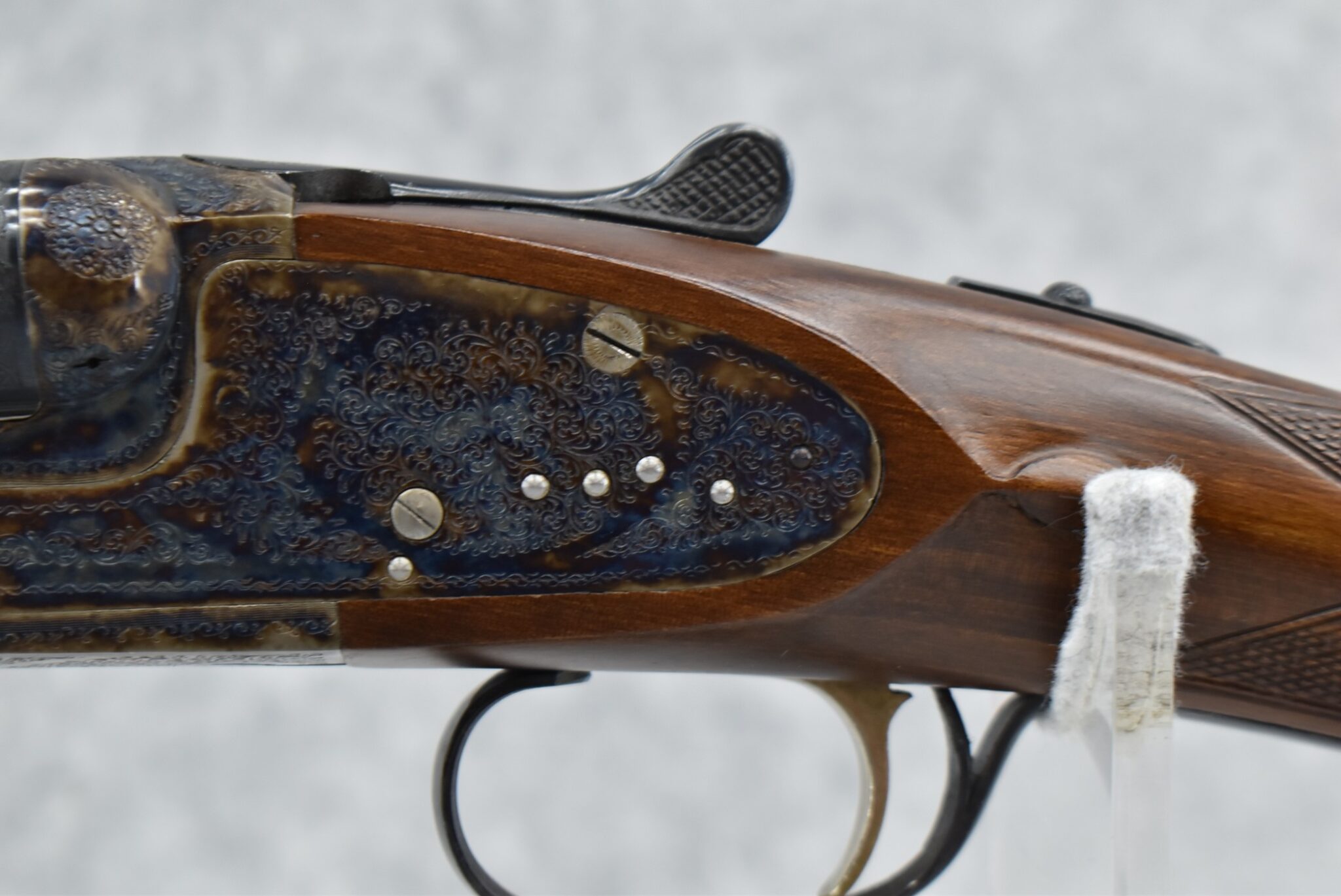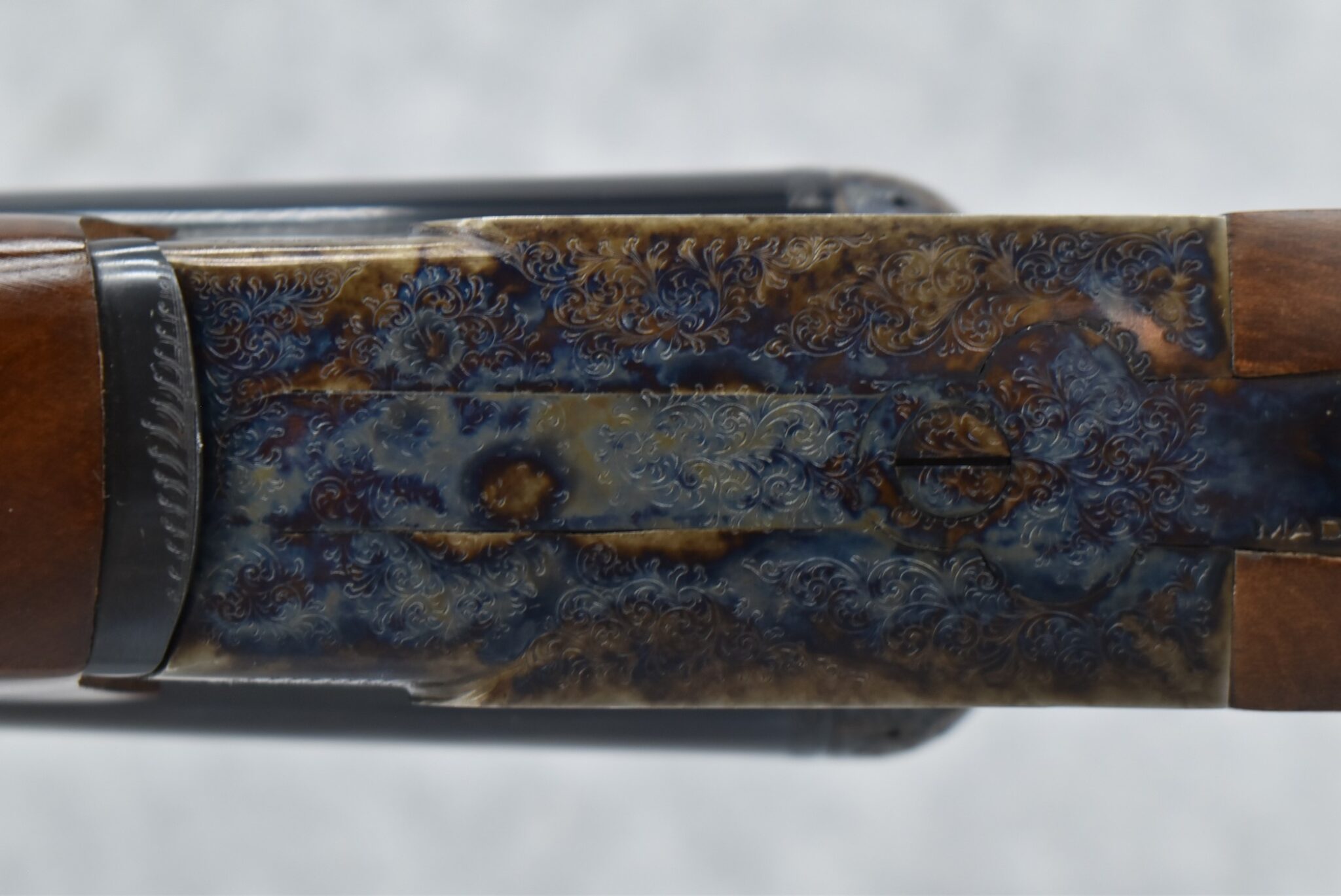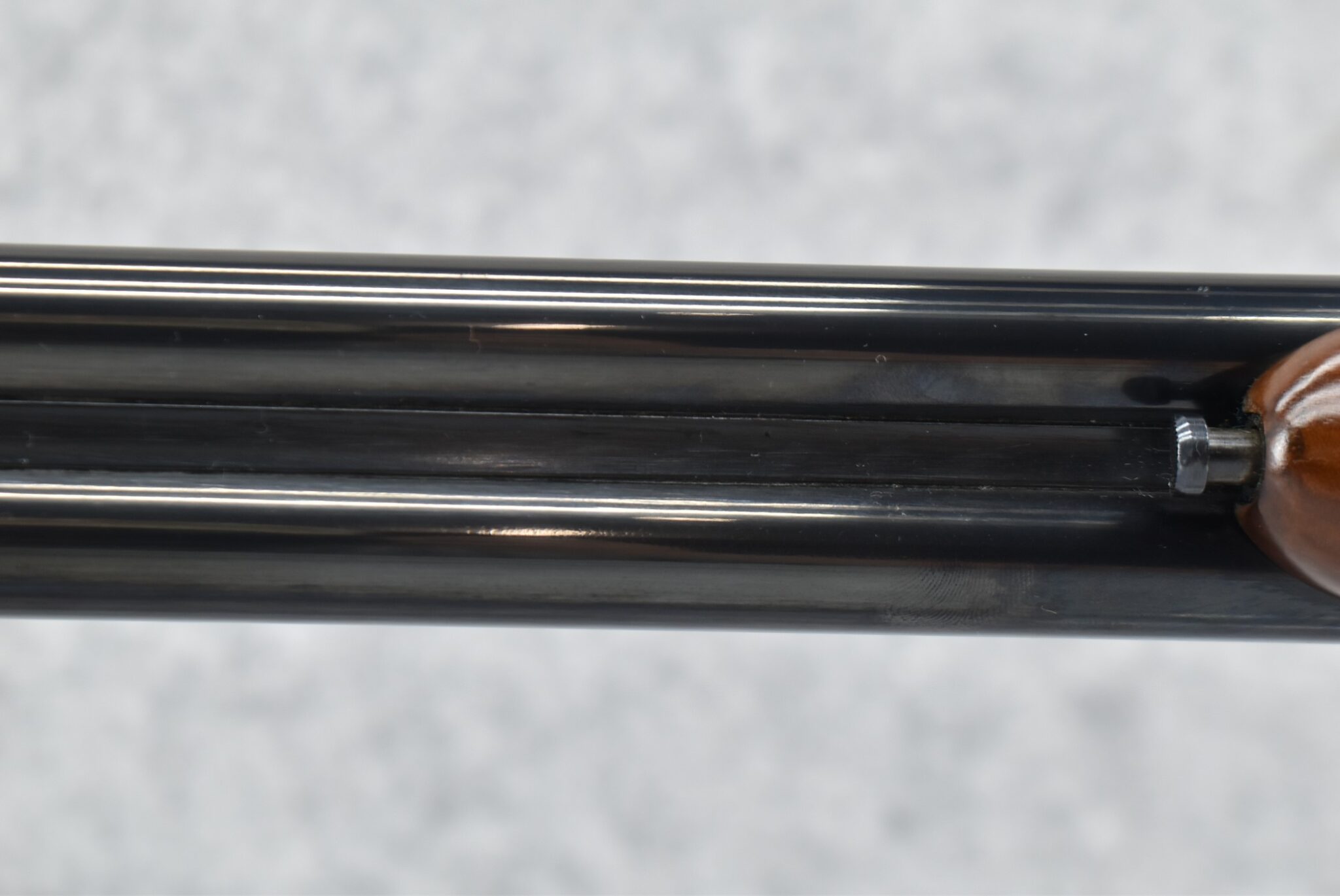 9R. Zabala Hnos SRC (Eibar Spain) – 20ga. 3” Side Lock Ejector Hammerless Double Barrel Shotgun – w/26” Imp. Cyl./Light Mod. Choked, Solid Rib Barrels w/Single Bead Sight – Blued/Case Hardened Finish (95%) – w/Deluxe Fine Line Checkered Straight Grip English Style Wood Stocks – w/Single Non Select Trigger – Serial #502118 – 14 1/16” LOP, Min. Wall .038 Each Barrel – Weighs 6lbs. 3.7oz.