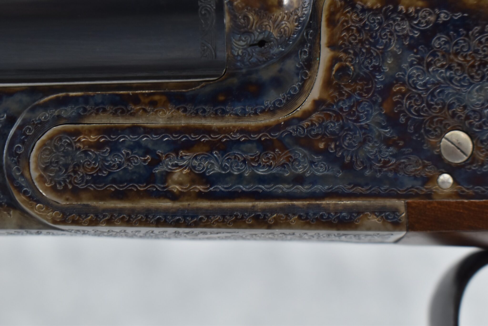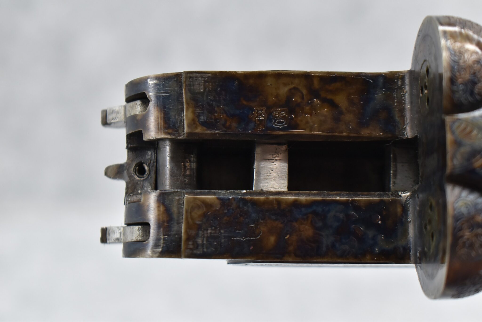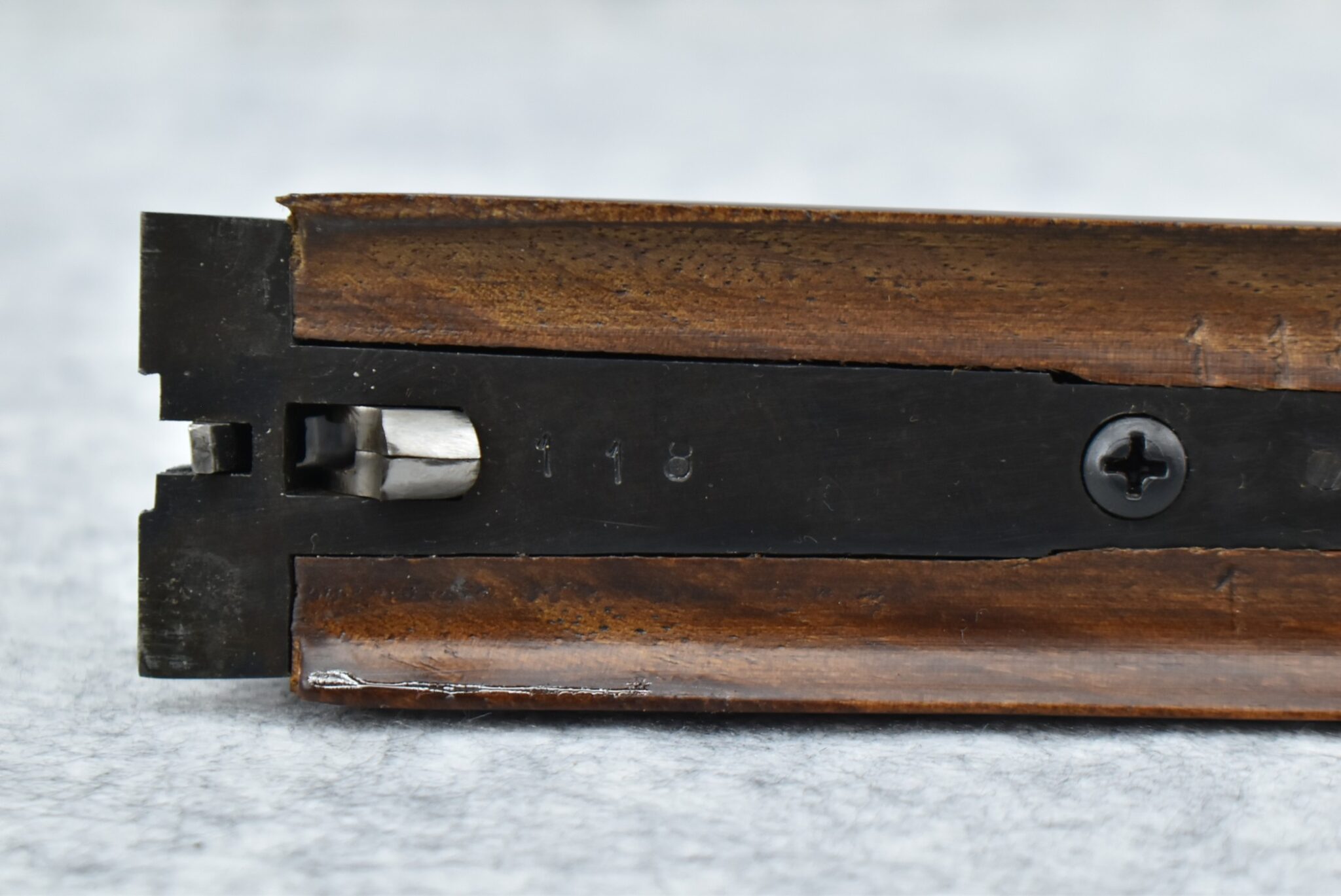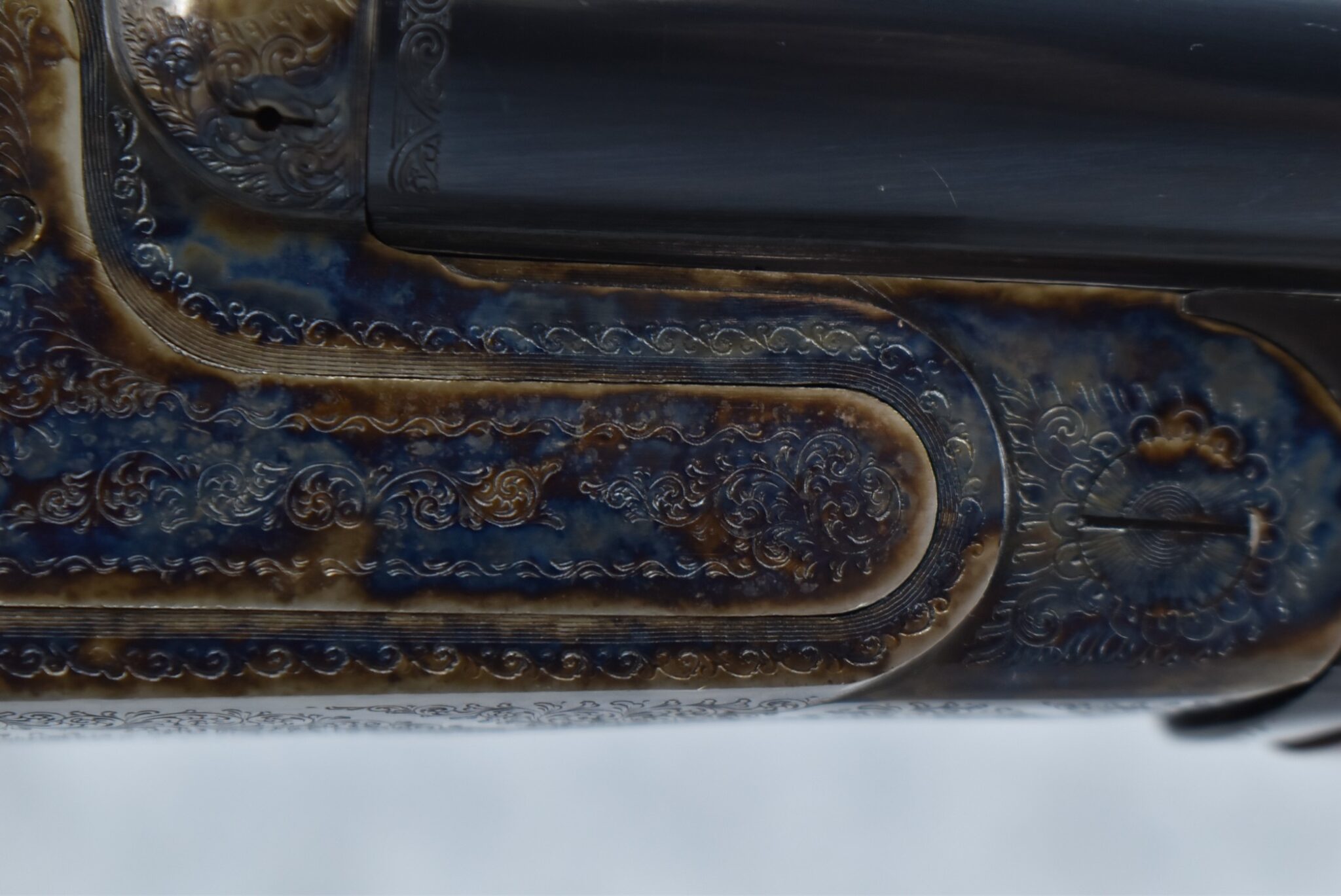 9R. Zabala Hnos SRC (Eibar Spain) – 20ga. 3” Side Lock Ejector Hammerless Double Barrel Shotgun – w/26” Imp. Cyl./Light Mod. Choked, Solid Rib Barrels w/Single Bead Sight – Blued/Case Hardened Finish (95%) – w/Deluxe Fine Line Checkered Straight Grip English Style Wood Stocks – w/Single Non Select Trigger – Serial #502118 – 14 1/16” LOP, Min. Wall .038 Each Barrel – Weighs 6lbs. 3.7oz.