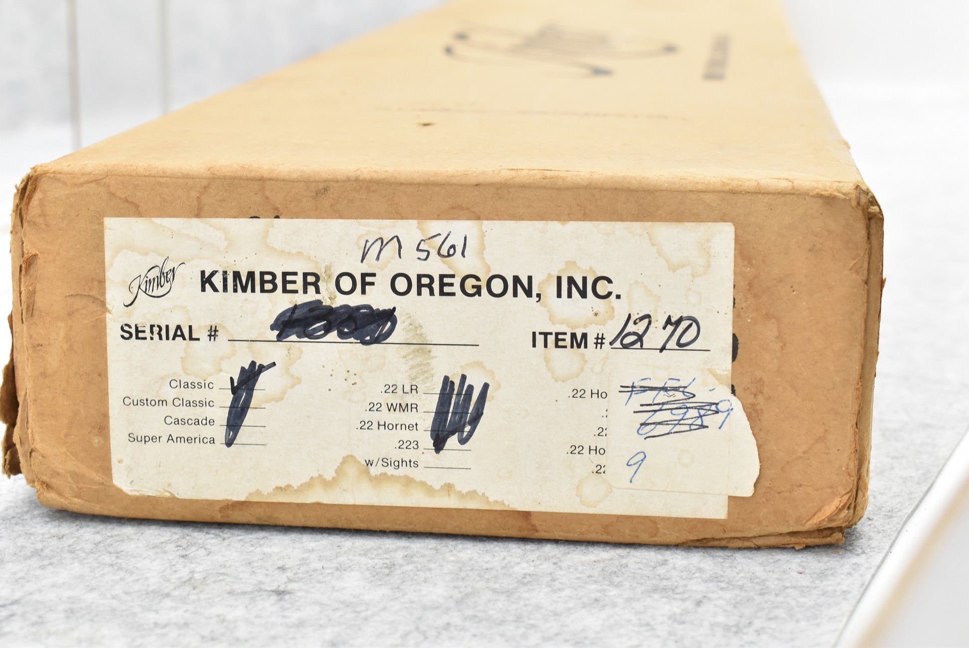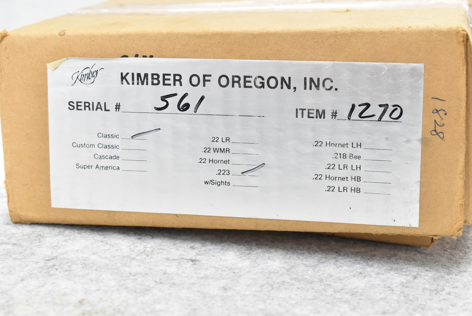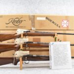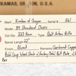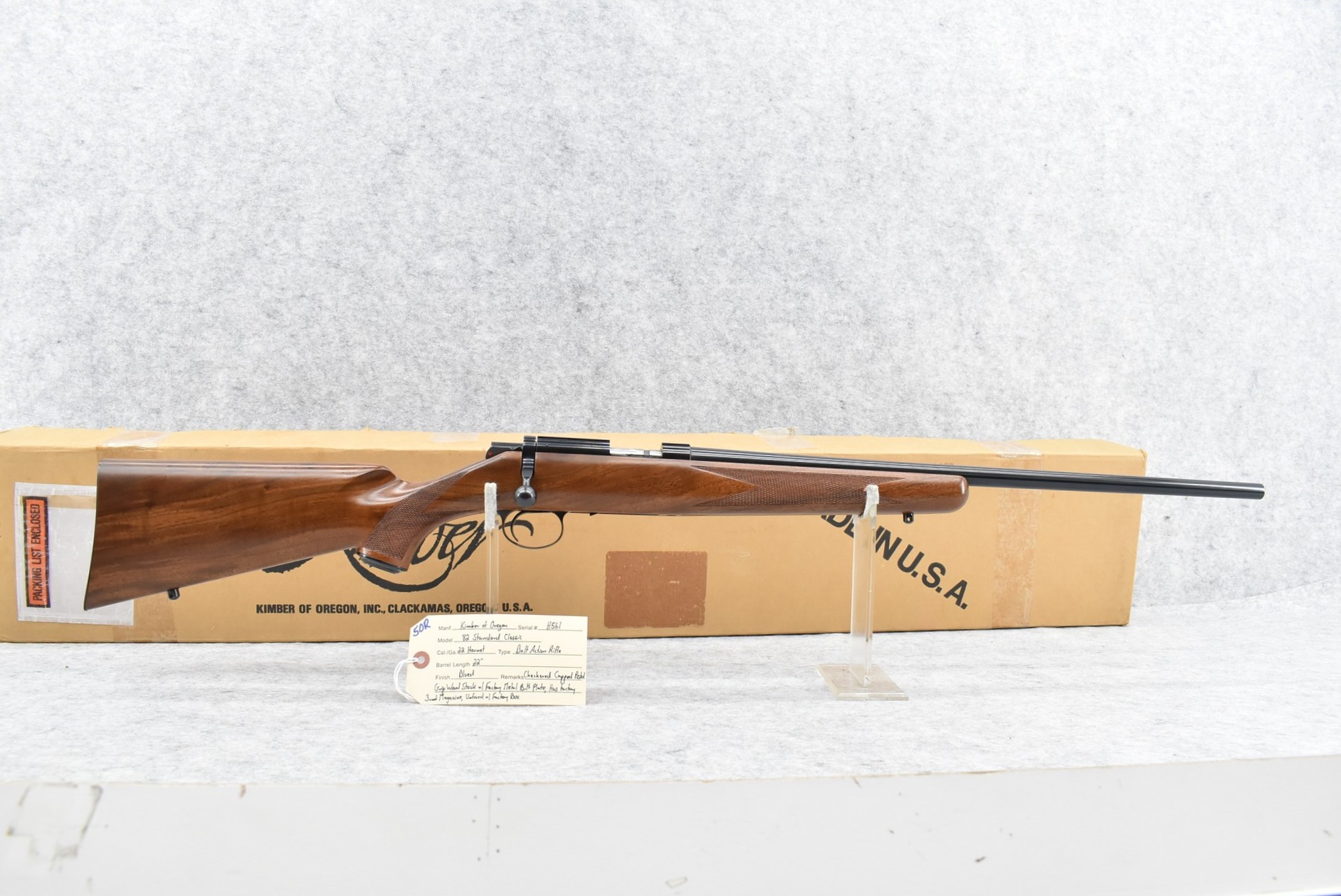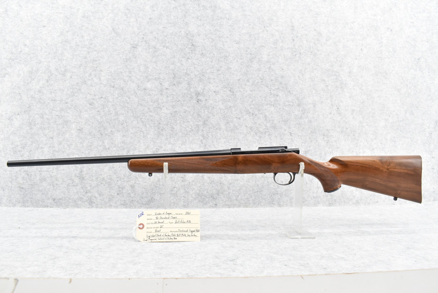 50R. Here is a Rare! Opportunity to Own a Matching Serial Number Set of 3 Kimber of Oregon 84 & 82 Classic’s! These Three Rifles Are Chambered in 223 Rem., 22 Hornet & 22 Win. Mag. Cals. All Are Serial Number 561!! It is Very Seldom a Matching Number Set of 3 Kimber 84/82’s Come Available! This Would be a Great Set to be the Focal Point of Anyone’s Collection!! 1st is: Mod. 84 Standard Classic – 223 Rem. Cal. Bolt Action Rifle – w/22” Barrel – Blued Finish – w/Checkered Capped Pistol Grip Wood Stock w/Factory Metal Butt Plate – As New w/Factory Box – Serial #561 – 2nd is: Mod. 82 Standard Classic – 22 Hornet Cal. Bolt Action Rifle – w/22” Barrel – Blued Finish – w/Checkered Capped Pistol Grip Wood Stock w/Factory Metal Butt Plate – w/Factory 3 Round Magazine – Unfired w/Factory Box – Serial #H561 – 3rd is: Mod. 82 Standard Classic – 22 W.M.R. (22 Win. Mag.) Cal. Bolt Action Rifle – w/22” Barrel – Blued Finish – w/Checkered Capped Pistol Grip Wood Stock w/Factory Metal Butt Plate – w/Factory 4 Round Magazine – Unfired w/Factory Box – Serial #M561