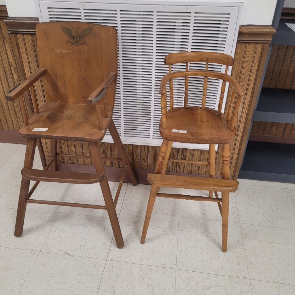 Furniture: Wooden Childs Highchairs, Various Shelving, Coffee Table, Various End Stands, Childs Desks, Chest of Drawers, Dough Tray, Large Kettle, Wooden Bench, and Other