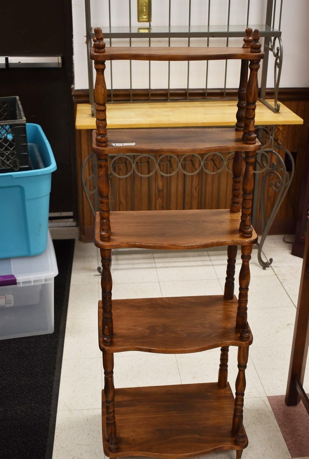 Furniture: Various Shelves and Stands, End Tables, Desk, Corner China Cabinet, Corner Electric Fireplace, Slaw Board Stand, Colorful Wicker Chairs, Wicker Stands, Wooden Bench, Singer Sewing Machine on Singer Stand, Very Nice Outdoor Settee, Chest of Drawers, Lingerie Cabinet, Metal Storage Cabinets, Drop Leaf Tables, and Other