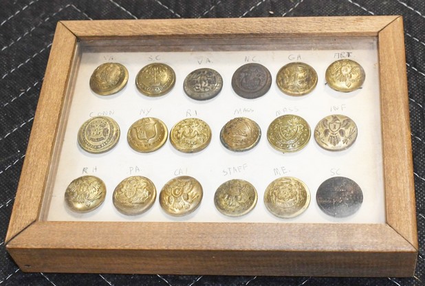 Gun and Fishing Related: Large Amount of Folding, Pen, and Sheath Knives, Butcher Knives, Hand Trap, Belt Buckles, Scopes and Optics, Animal Traps, Civil War Relic Bullets, Military Buttons, and Other