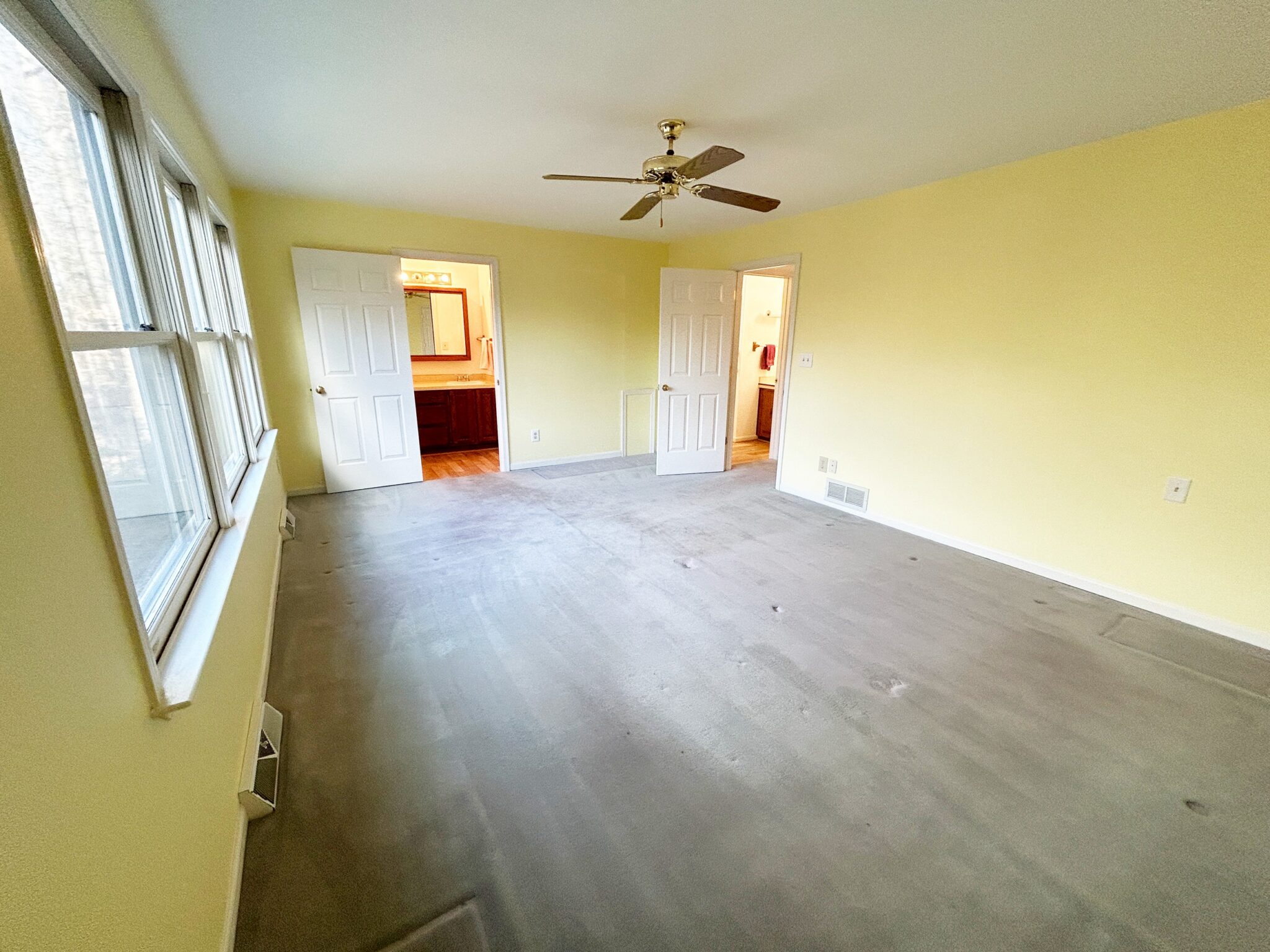 - Primary Bedroom: 18’x13’ – Carpet Flooring, Windows, 2 Closets, Ceiling Fan, Access to Primary Bath.