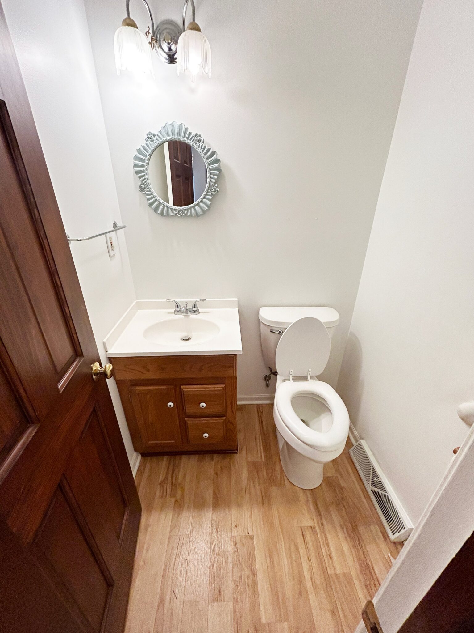 - Half Bath: 5’x5’ – Laminate Flooring, Single Sink Vanity, Toilet.