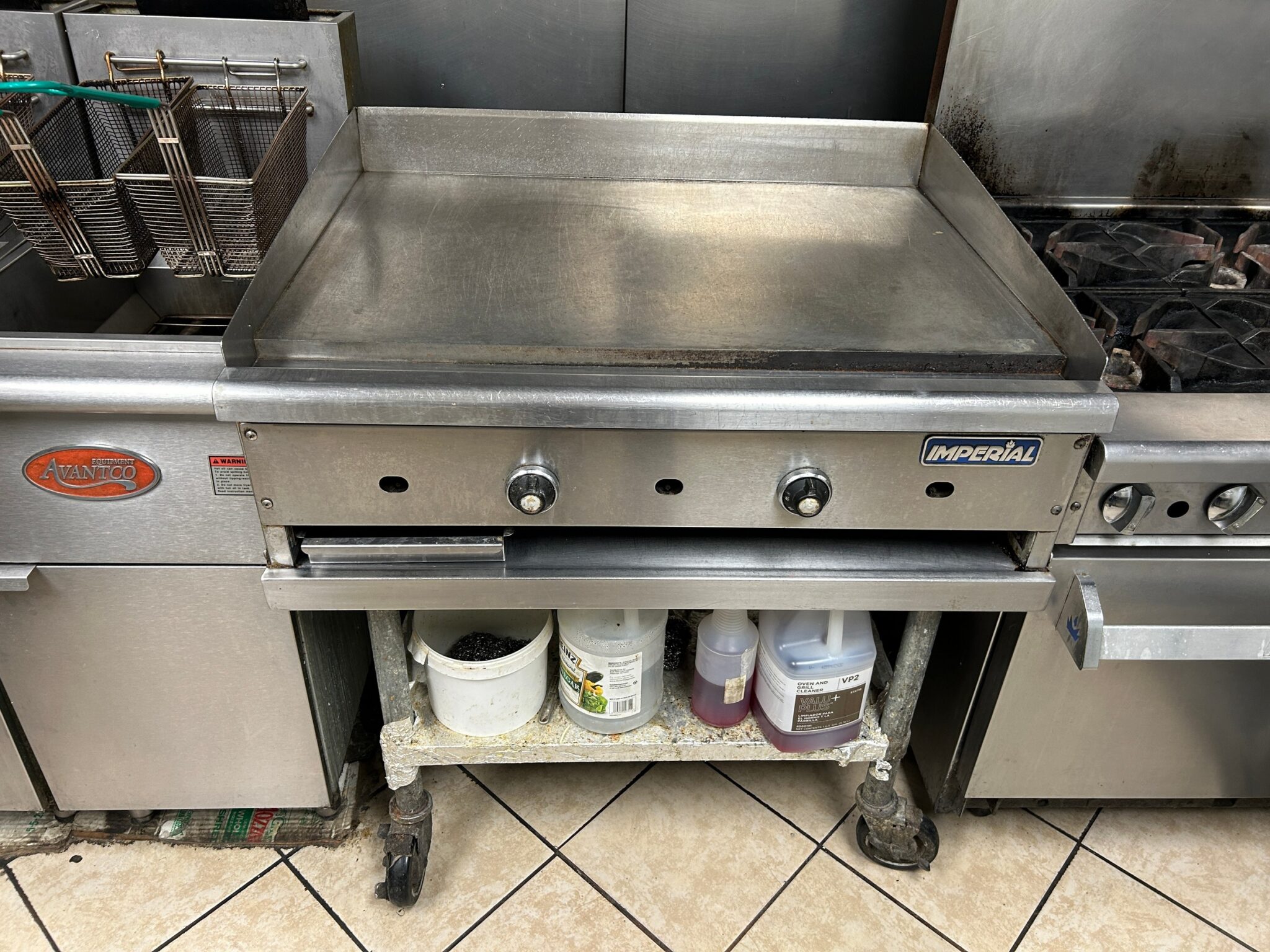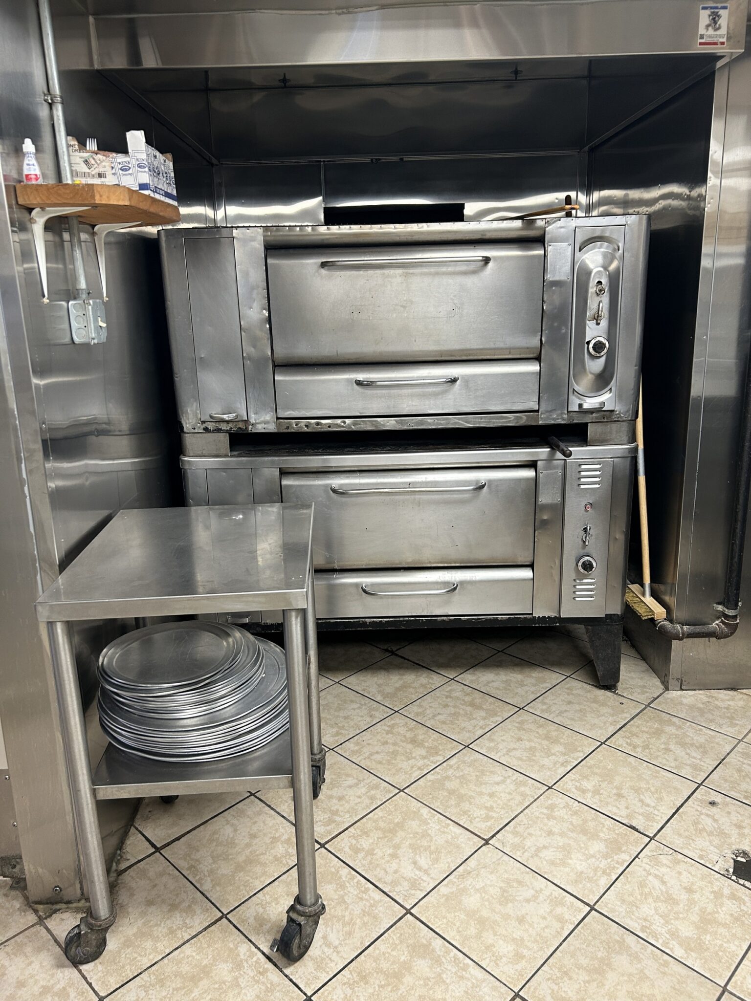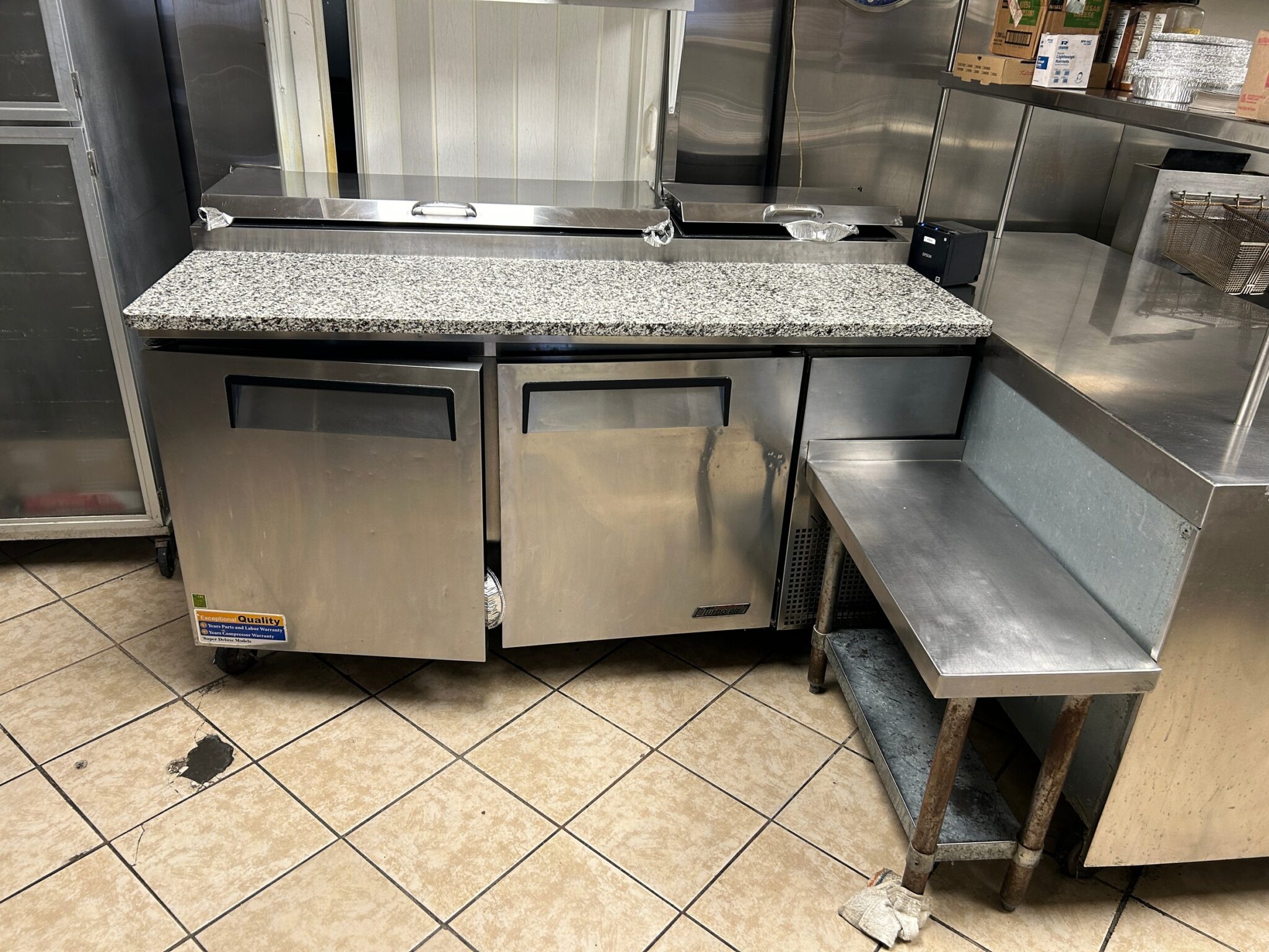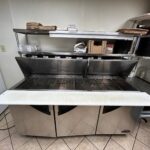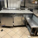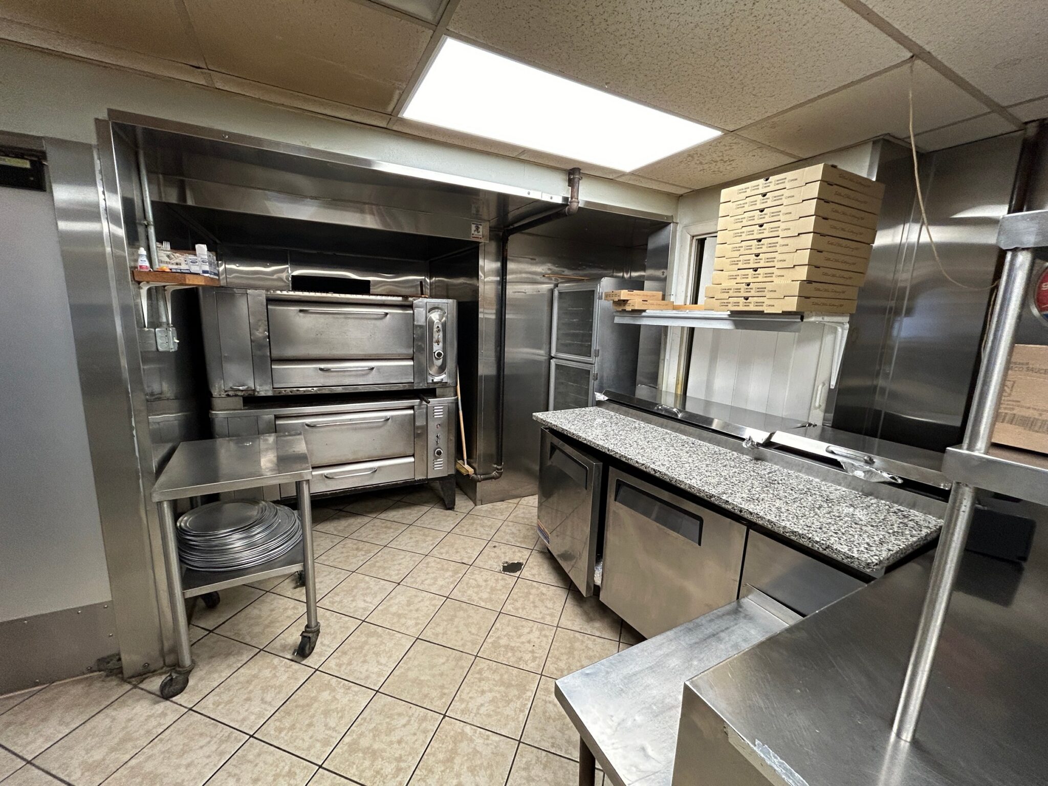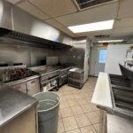 - Kitchen: 30’x12’ – Tile Flooring, 2 Door Pizza Oven, Turbo Air Refrigerator, with Granite Countertop as a Prep Station, (2) Avantco Deep Fryers, Imperial Stainless-Steel Griddle, 6 Burner Imperial Stove, Larkin Hood Vent with Fire Suppression System, Turbo Air Cooler, Multiple Stainless-Steel Tables, Media Up-right Freezer.