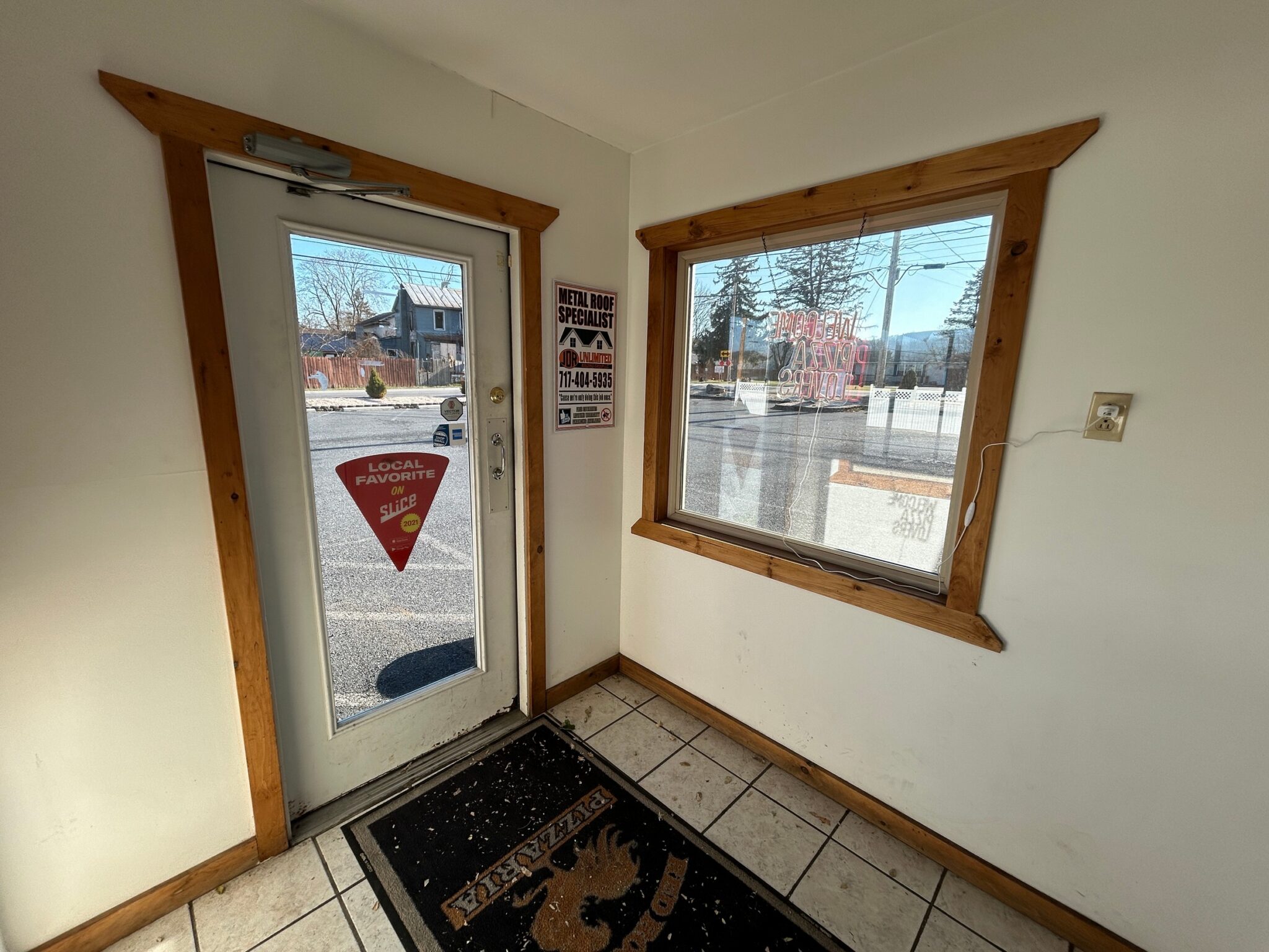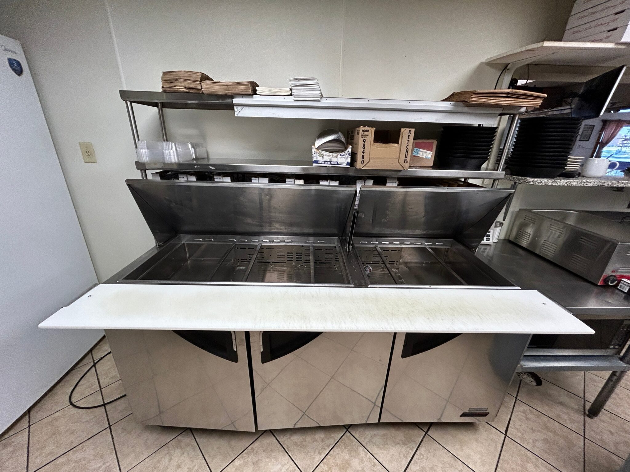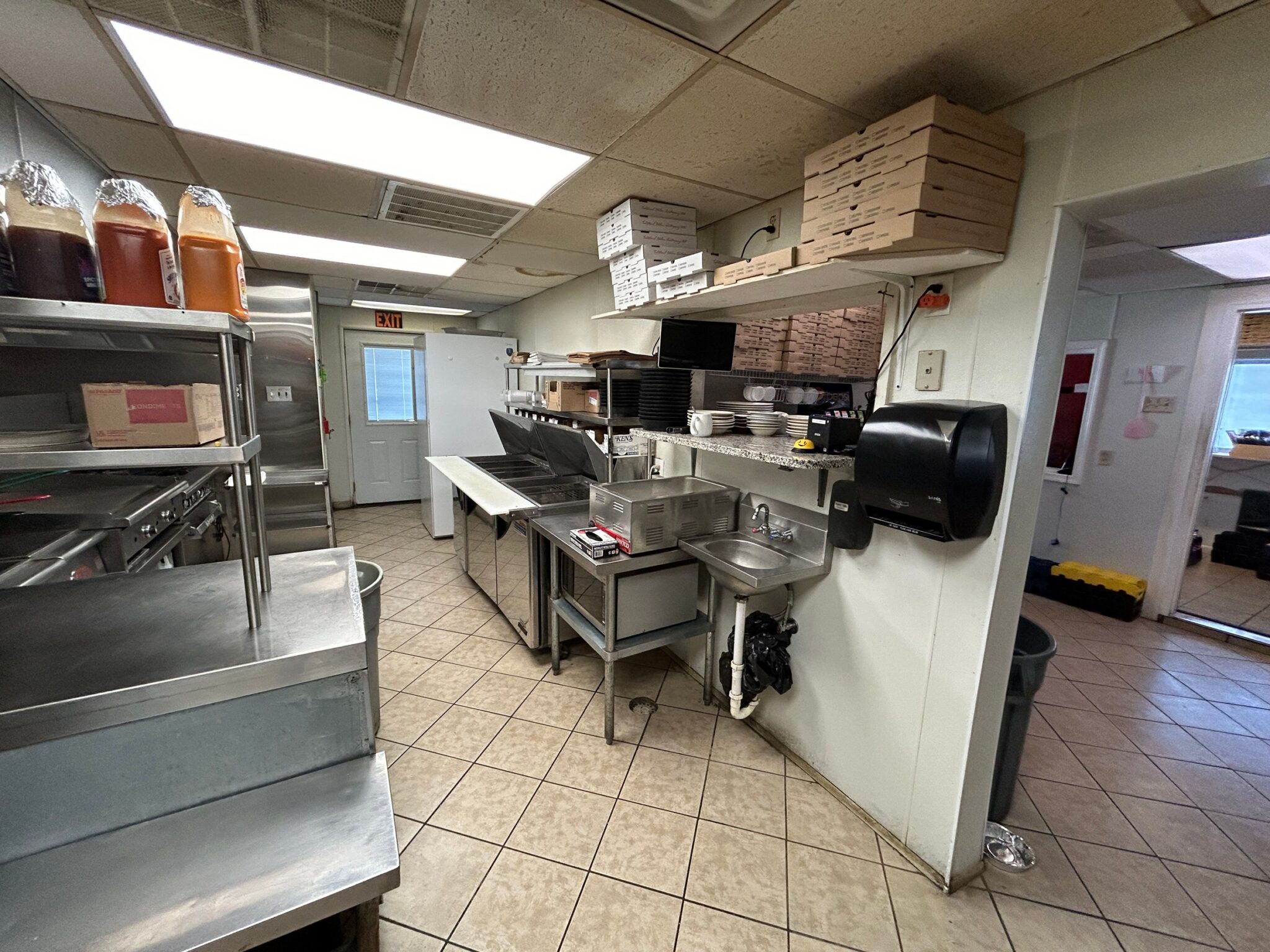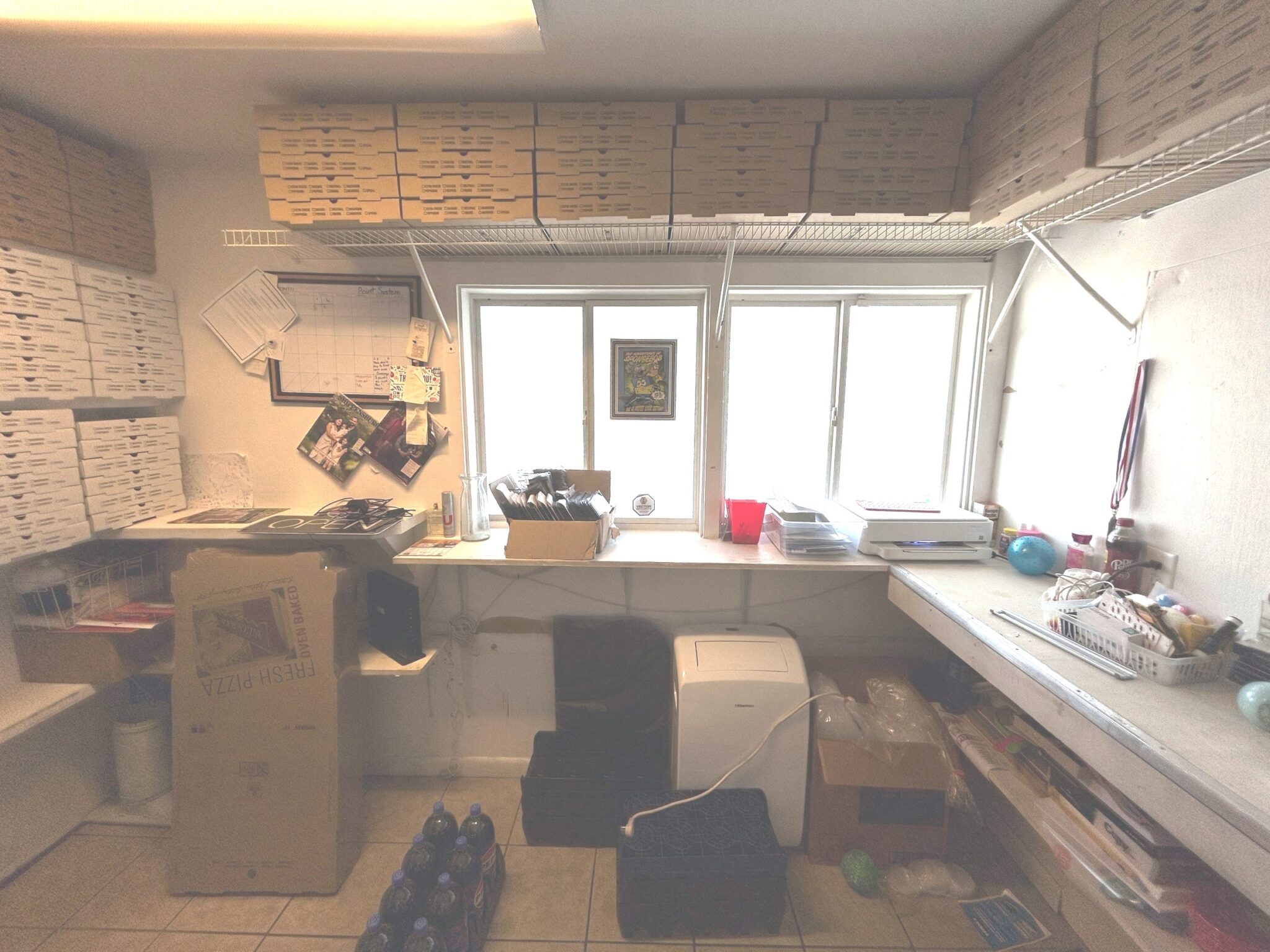 - Office/Storage Room: 11’x7’ – Tile Flooring, Pick-up Window, Built in Shelving, GW Security Camera System, Freezer, Pizza Boxes!!