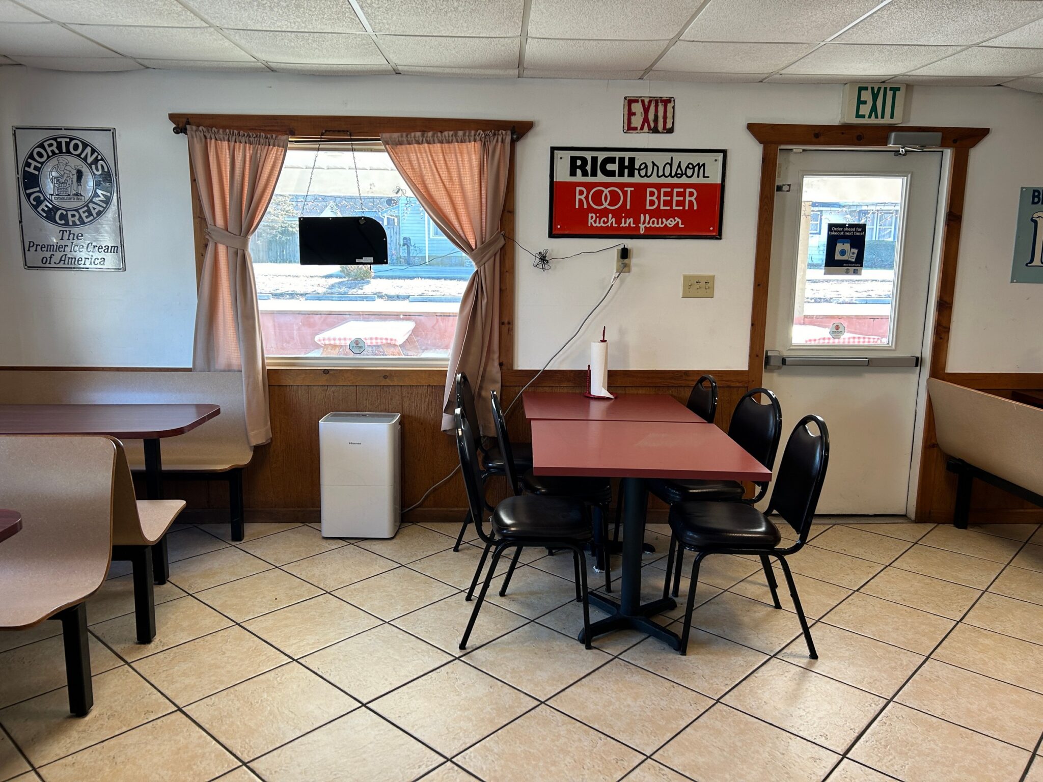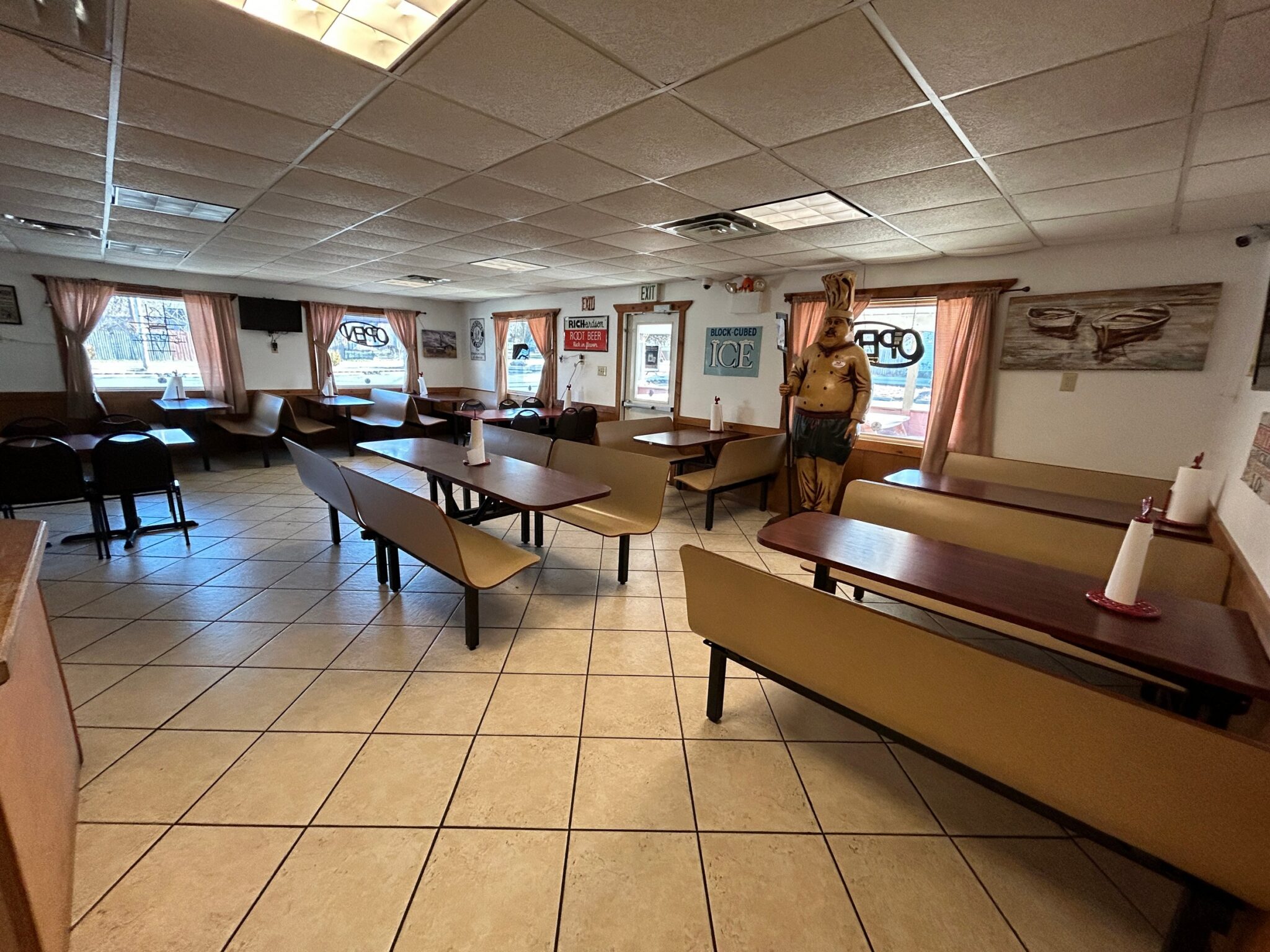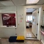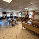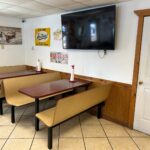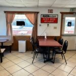 - Dining Area: 30’x20’ – Tile Flooring, (8) Booths, (2) Tables with Chairs, Large Windows, Entrance to front Patio, Restrooms, Service Counter and Side Entrance.